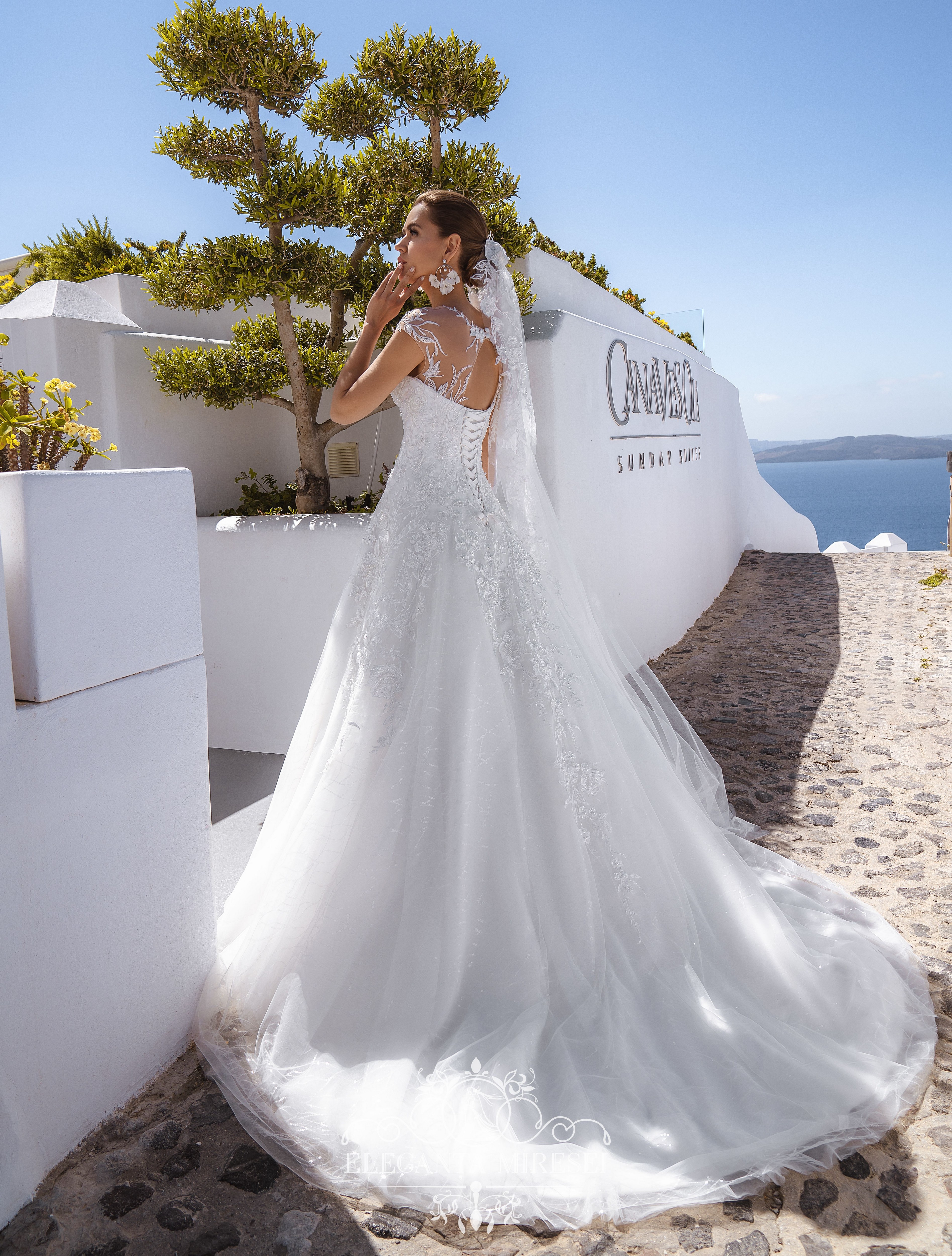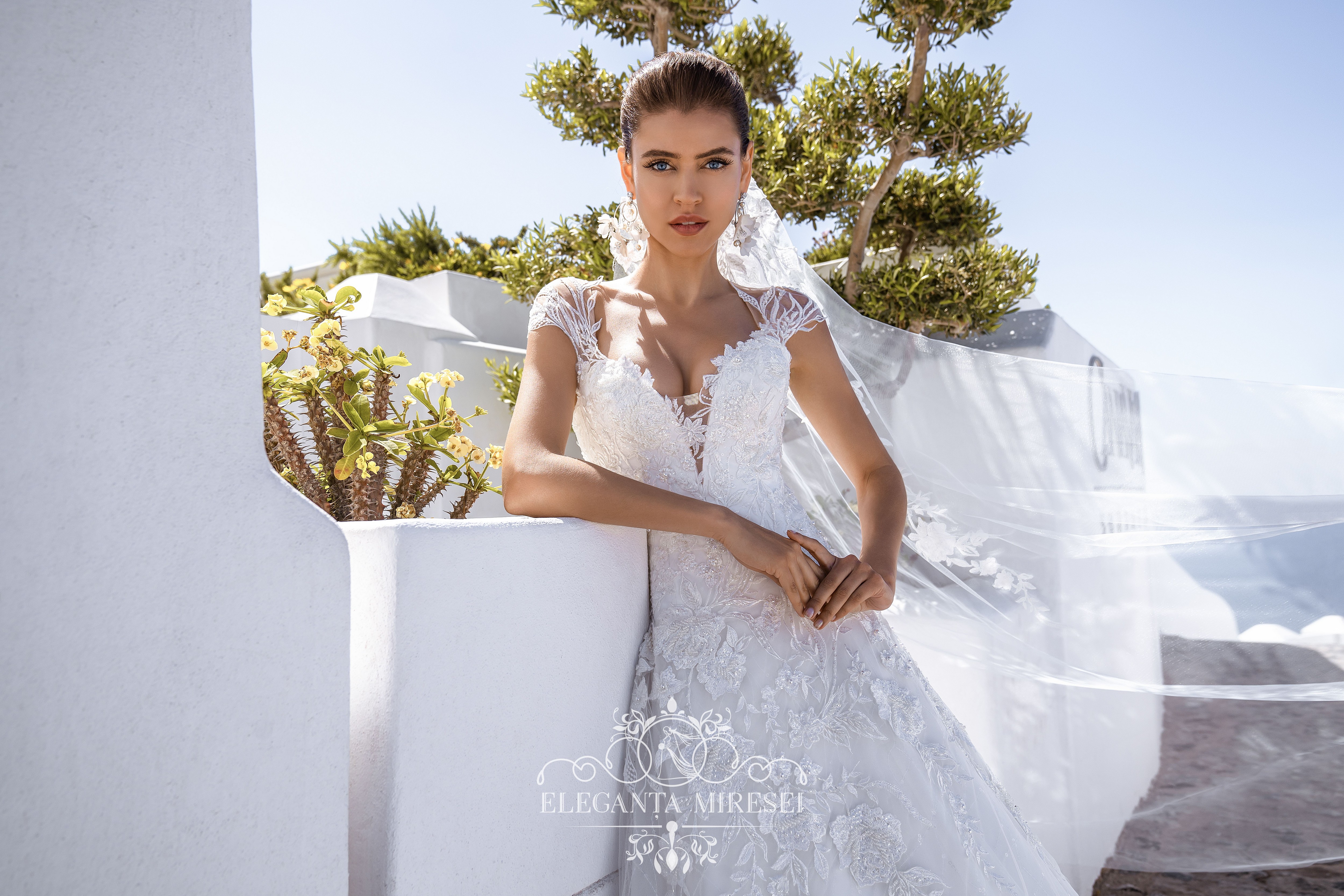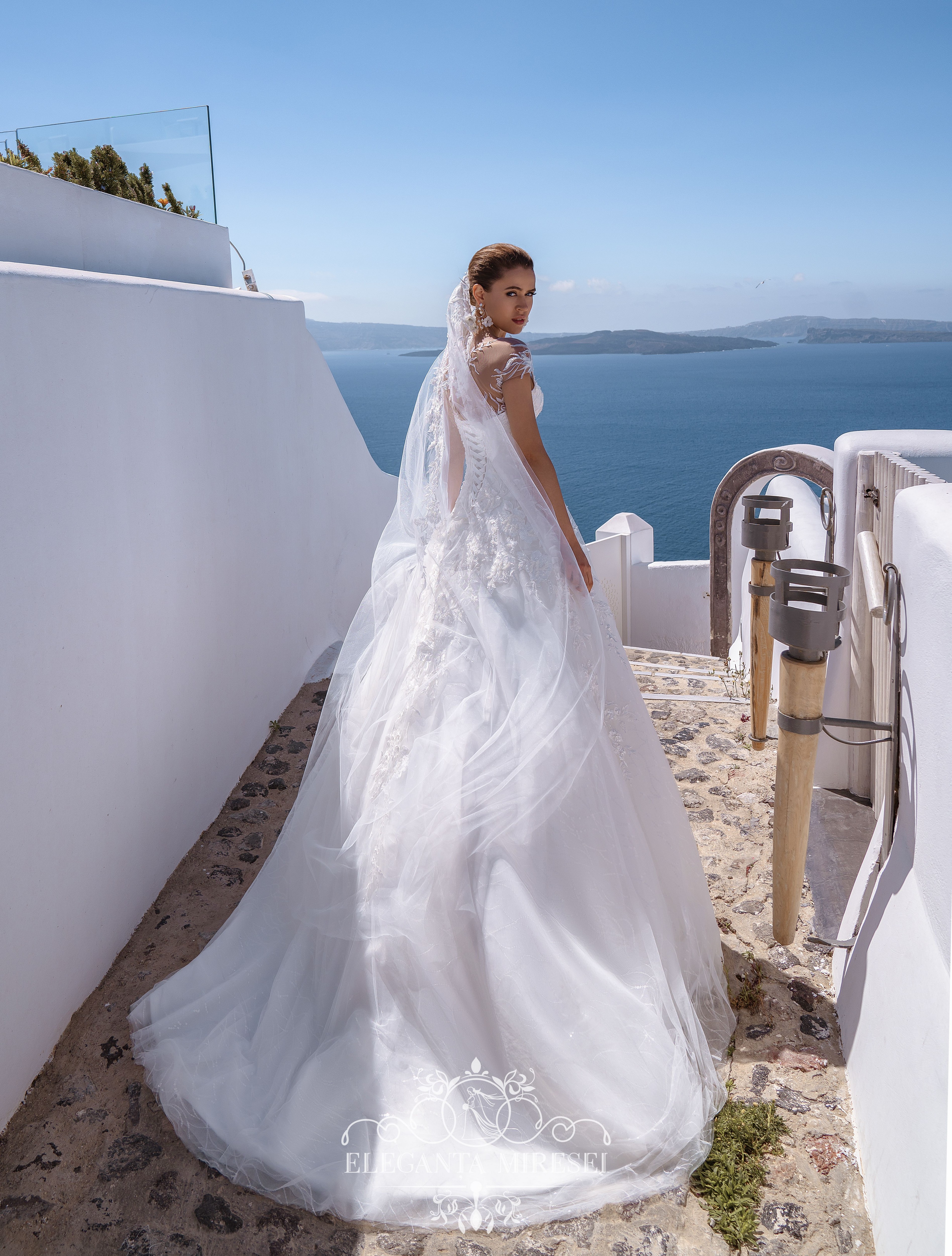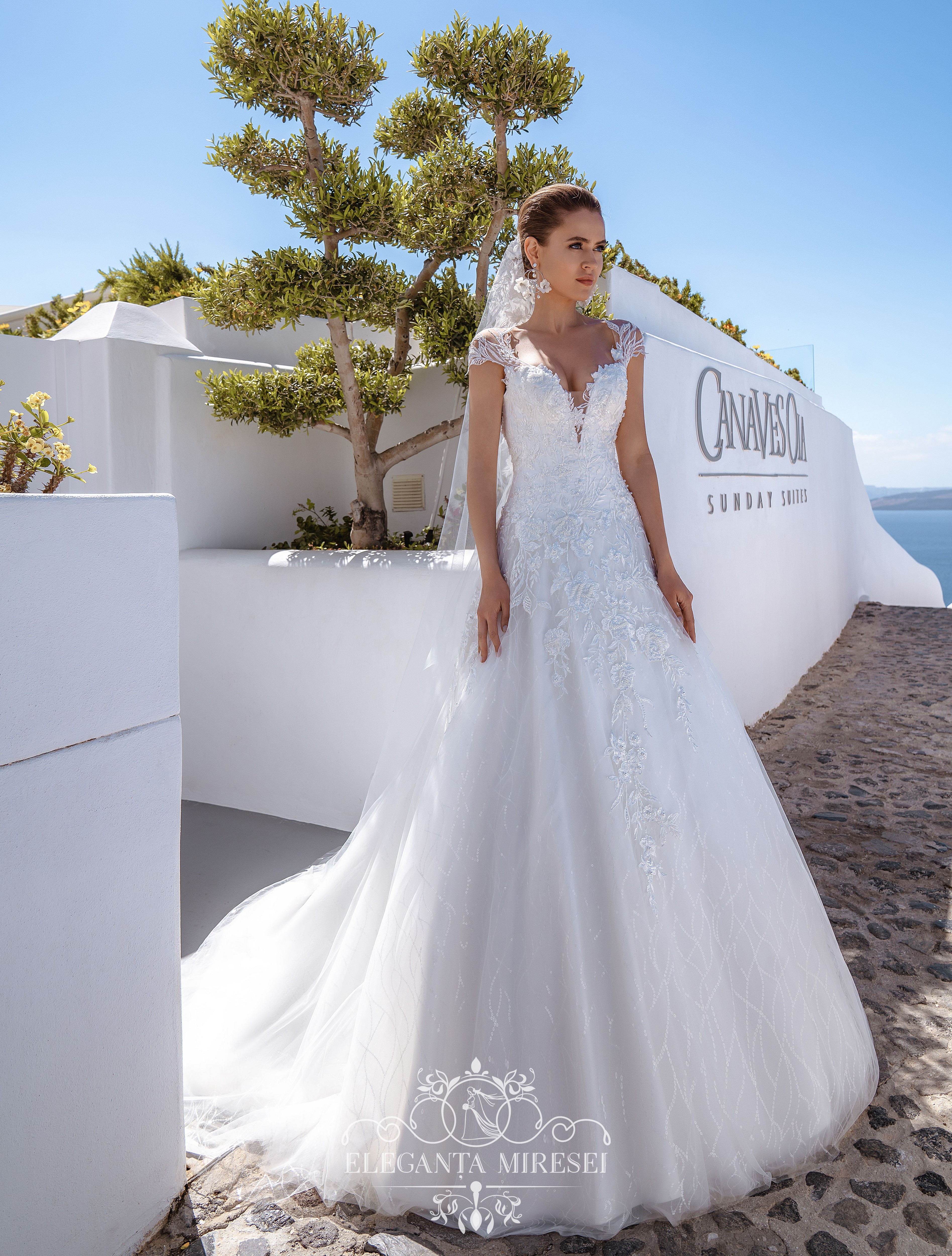 Rochie bufantă de mireasă clasică de silueta „A -line”. Spatele cu șireturi accentuează figura miresei. Rochia este decorată cu mânecă brodată din margele, perle și paiete.