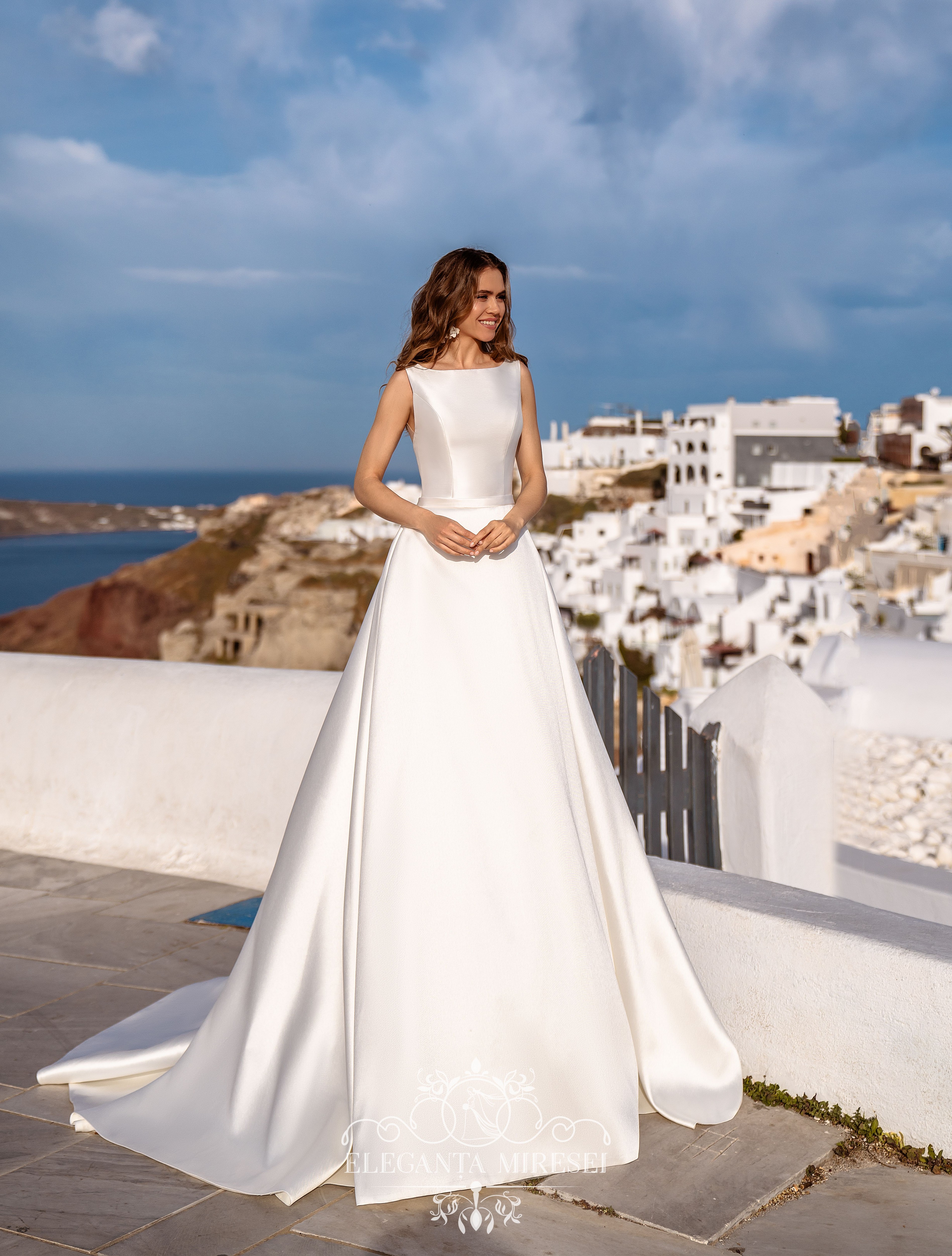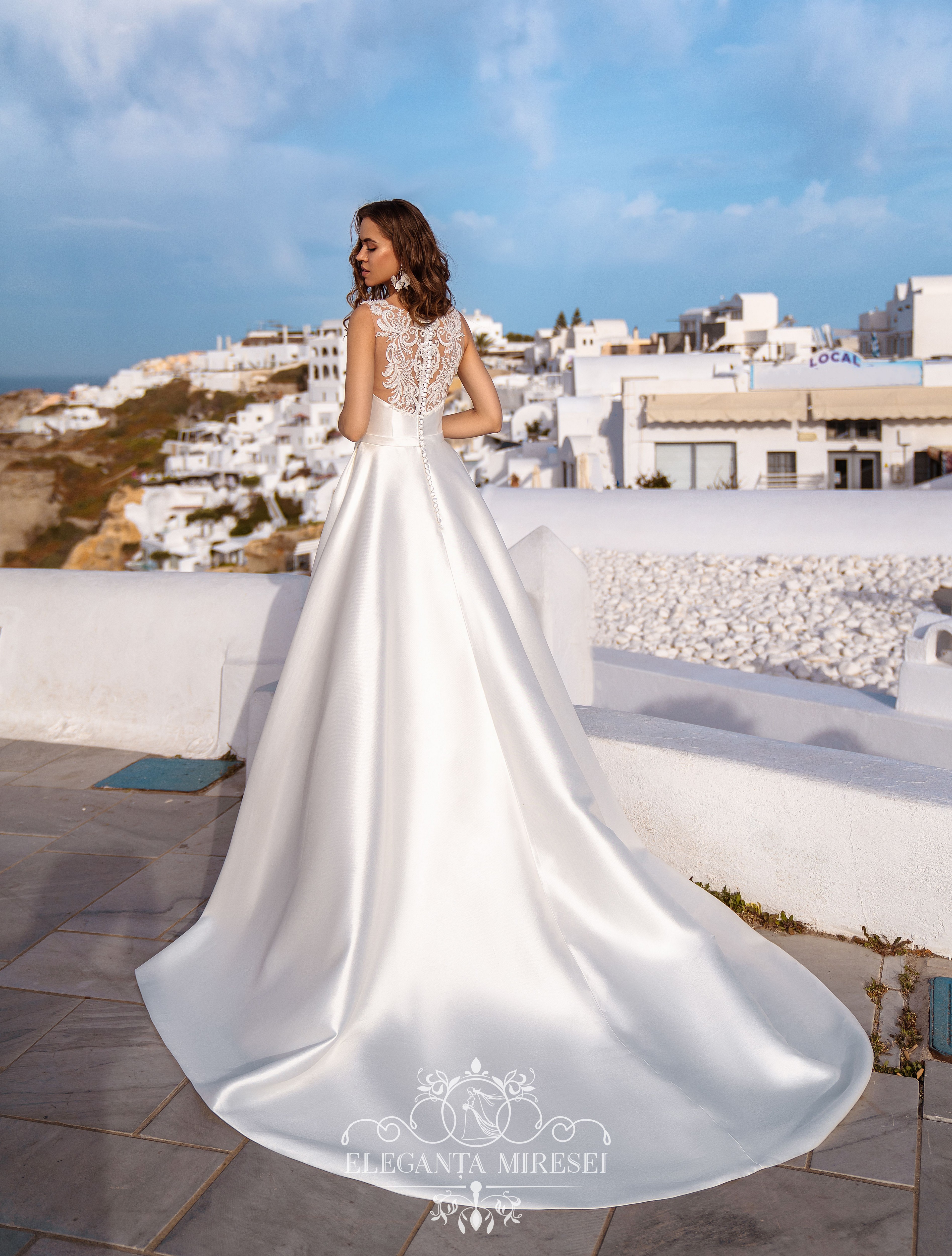 Rochie de mireasă excelentă în stilul „minimalismului”. Model de siluetă clasică „A-line” cu o trenă lungă. Rochia este complet confecționată din țesătură „Mikado” strălucitoare și este frumoasă prin simplitatea sa. Spatele translucid original este decorat cu ghipură, brodată manual cu margele, perle și paiete.