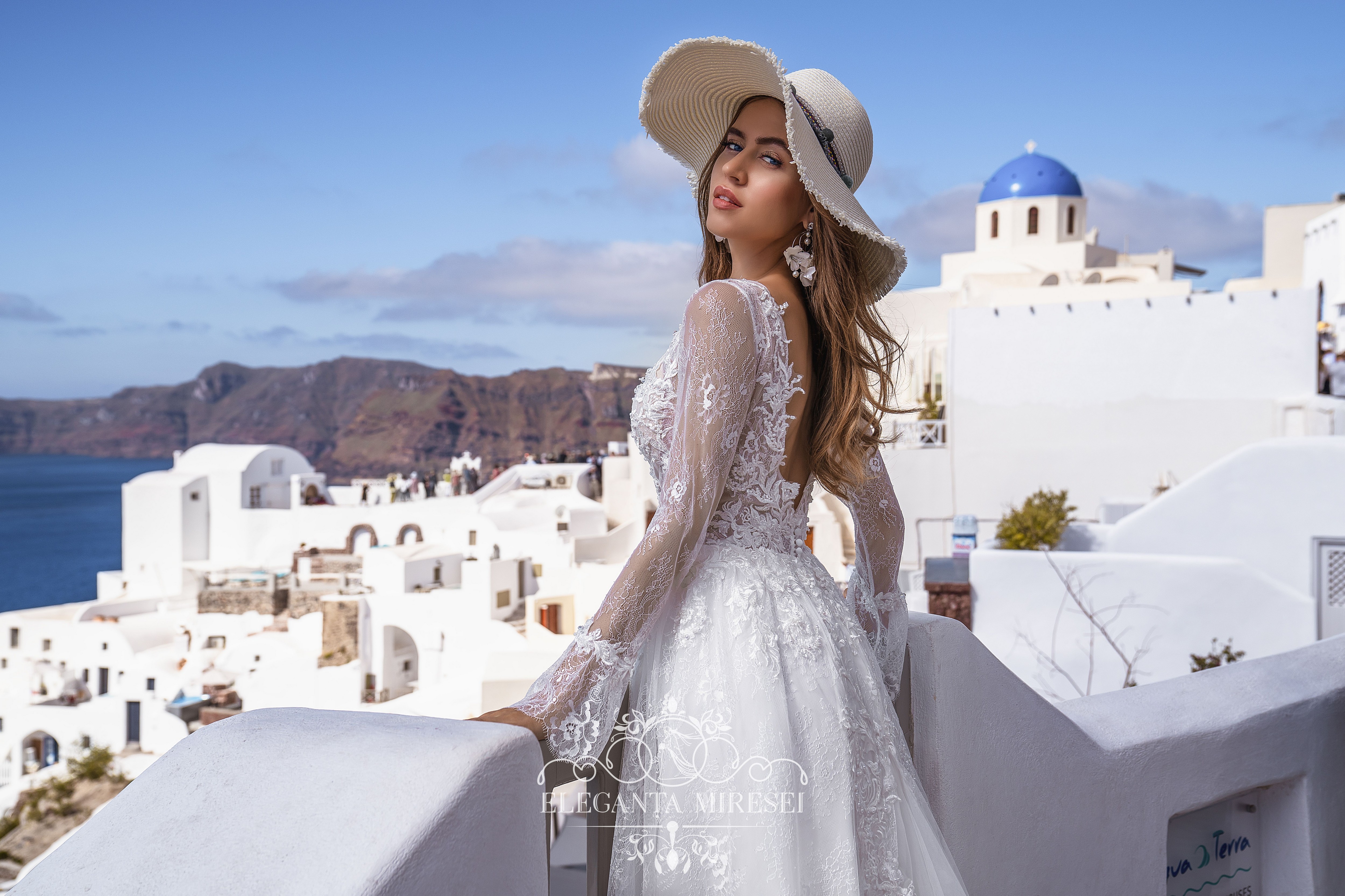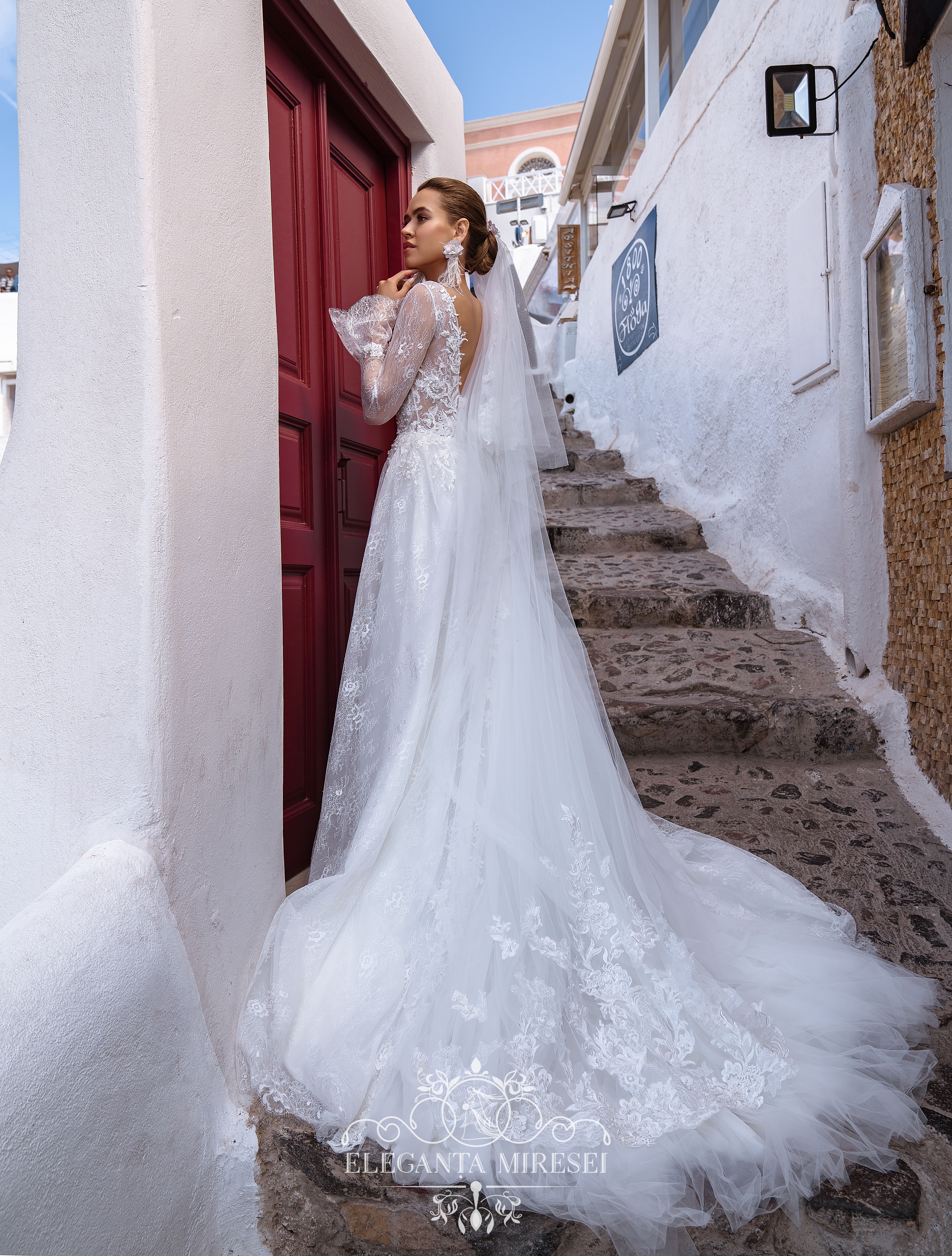 Rochie de mireasă sofisticată, cu mâneci lungi și o fustă-trenă moale. Un corset translucid până la talie este decorat cu un decolteu profund în față. Un detaliu izbitor al acestei rochii este mânecile lungi cloș.