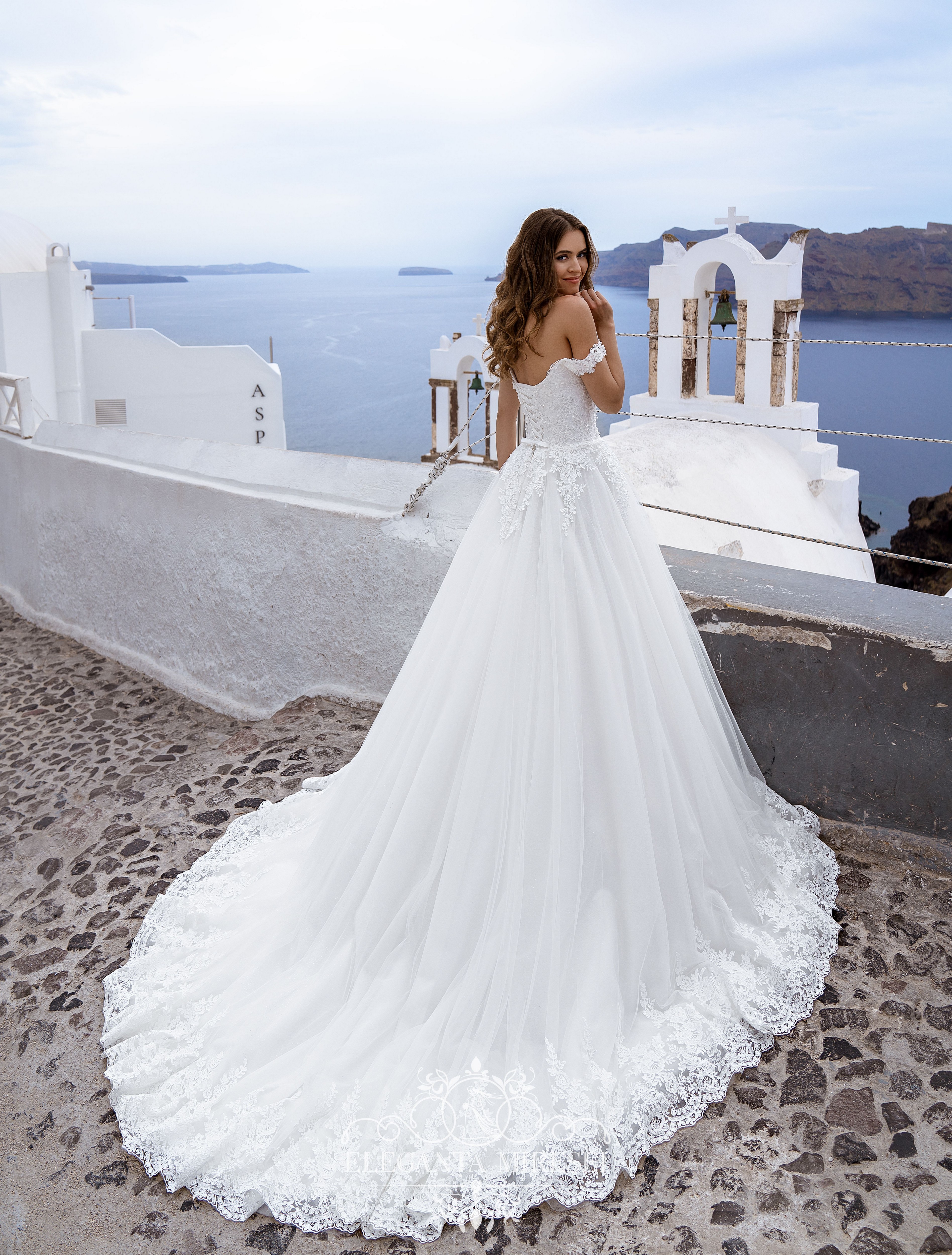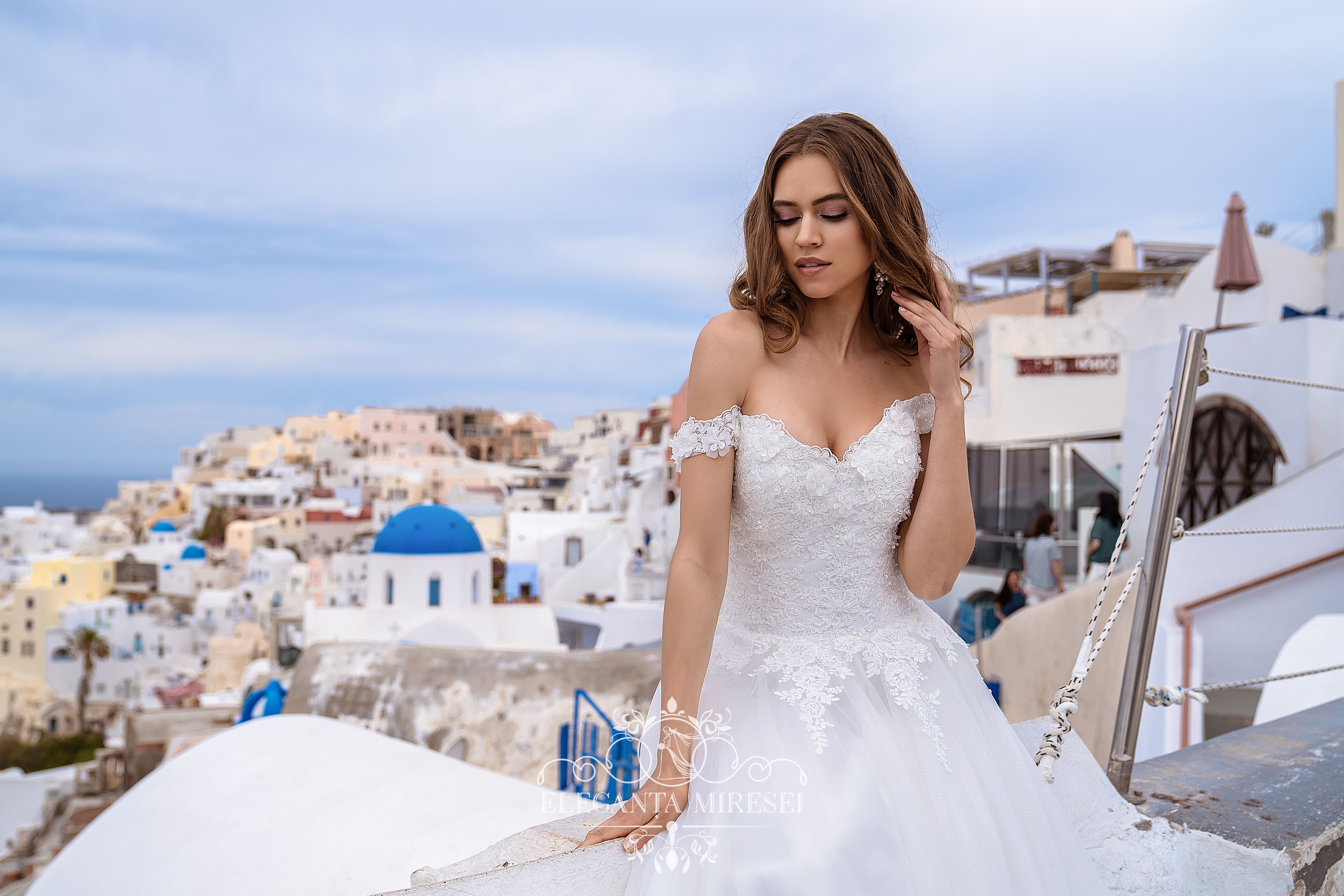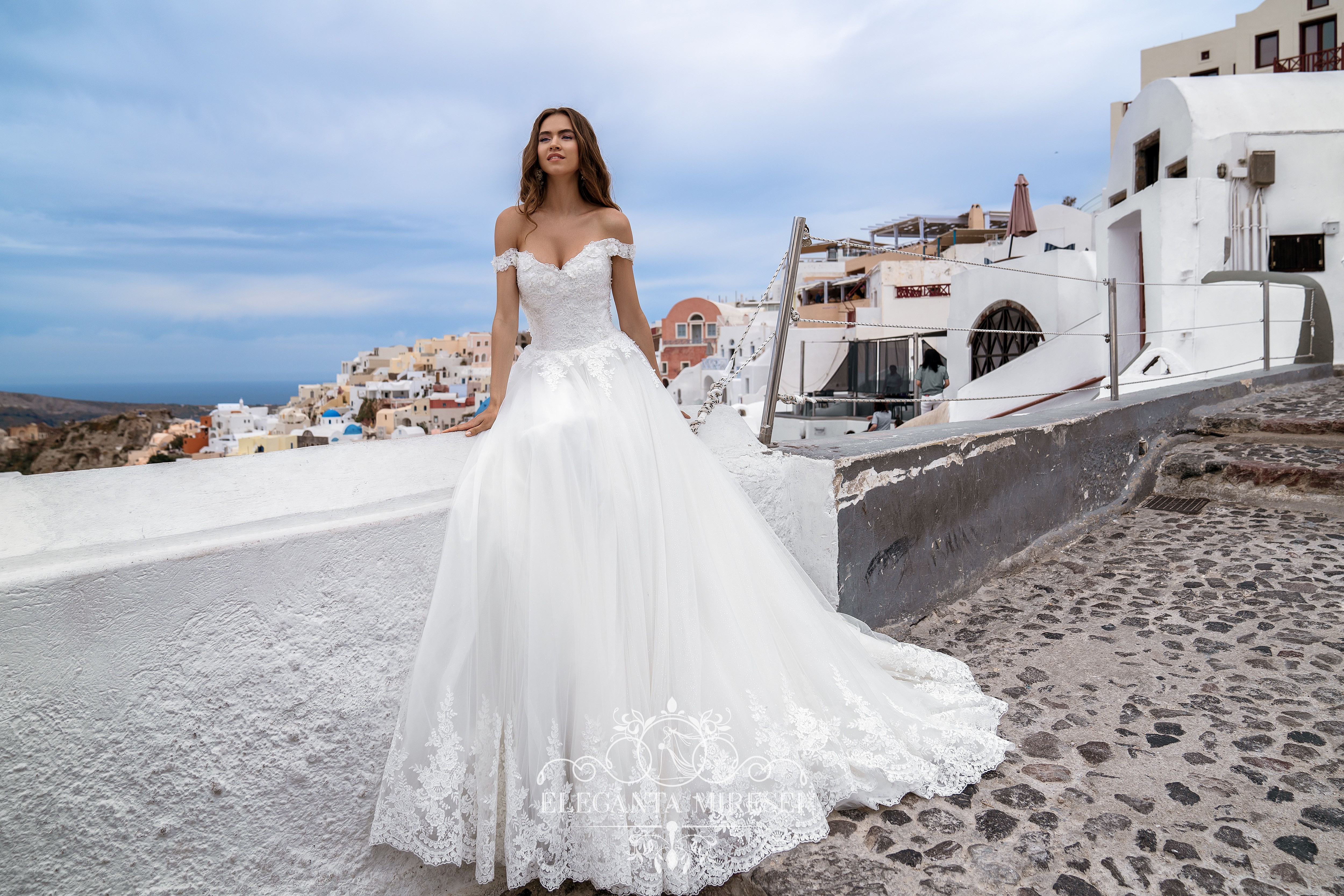 Rochie de mireasă luxoasă, cu umeri deschiși și fustă –trenă bufantă. Corsetul rochiei este decorat cu broderii de mână cu paiete, cristale și flori voluminoase. Fusta, din țesătură strălucitoare, este de asemenea decorată pe partea de jos, ceea ce face imaginea fabuloasă.
