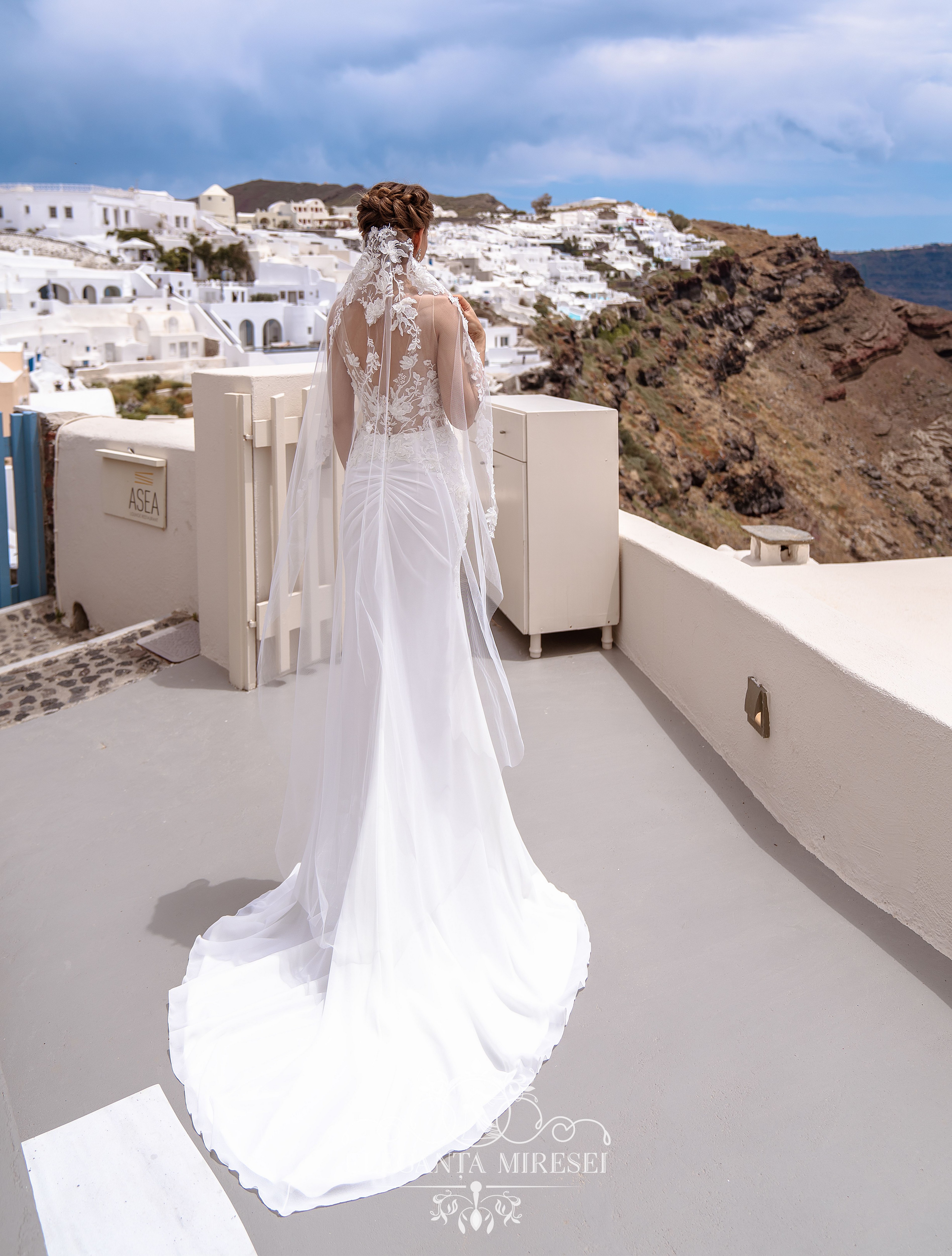 Rochie de mireasă elegantă cu bretele, silueta „sirena” cu trenă. Corsetul translucid seducător este decorat manual cu aplicații voluminoase, brodate cu margele, paiete și perle. Detaliul original al rochiei – draperia peste șolduri care evidențiază avantajos imaginea.