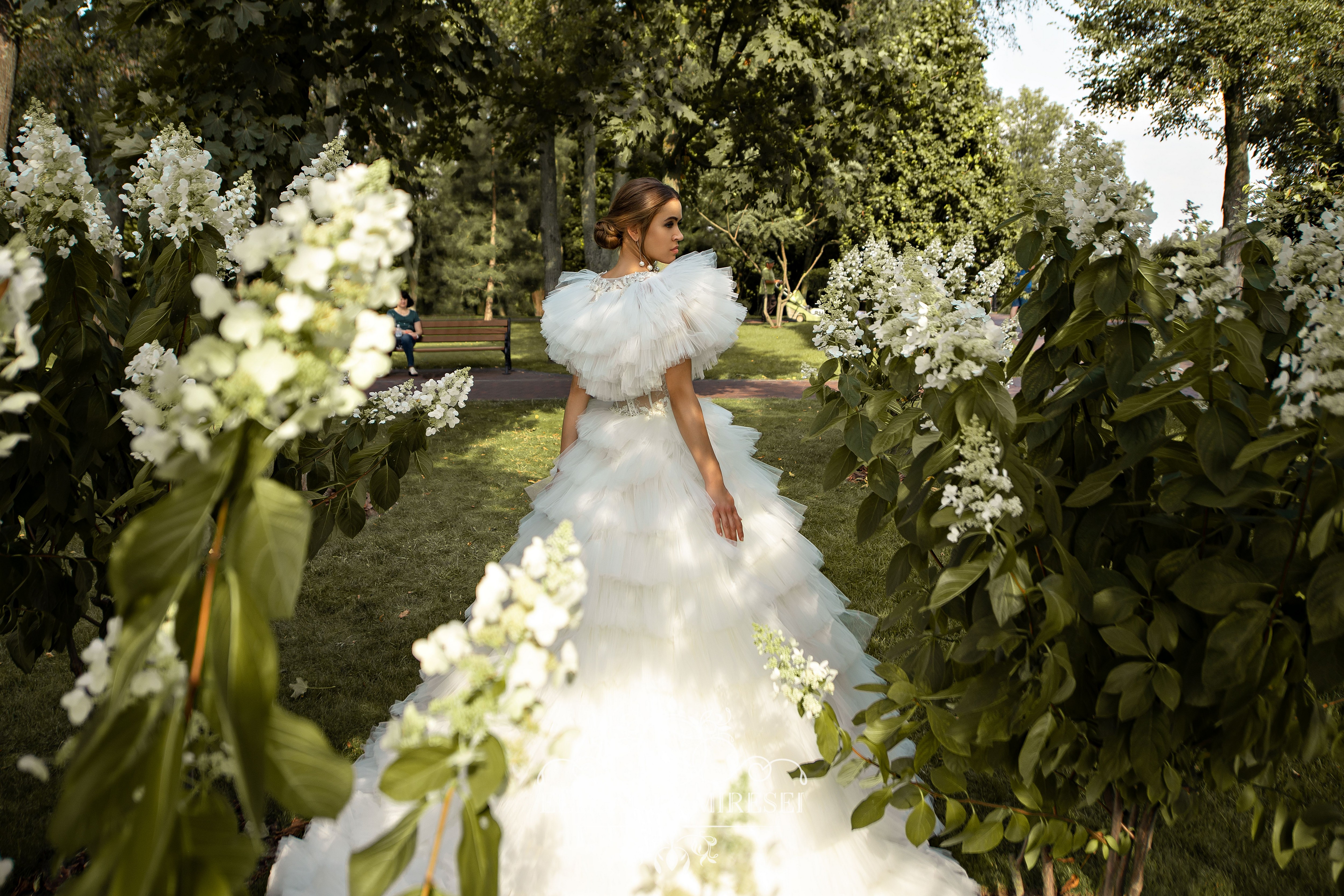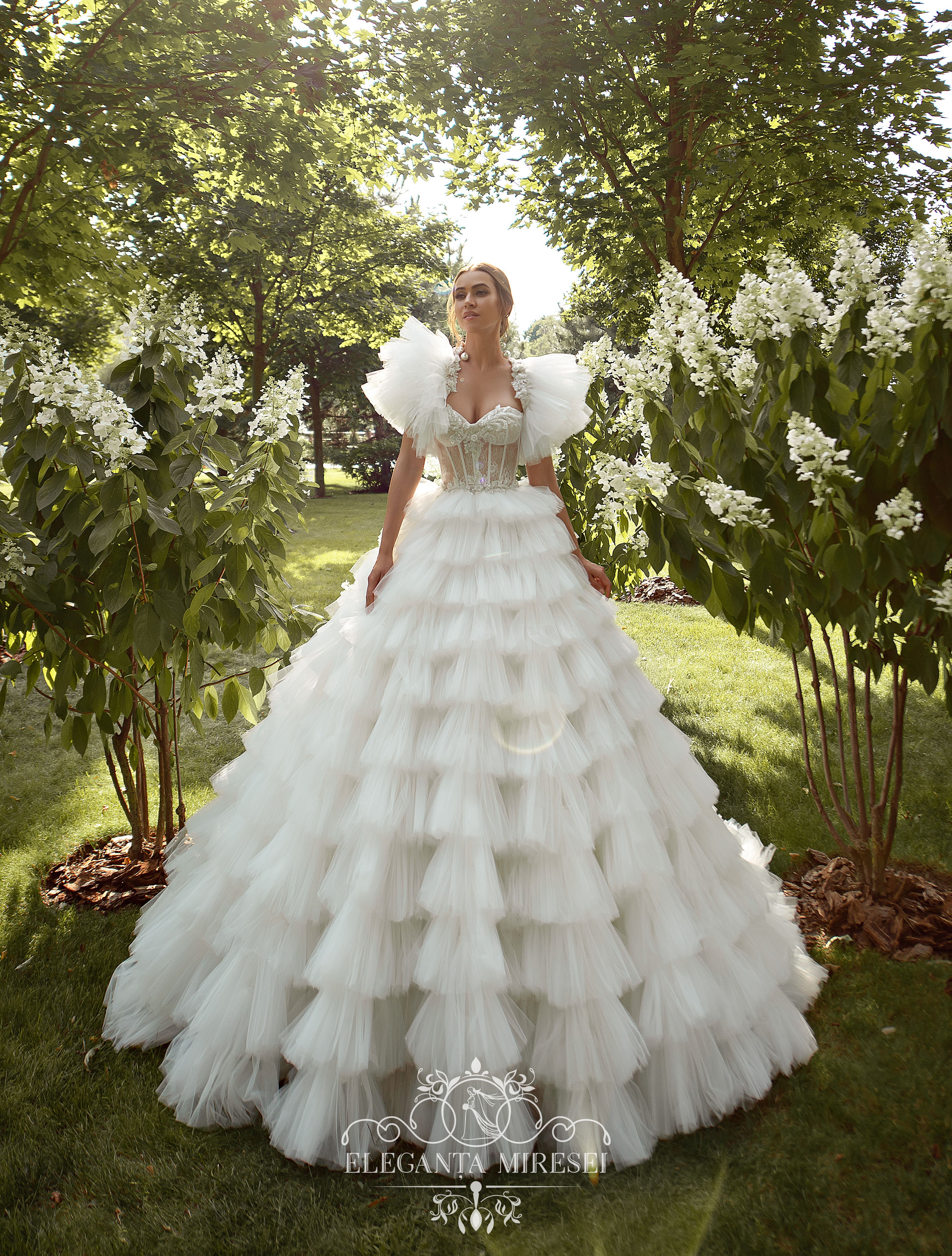 Un set de nunta aerisit format dintr-o rochie cu umerii deschisi seductiv, o fusta plina si un bolero detasabil. Rujurile ușoare și aerisite de pe fustă și bolero fac imaginea și mai incredibilă și lipsită de greutate. Modelul este decorat cu elemente de guipure voluminoase brodate cu perle, margele și piatră.