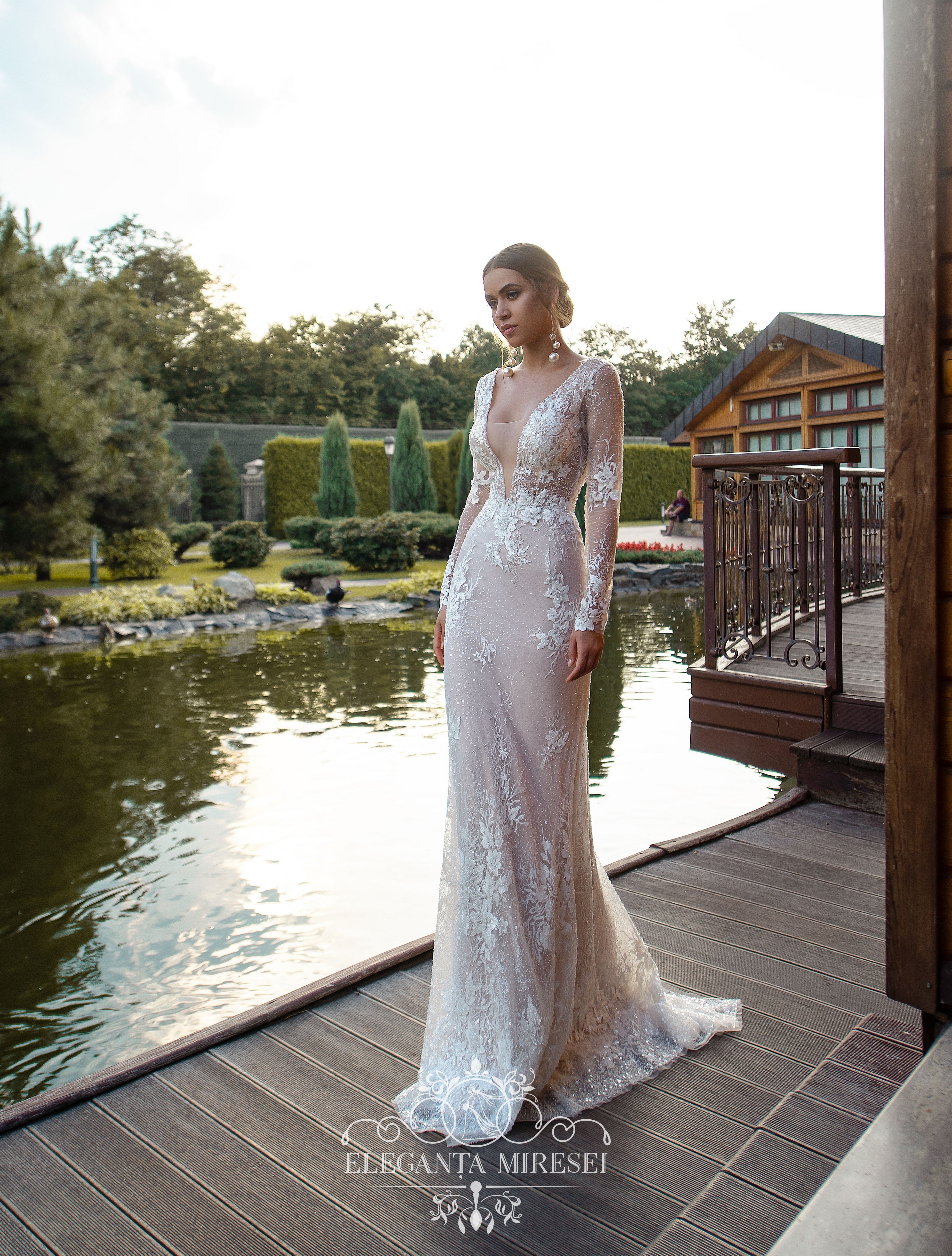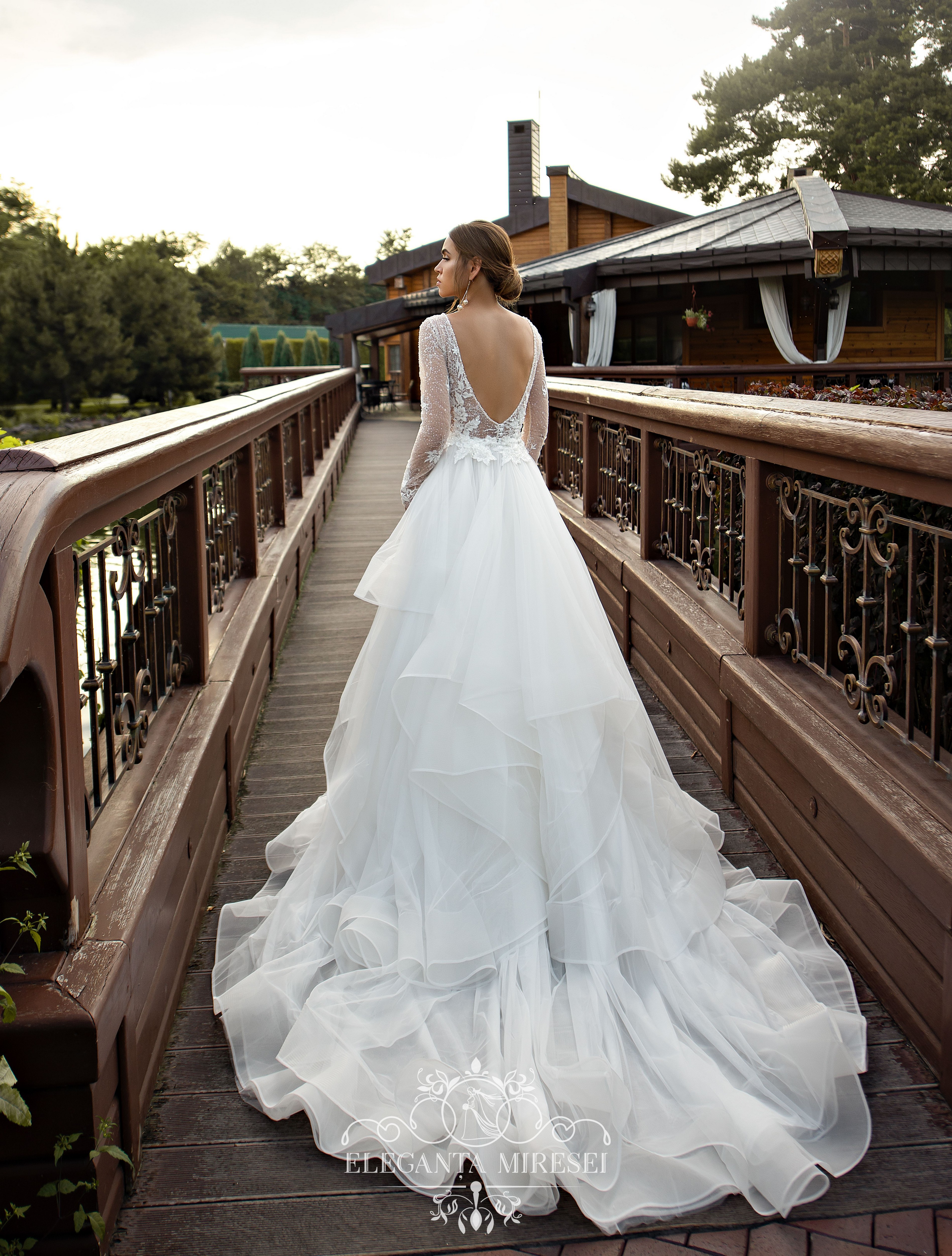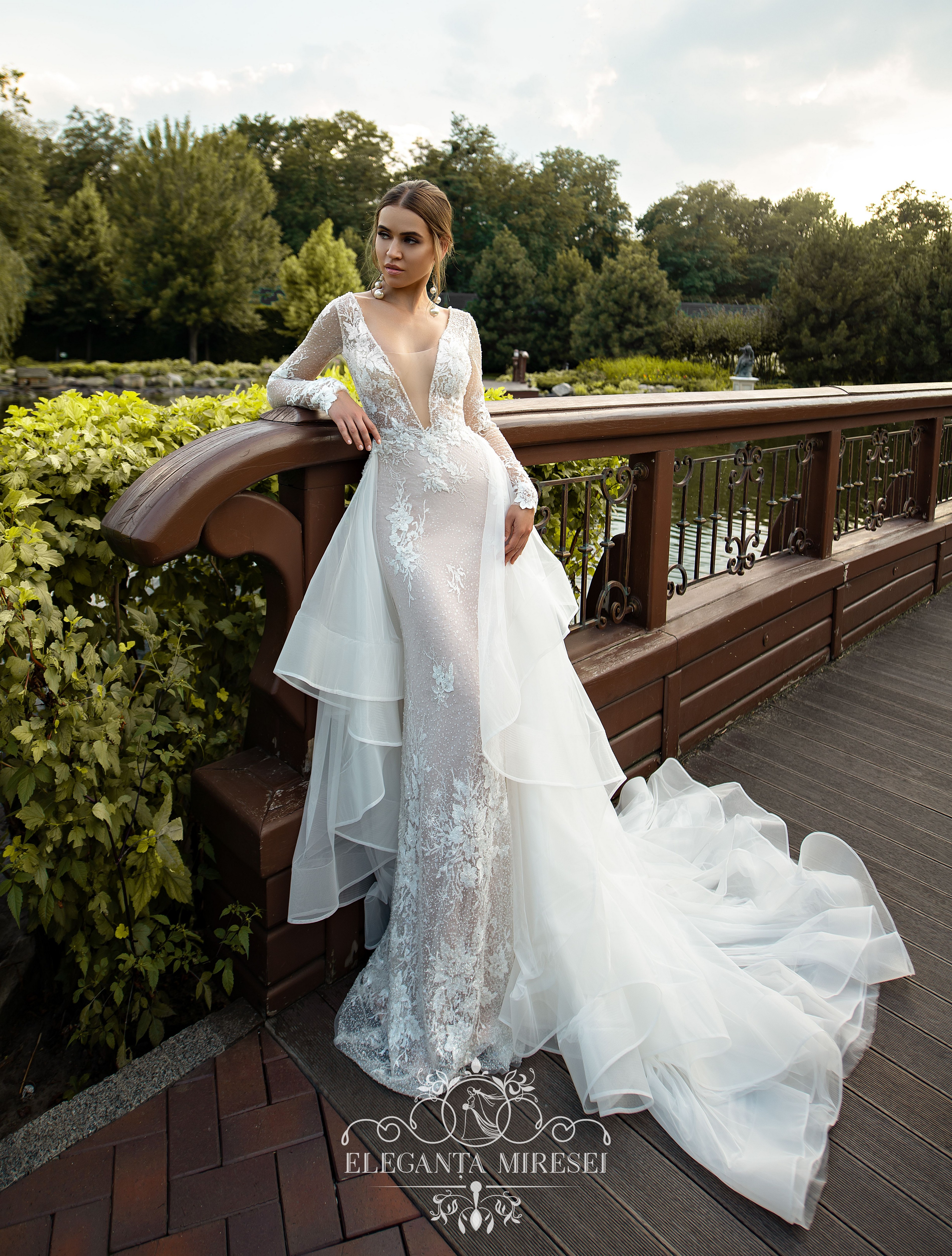 Un set de nuntă original format dintr-o rochie de guipure și o trenă detașabil. Fața și spatele rochiei sunt înfrumusețate cu un gât în V adânc. Trena detașabilă adaugă ușurință specială și ajută la actualizarea imaginii în câteva secunde. Modelul este decorat cu elemente de guipure brodate cu mărgele, cristal și paiete.