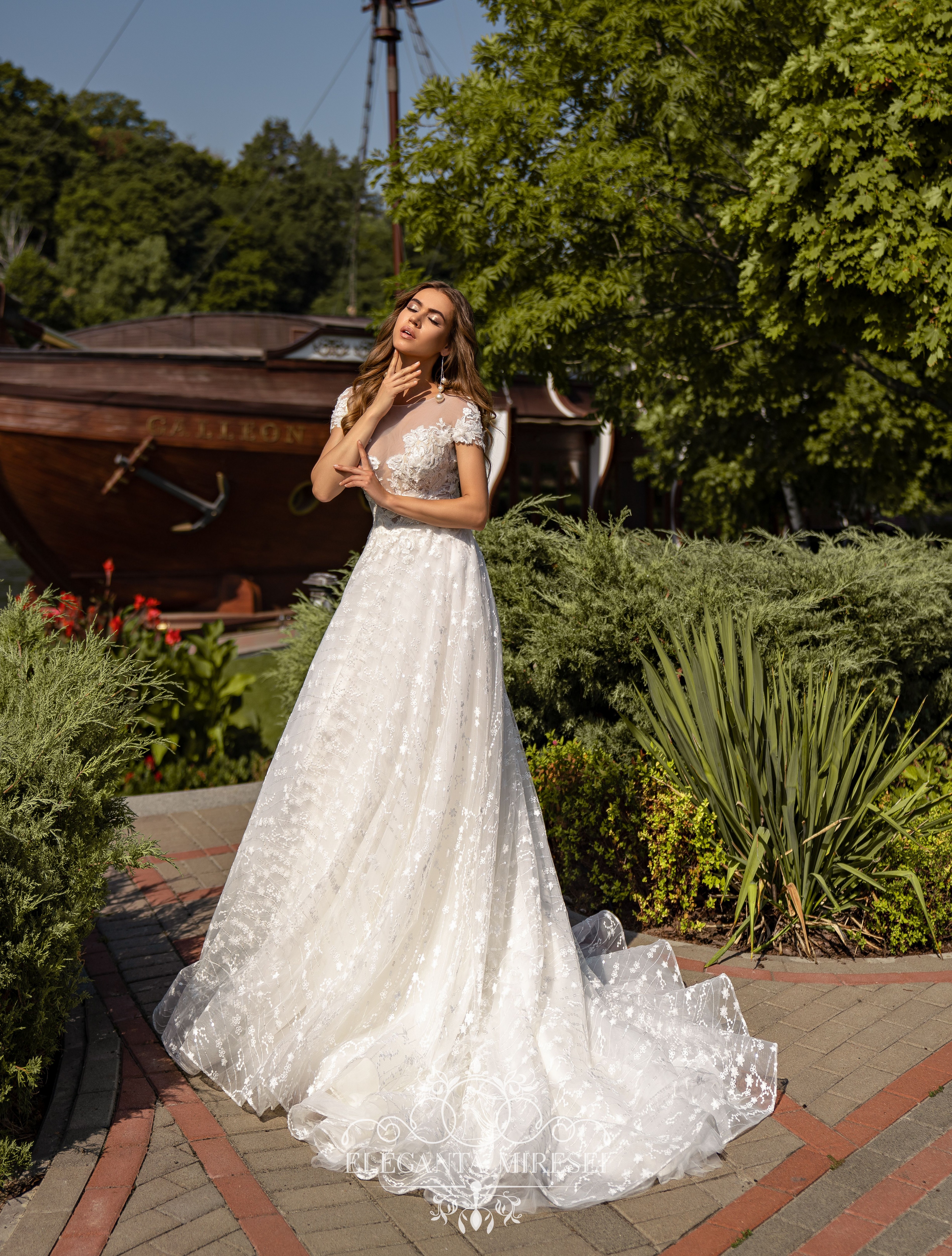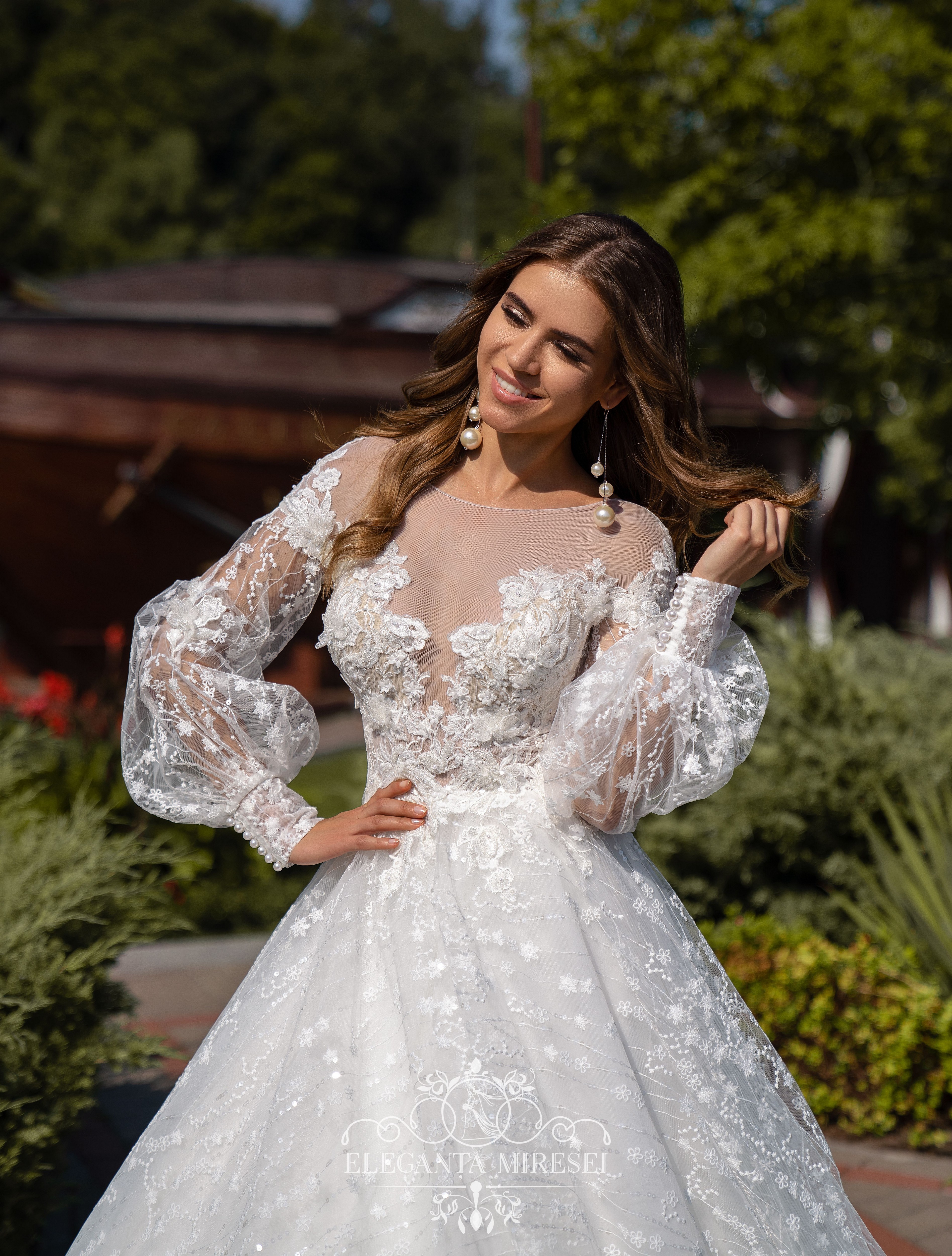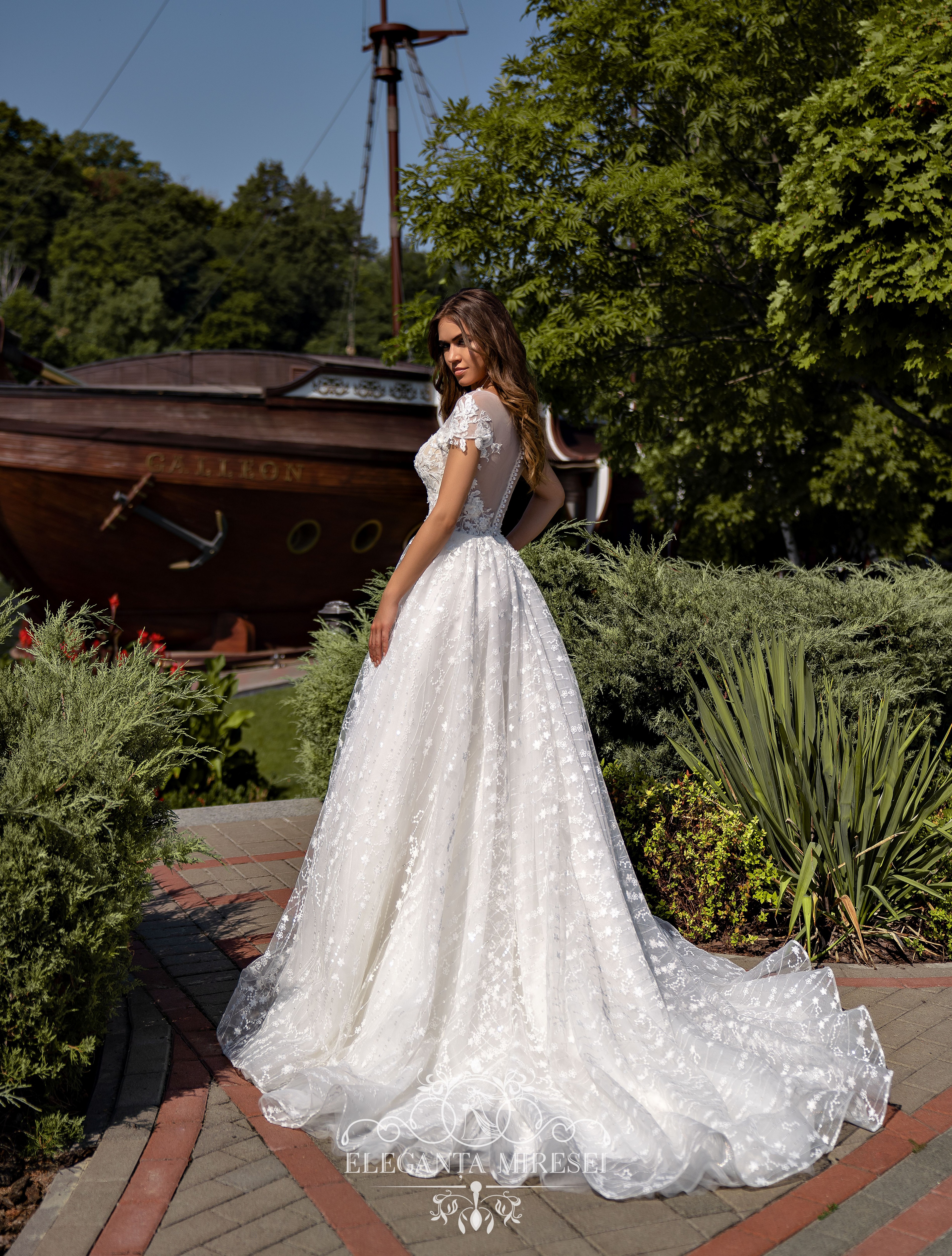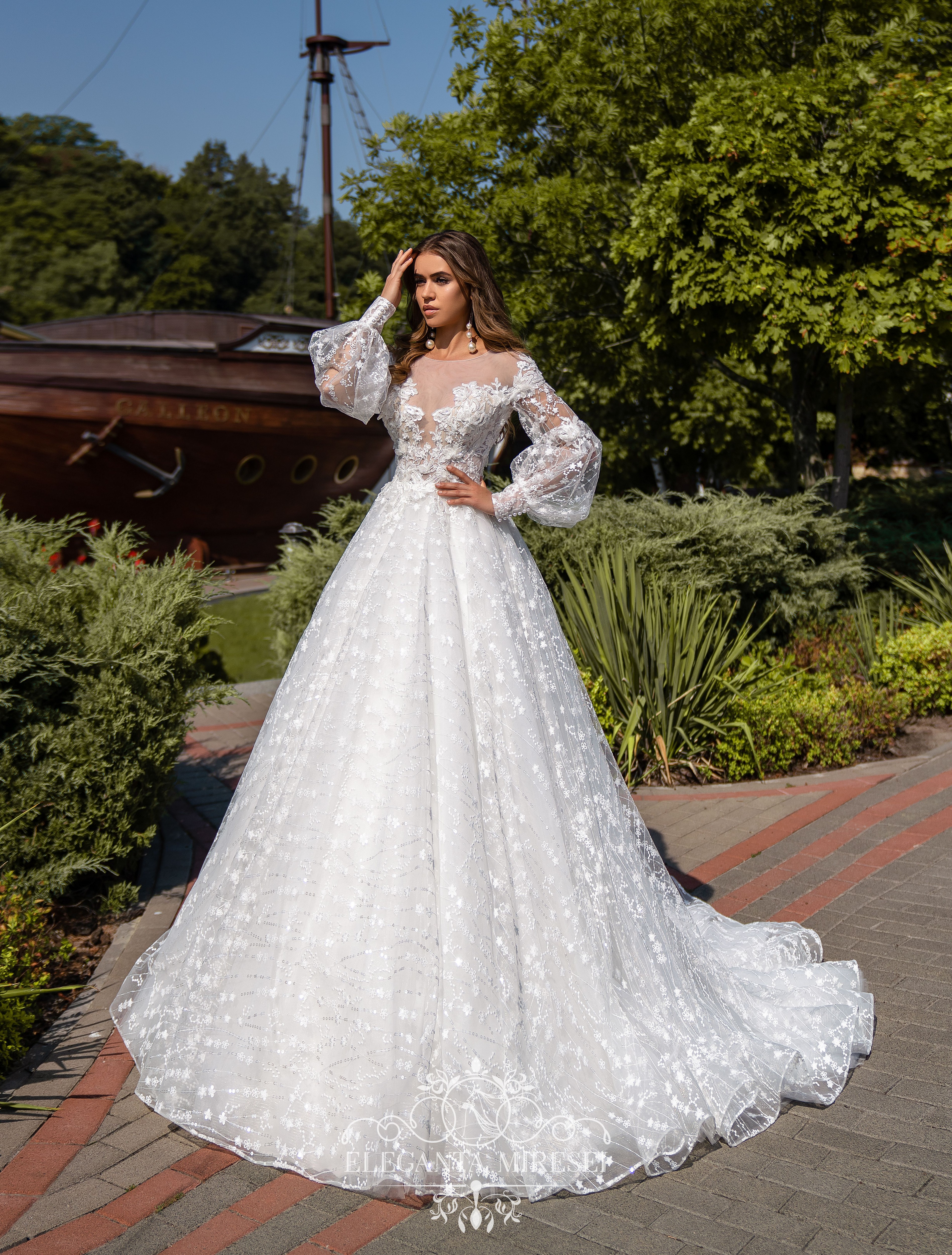 Rochie uimitoare, cu mâneci lungi demontabile și o fustă pufoasă. Decorată cu guipure, brodată cu paiete, rochia pare să înflorească. O fustă pufoasă acoperită cu țesătură strălucitoare conferă imaginii o fabulozitate.