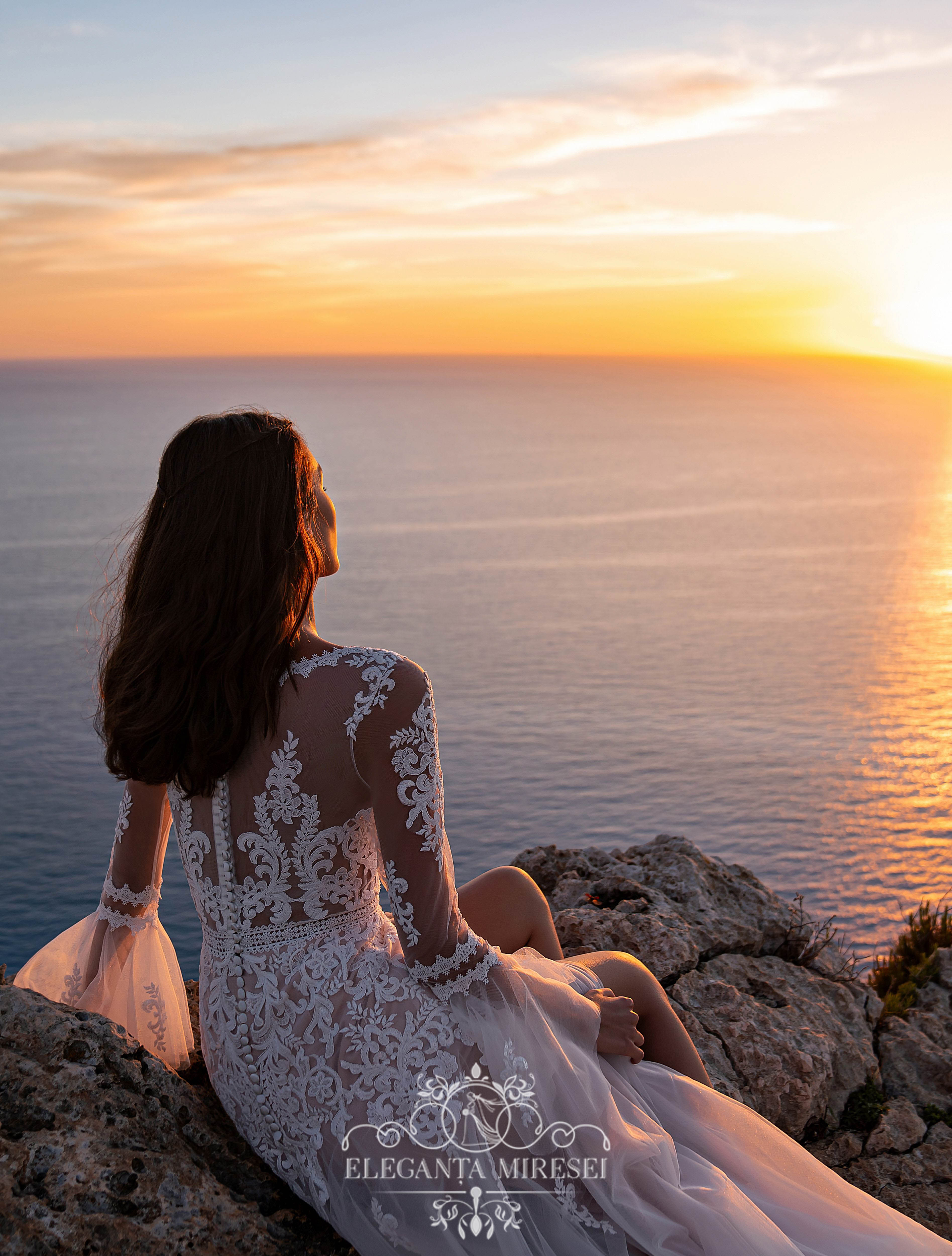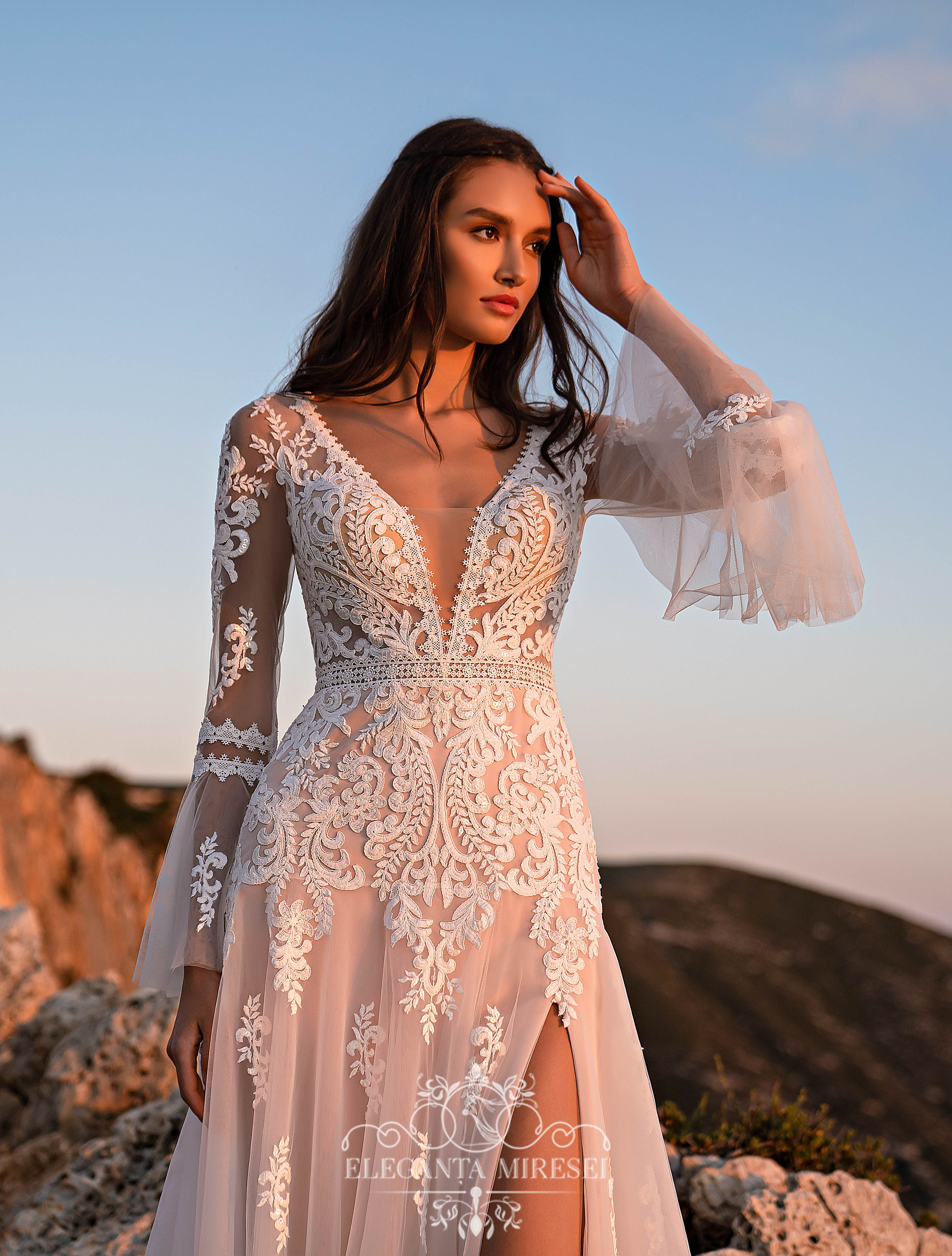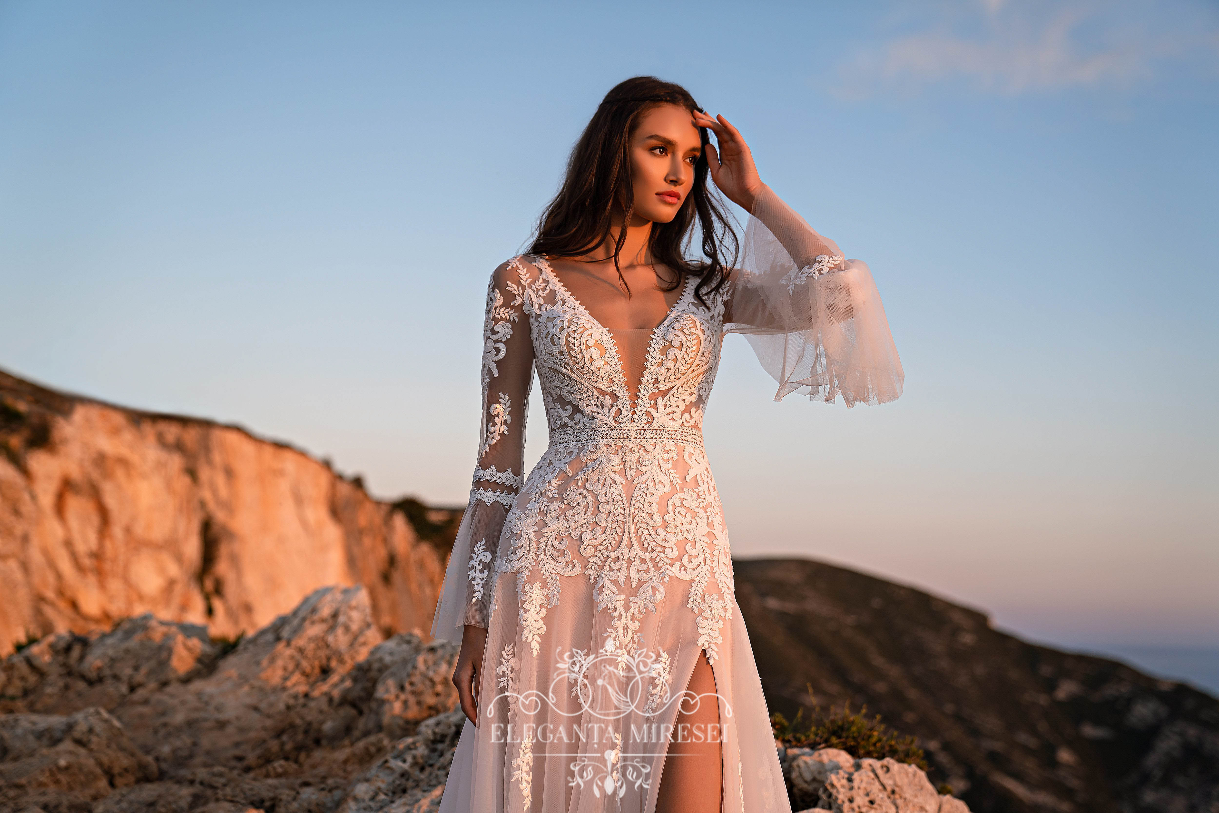 O rochie uimitoare de mireasă stil boho înfrumusețată cu dantelă cu fir, paiete brodate și dantelă boho. Un corset moale transparent, cu imitația unei tăieturi adânci, combinat cu mâneci largi cloșate, fustă cu crăpătură pe piciorul stâng, conferă modelului ușurință . Spatele este decorat cu un rând de nasturi și trena lungă dă modelului un farmec deosebit!