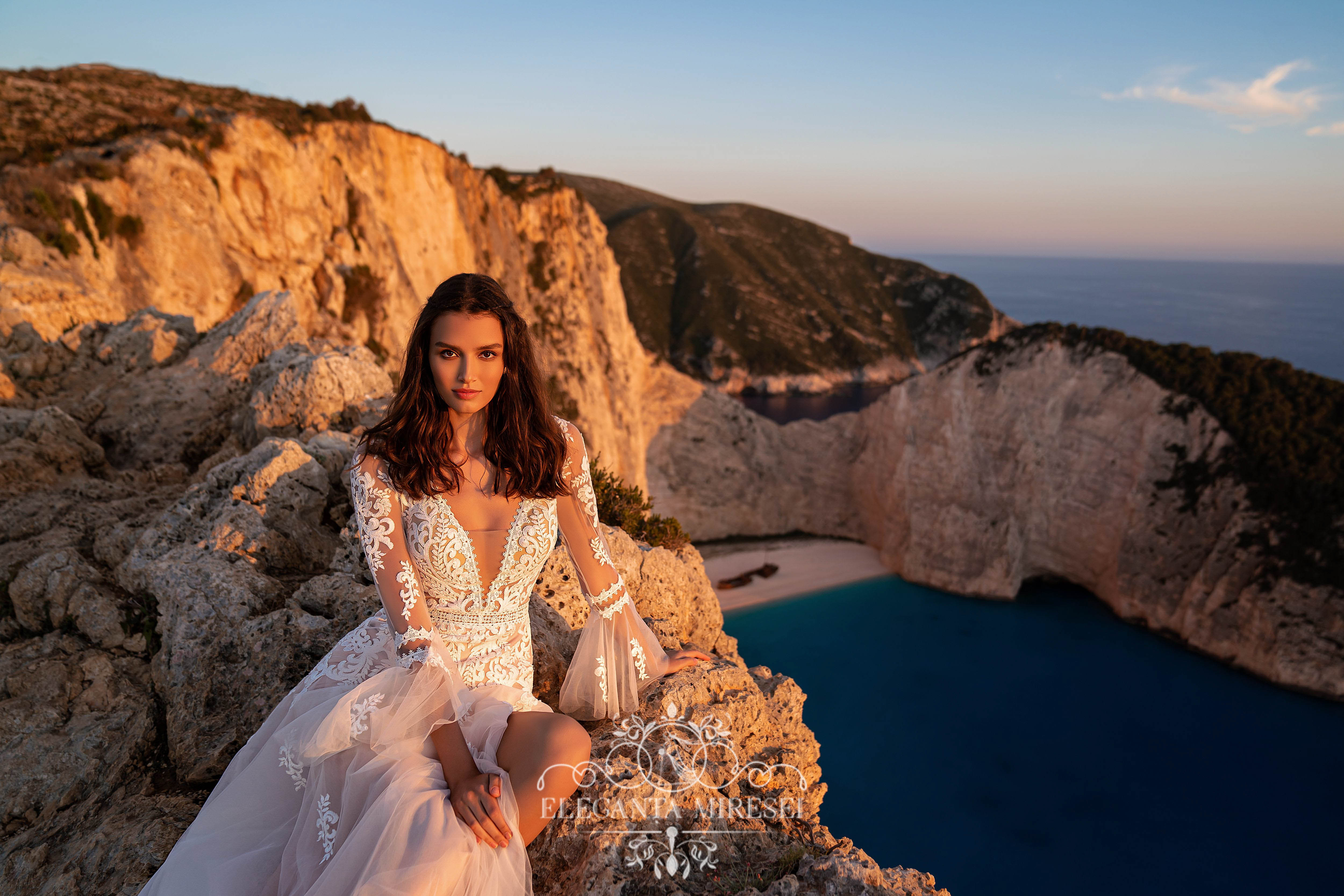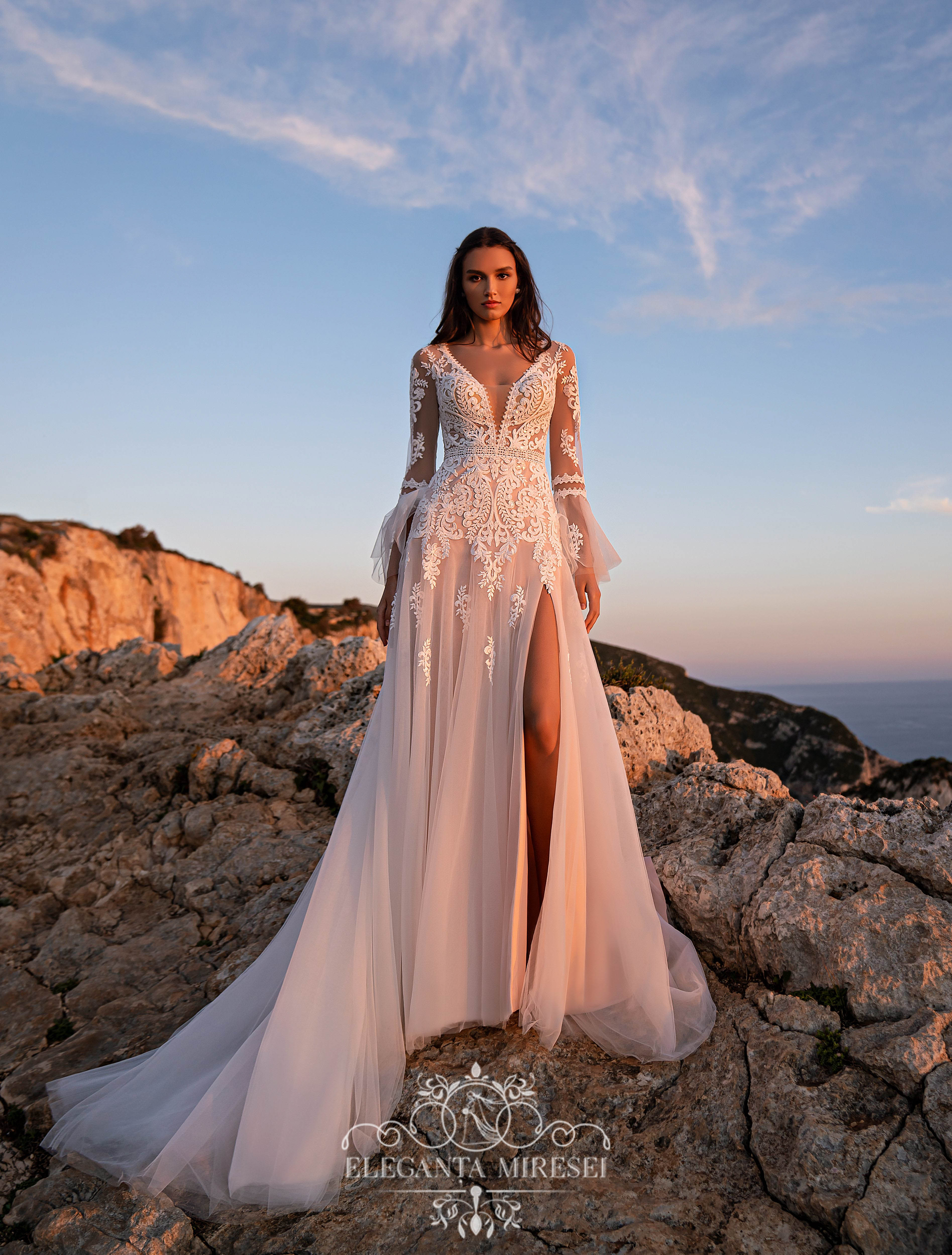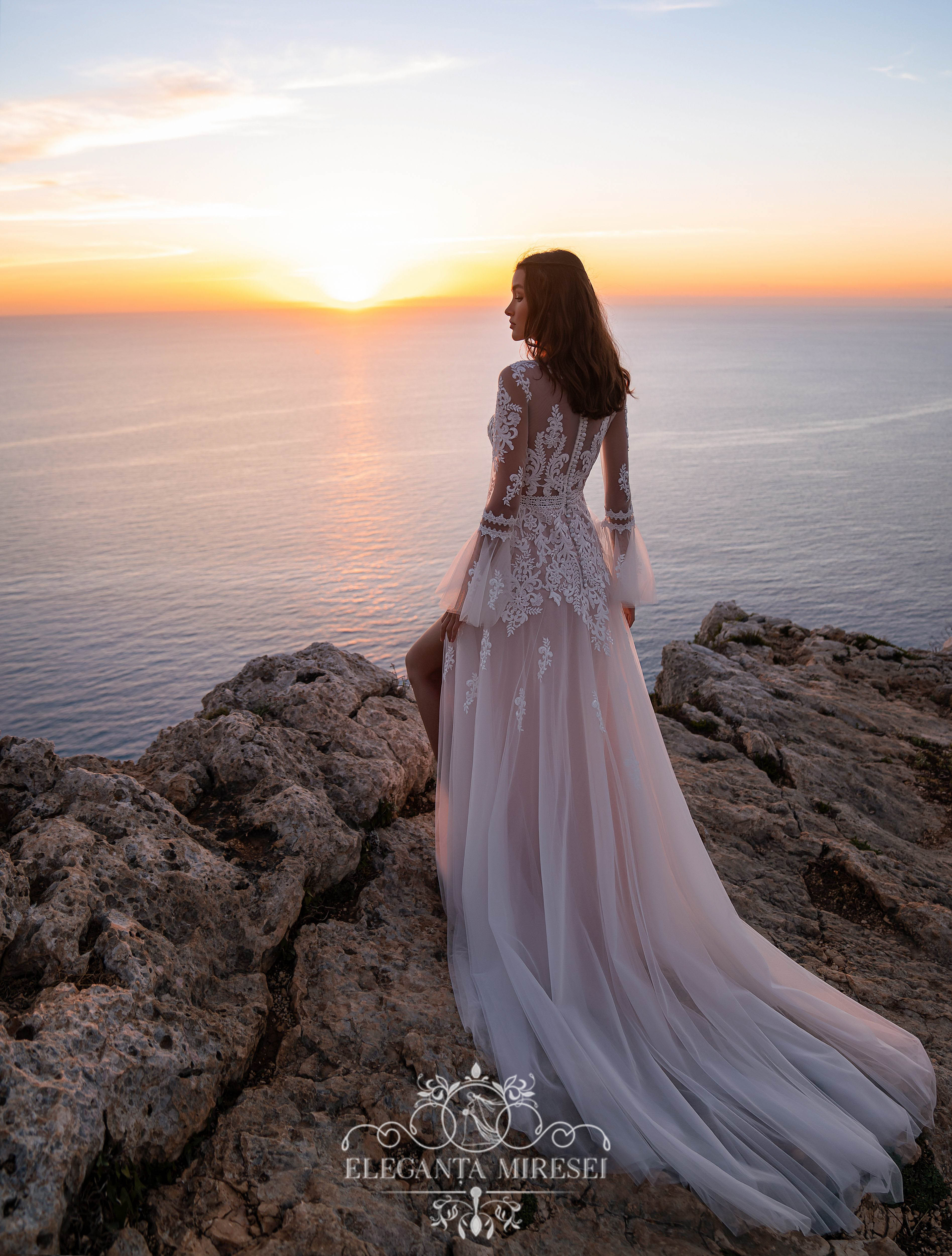 O rochie uimitoare de mireasă stil boho înfrumusețată cu dantelă cu fir, paiete brodate și dantelă boho. Un corset moale transparent, cu imitația unei tăieturi adânci, combinat cu mâneci largi cloșate, fustă cu crăpătură pe piciorul stâng, conferă modelului ușurință . Spatele este decorat cu un rând de nasturi și trena lungă dă modelului un farmec deosebit!