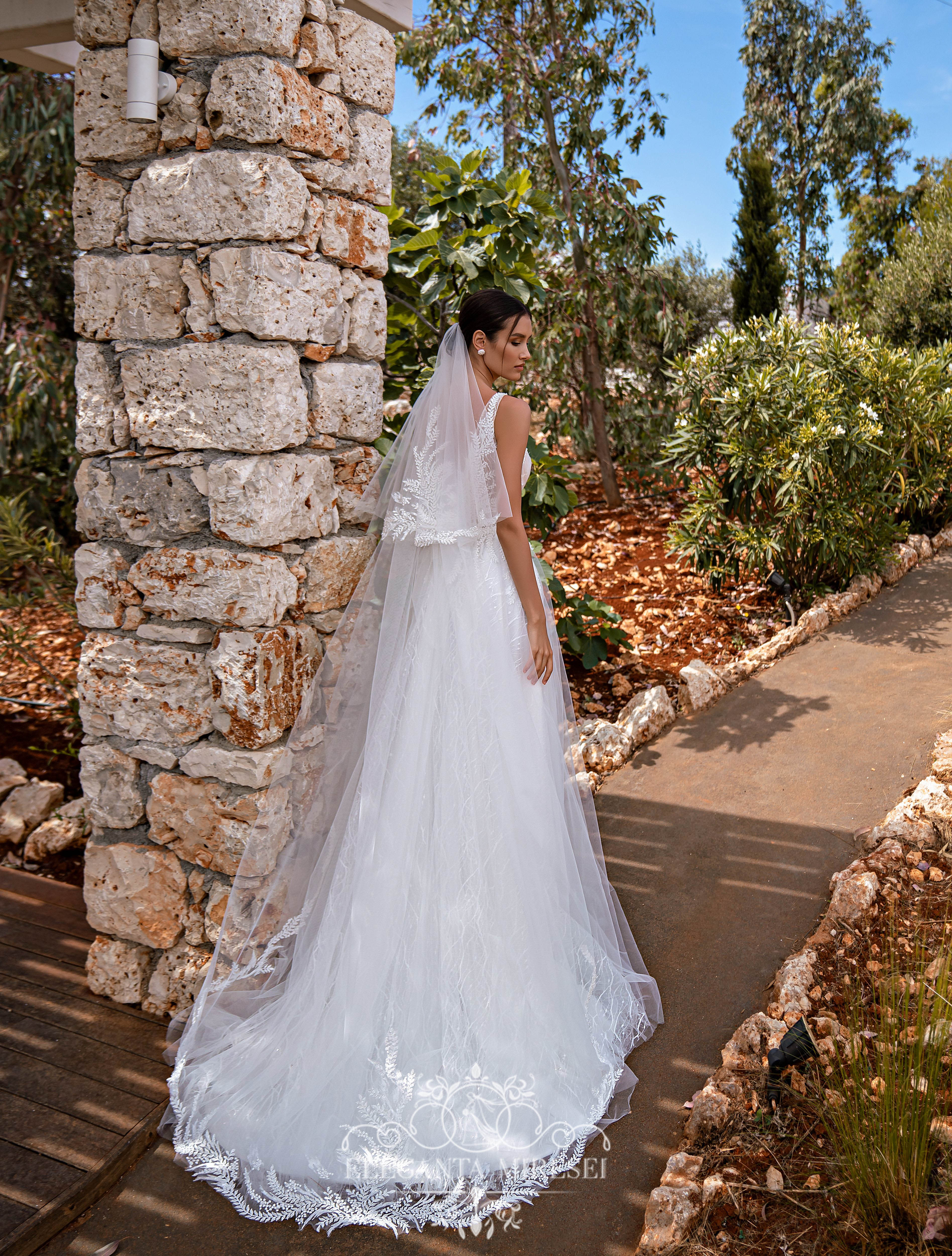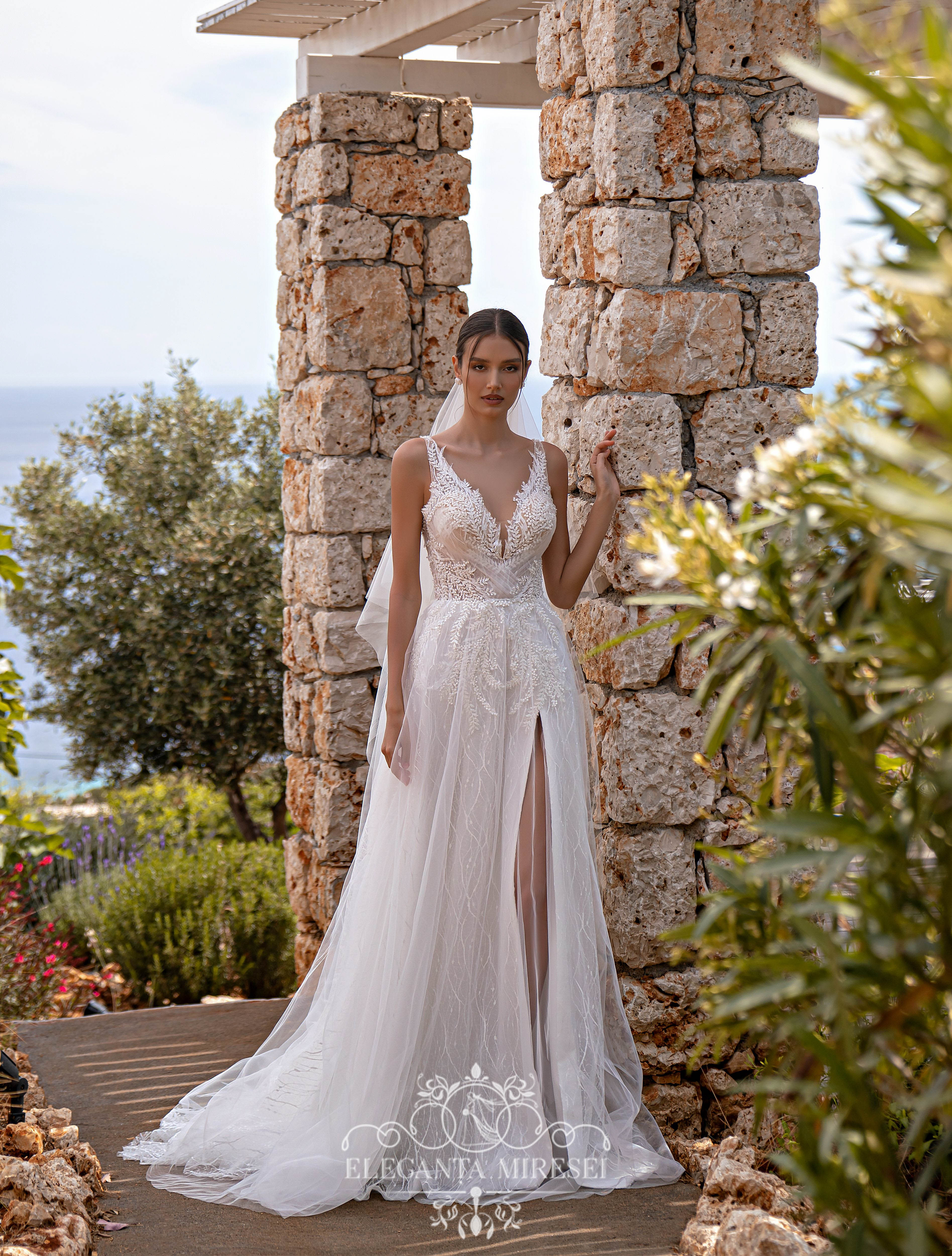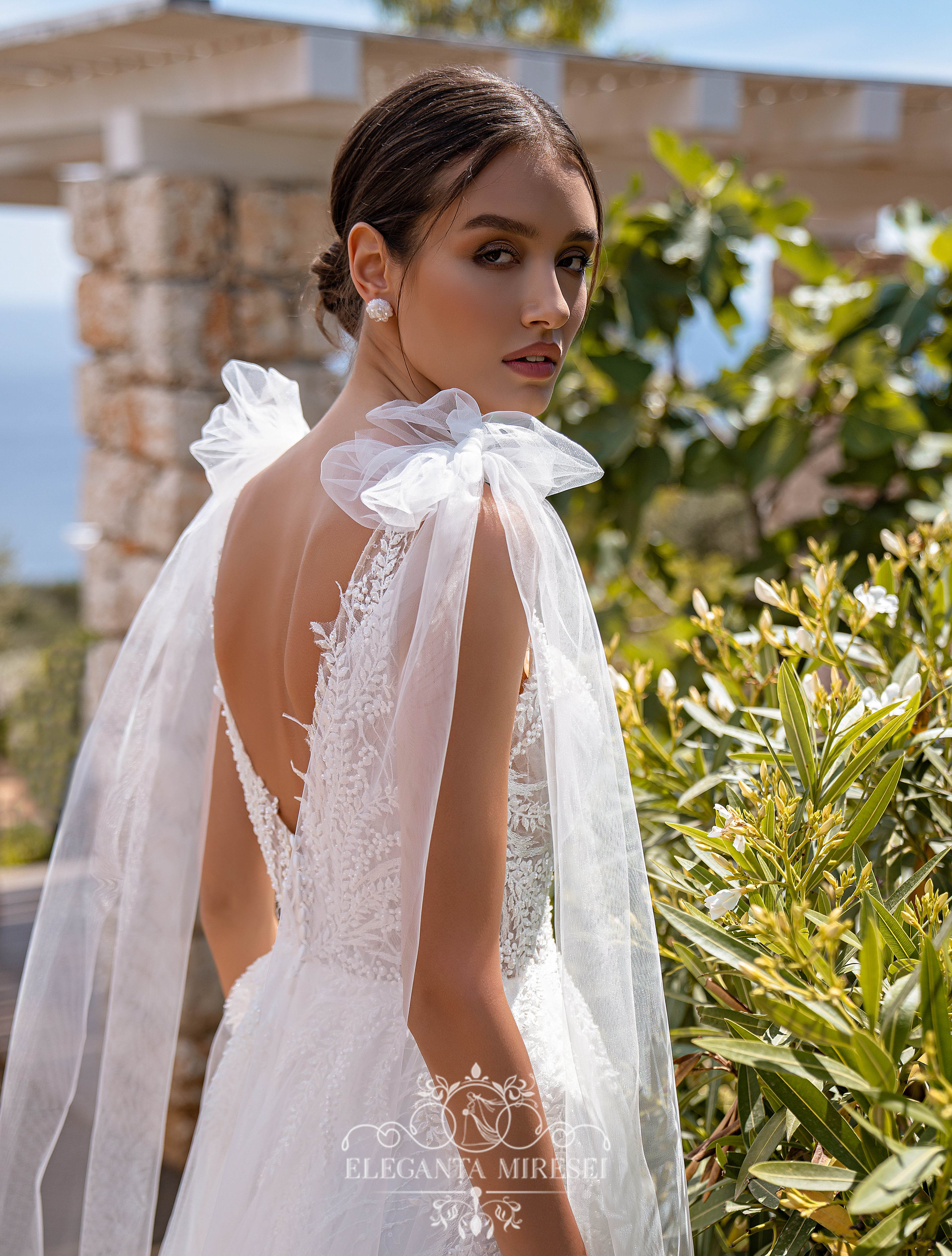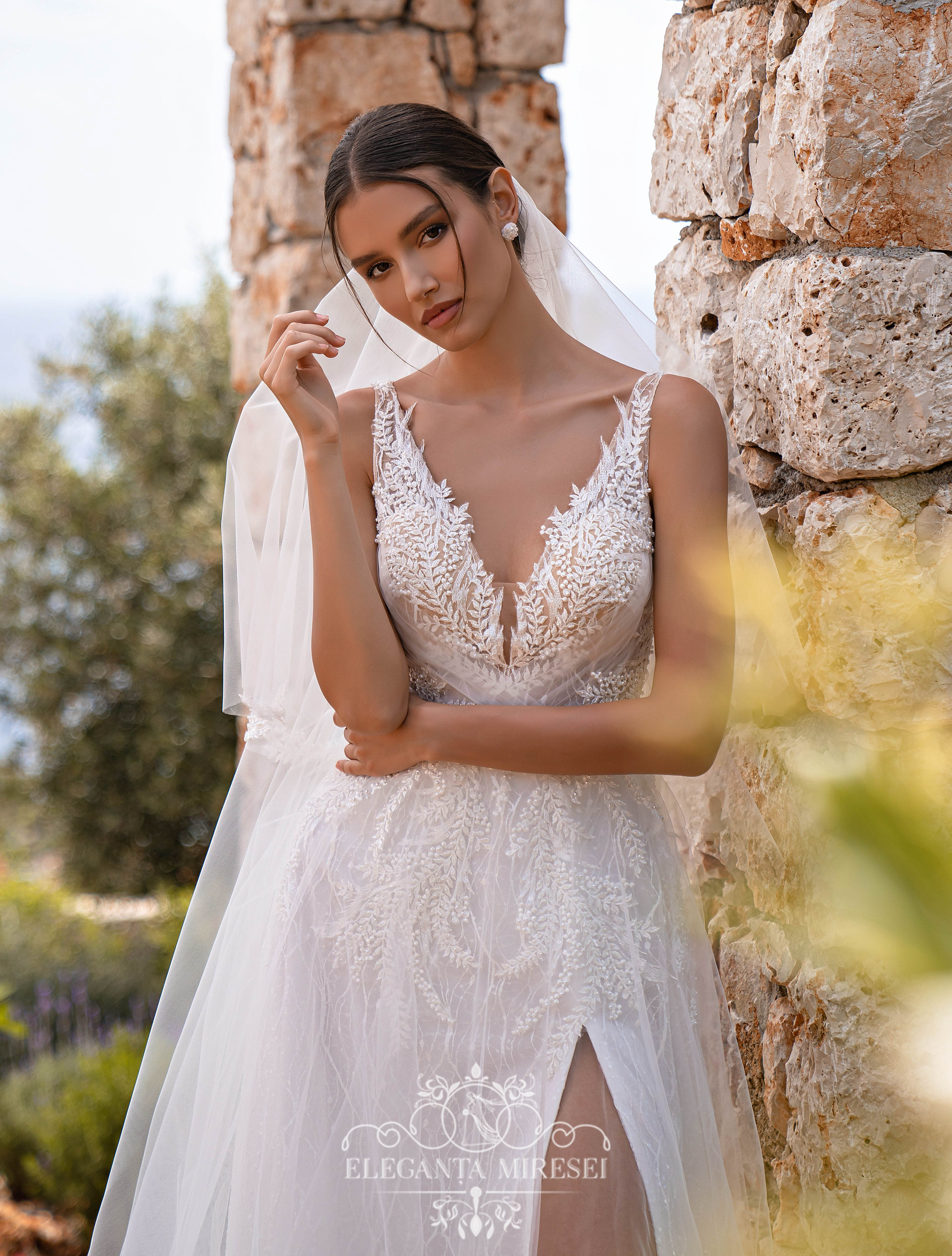 Rochie de mireasă cu bretele și fustă cu trenă. Pe piciorul stâng are crăpătură. În față și în spate, corsetul este împodobit cu un decolteu elegant în „V”. Modelul este realizat din țesătură „crenguță”, brodat cu paiete și decorat cu aplicații brodate cu perle, mărgele și paiete. Elementele din tul oferă o ușurință imaginii. Draperiile pe partea din față a corsetului fac farmec deosebit. Stratul superior al fustei soare dau elegantă modelului și pe umeri se leagă funde detașabile.