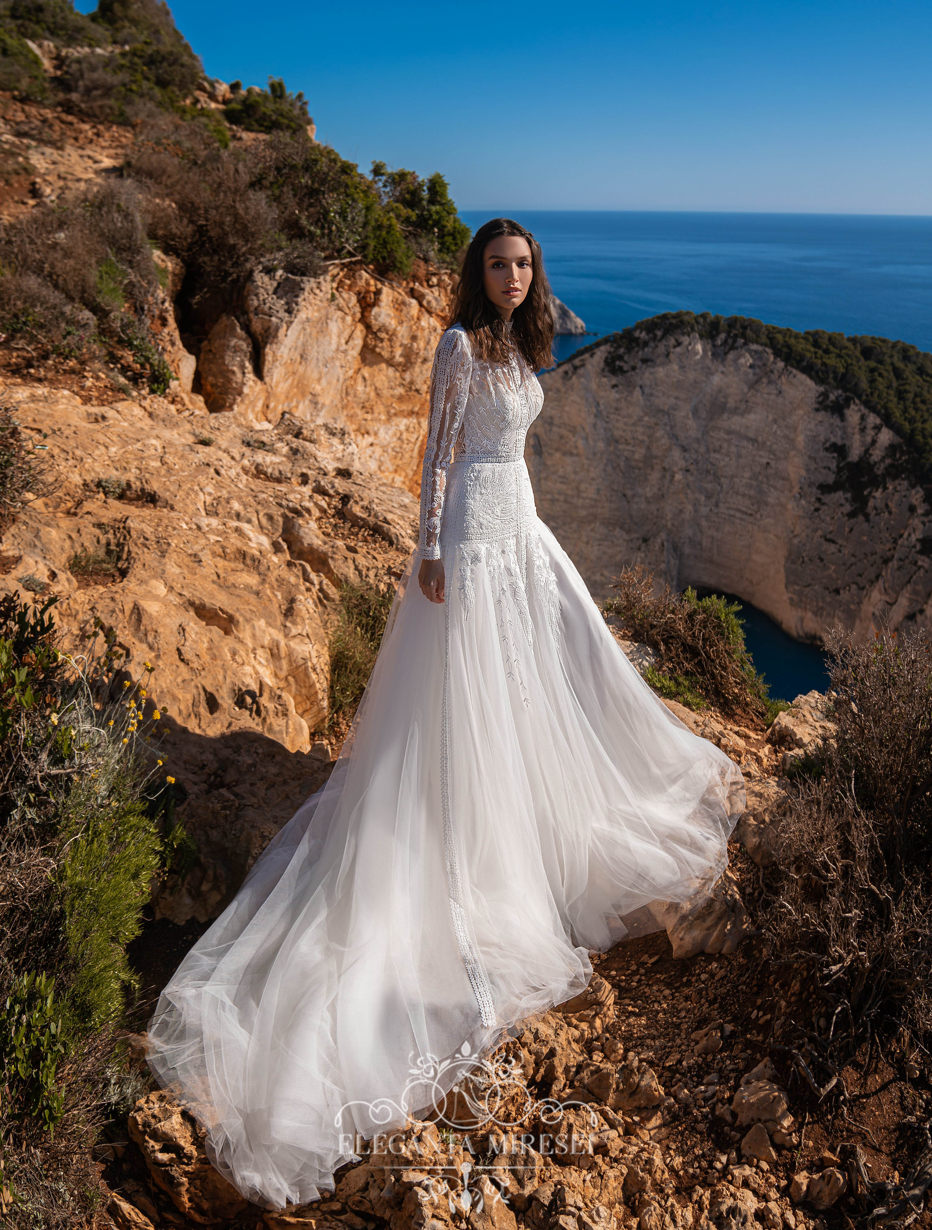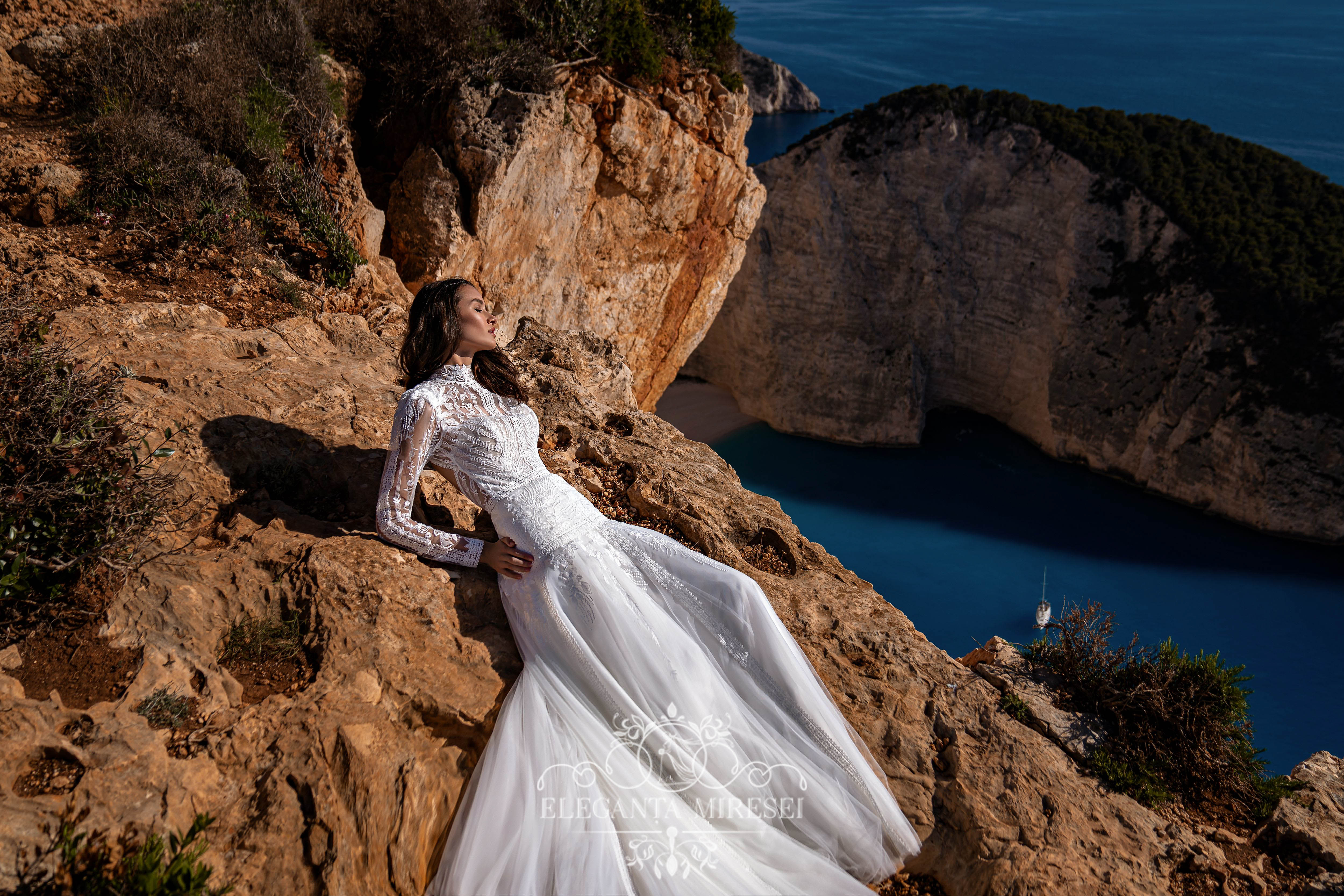 Roche de mireasă sofisticată, stil boho, decorată cu elemente de dantelă și panglică. Corset din dantelă brodată cu paiete care se potrivește foarte frumos cu silueta. Corset cu mâneci lungi și guler. „Punctul culminant” al modelului este partea din spate cu o croială delicată, care se fixează cu nasturi deasupra. O fustă cu trenă care evoluează și conferă un farmec aparte modelului.