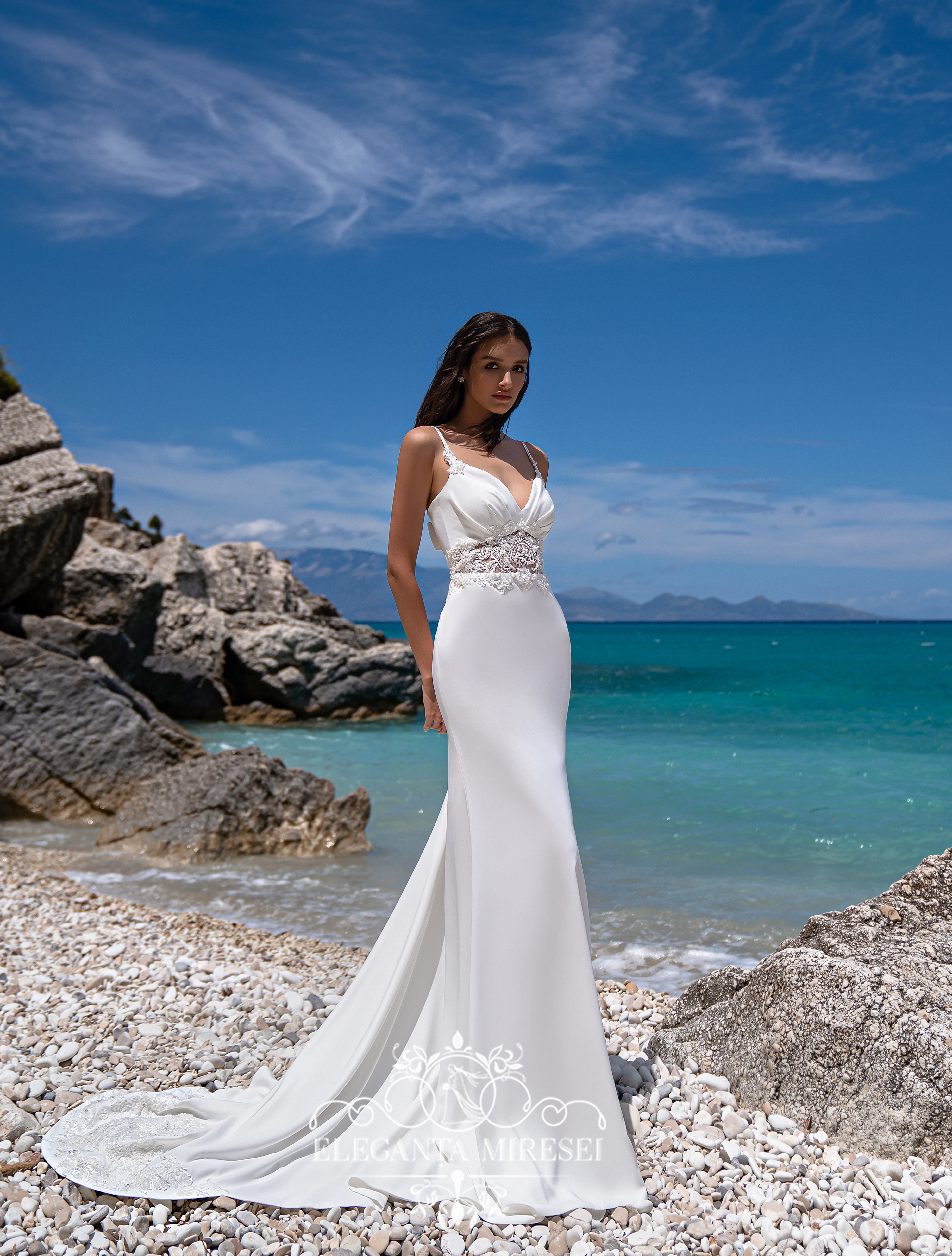 Rochie de mireasă grațioasă, cu siluetă tip sirenă și bretele duble, fusta are trenă luxoasă. Modelul arată foarte elegant datorită țesăturii elastice din care este confecționată rochia. Decupajul sub bust și draperia în formă de rază conferă un aspect aristocratic. Spatele cu croi cret este fixat cu doi nasturi și completat de un element detașabil. Modelul este decorat cu dantelă brodată cu mărgele, perle, cristal și paiete.