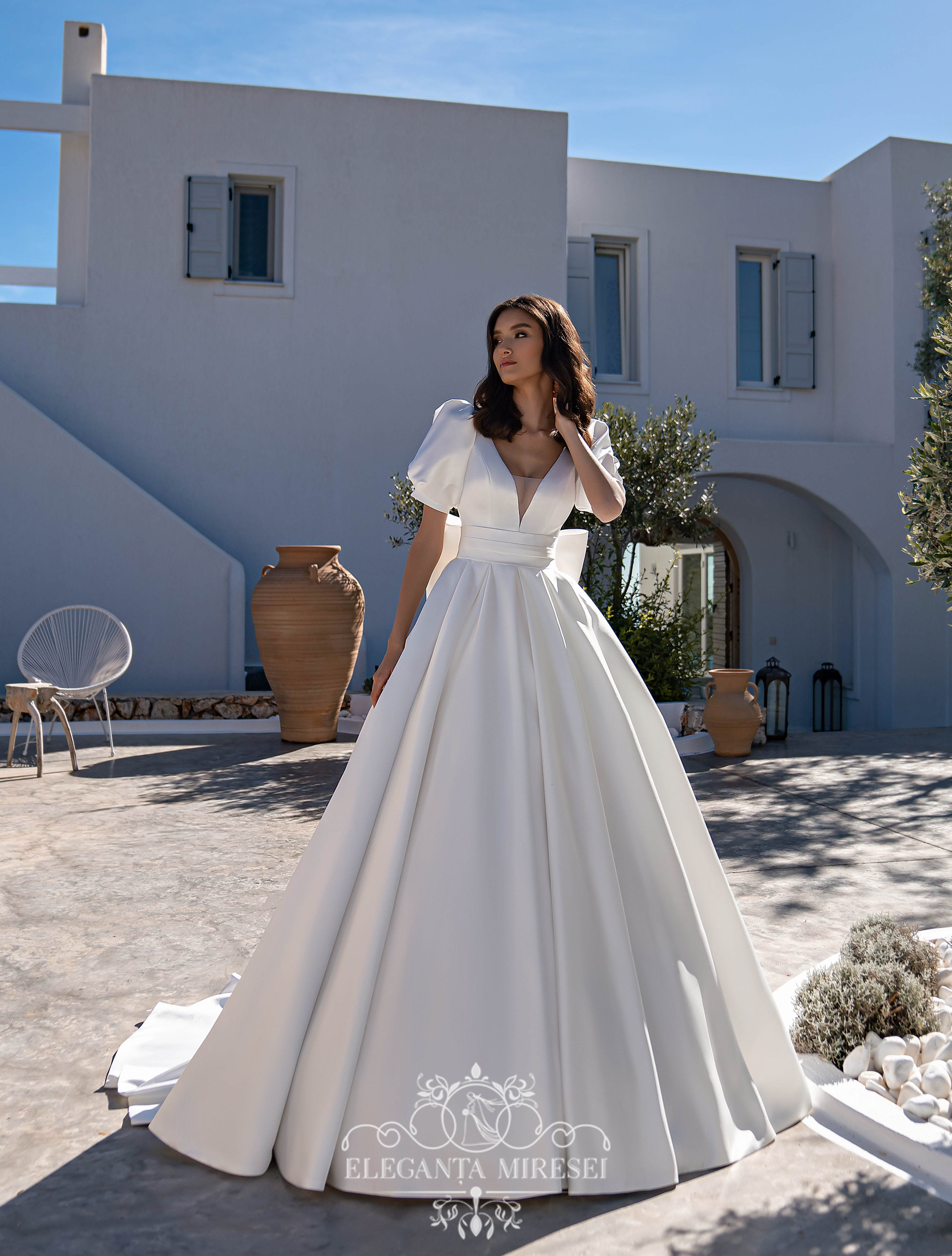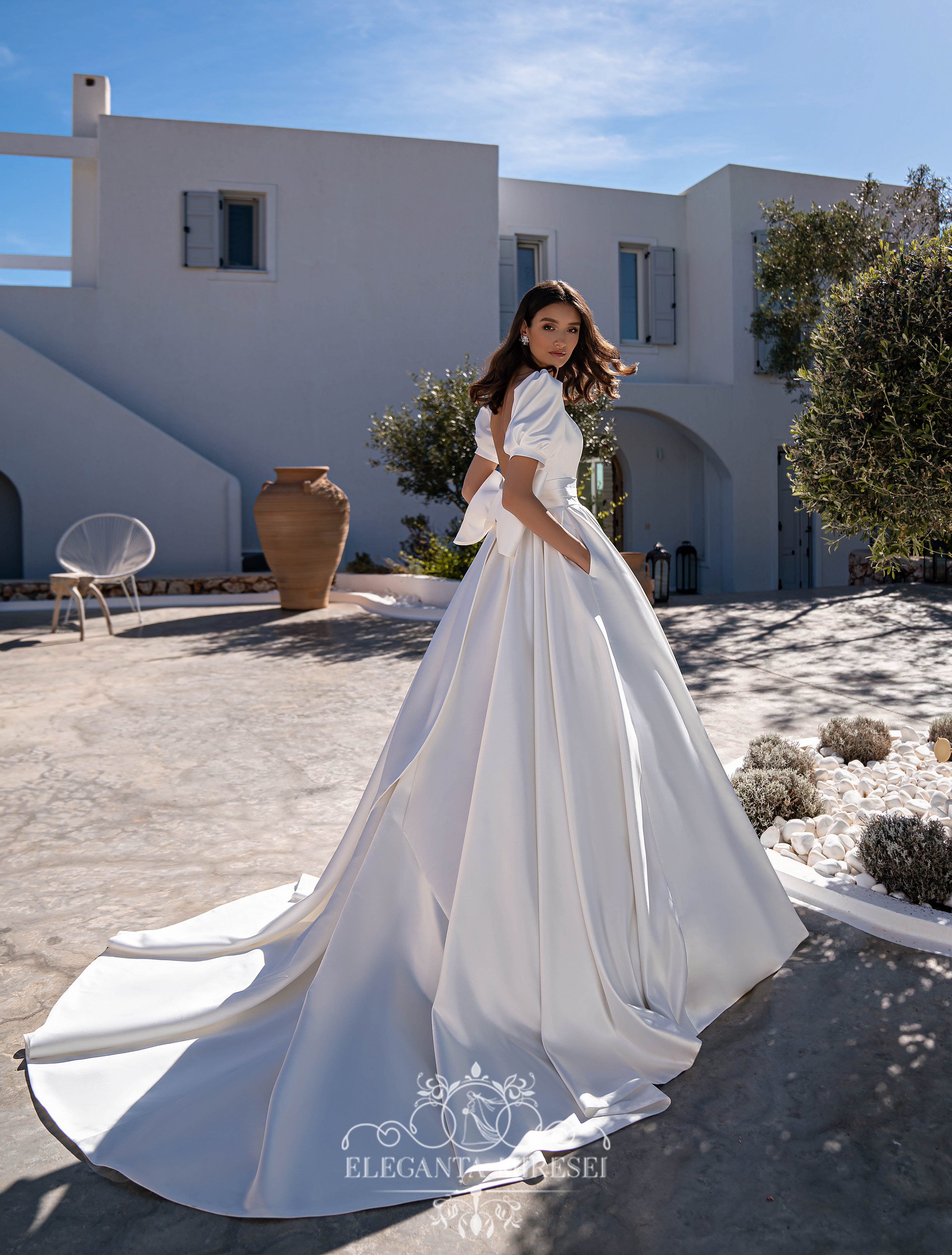 A charming wedding dress in the style of “minimalism”, complemented by a luxurious skirt with a train. Royal satin, from which the dress is made, gives the model aristocracy. A deep neckline in the front, a “square” neckline on the back. Lantern sleeves give it a more princess look. The skirt is big & puffy with pockets sewn in the side seams. Removable bow helps to complement the model.