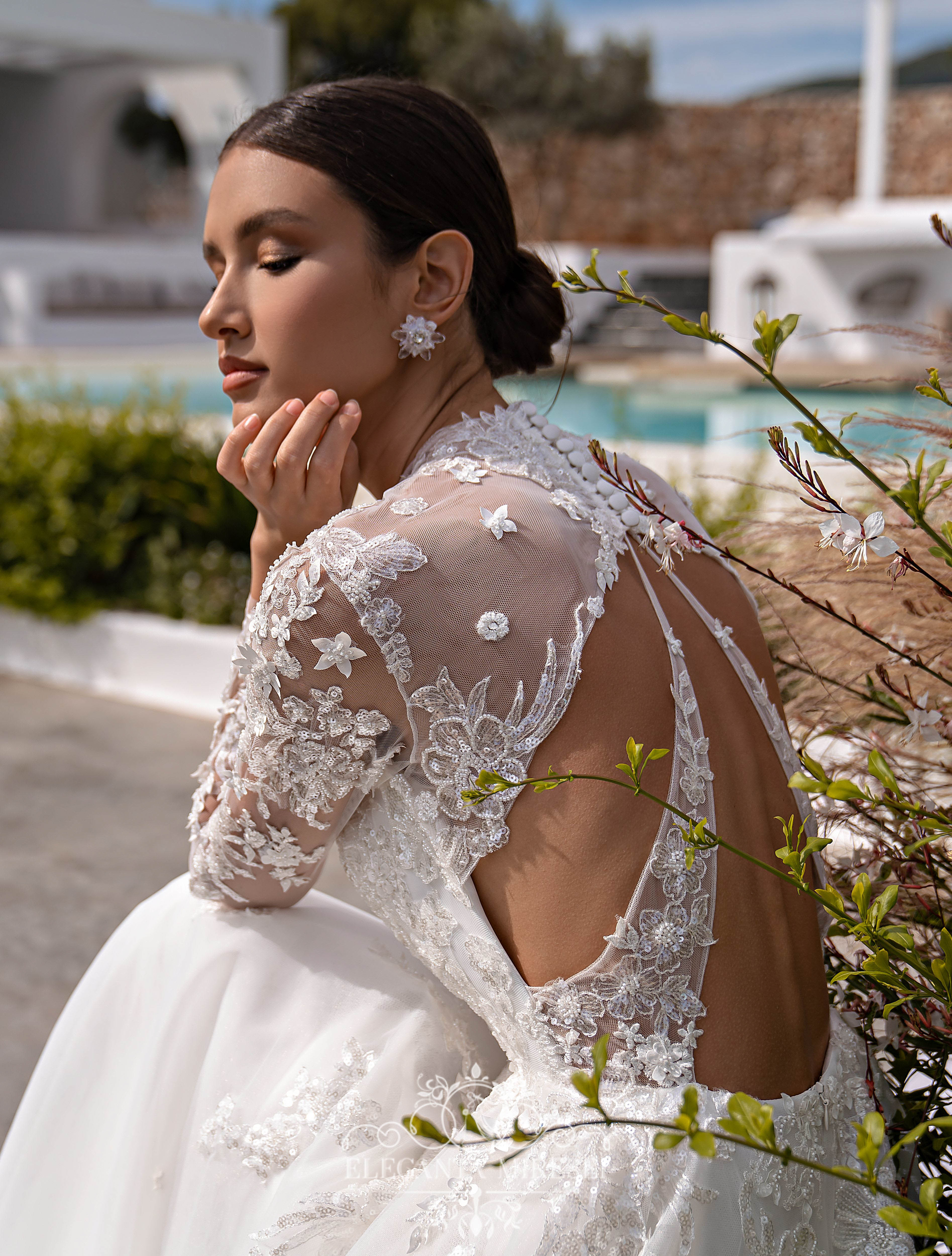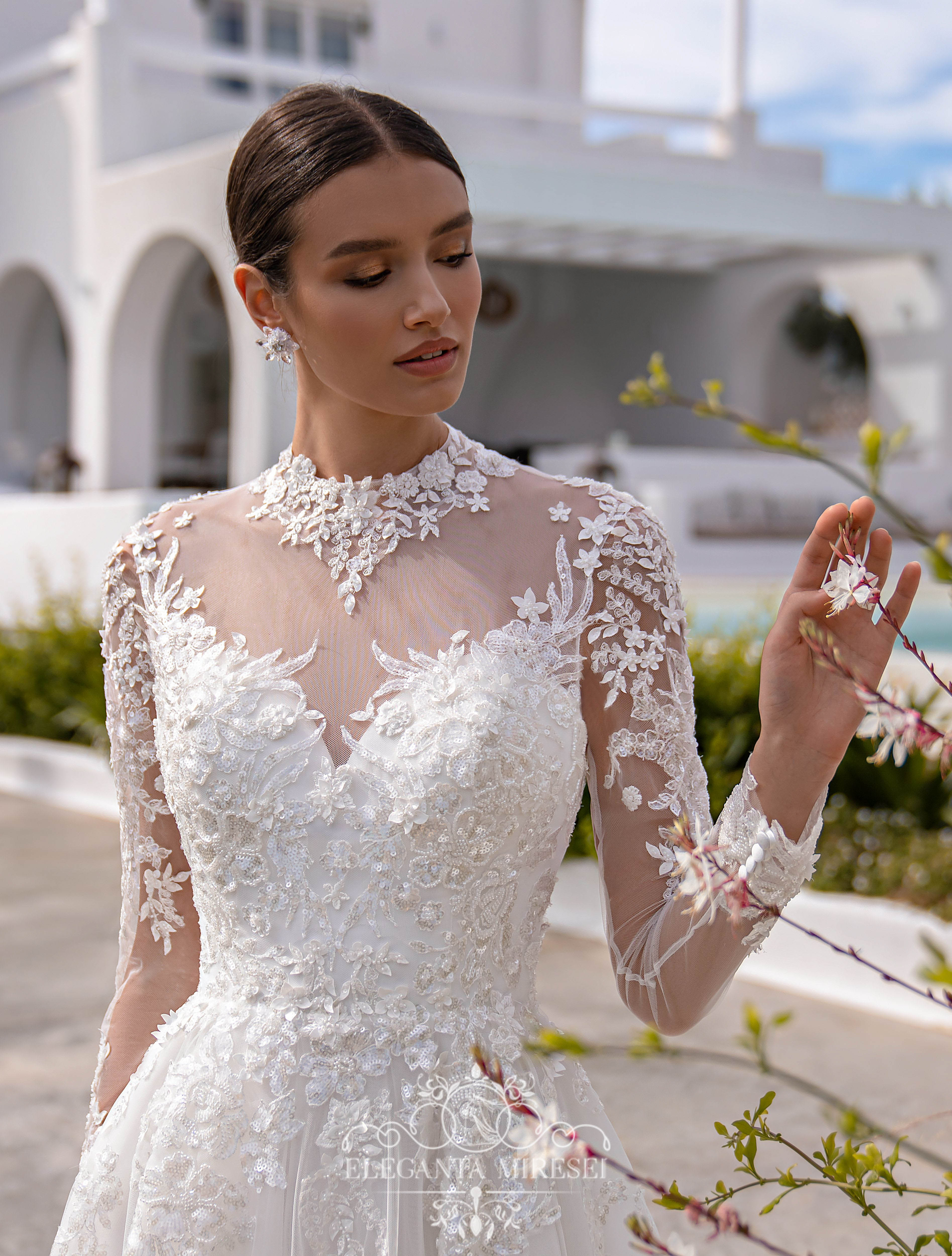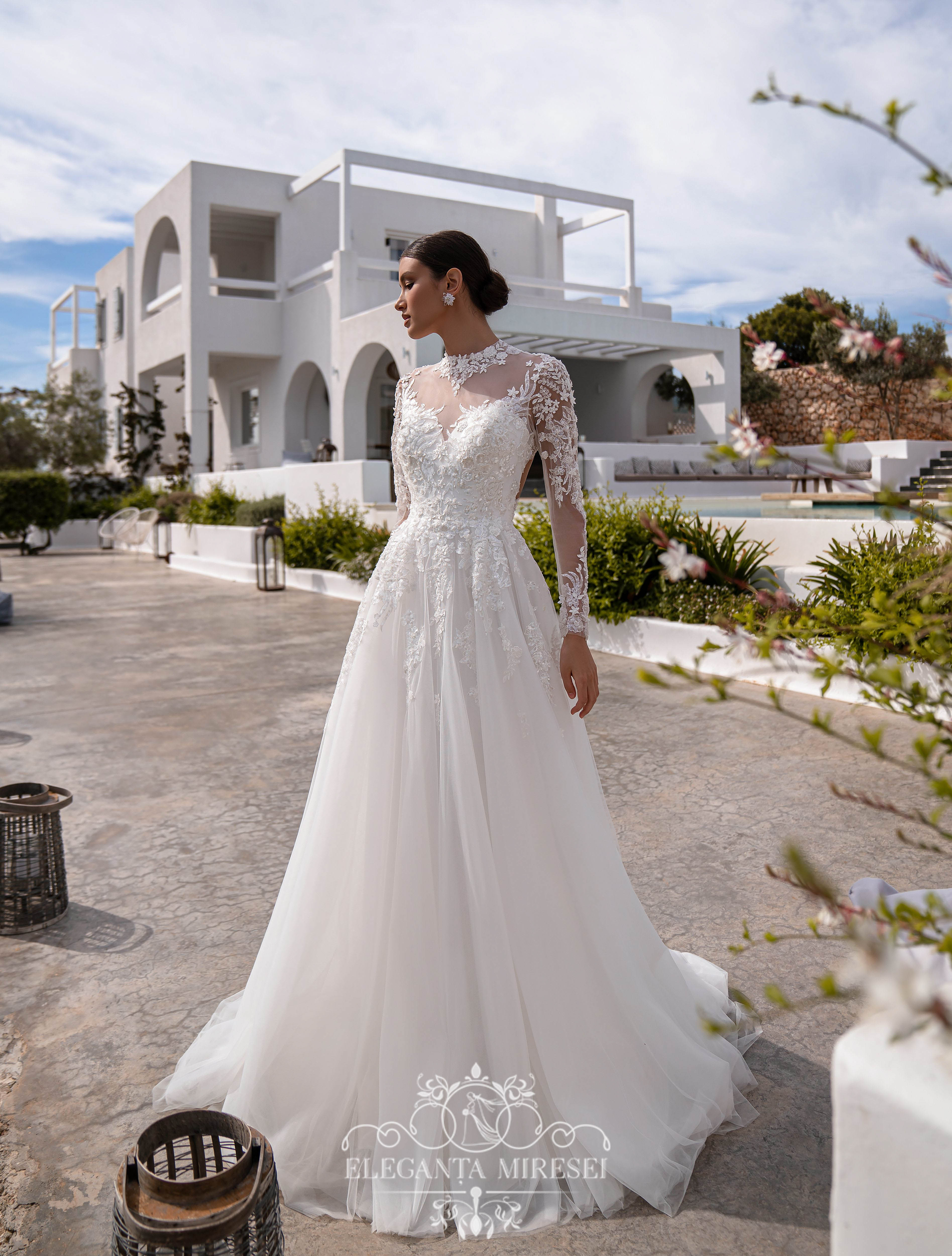 Rochie de mireasă superbă, ușoară, stil prințesă,cu mâneci lungi, guler, și o fustă moale, cu trenă. „Punctul culminant” care conferă modelului originalitate și unicitate este partea din spate, cu o croială neobișnuită. Mânecile lungi se fixează cu nasturi în partea de jos. Modelul este decorat cu două tipuri de dantelă, unul este brodat cu mărgele și paiete, iar celălalt – 3D brodat cu mărgele, paiete și flori mici cu crenguțe