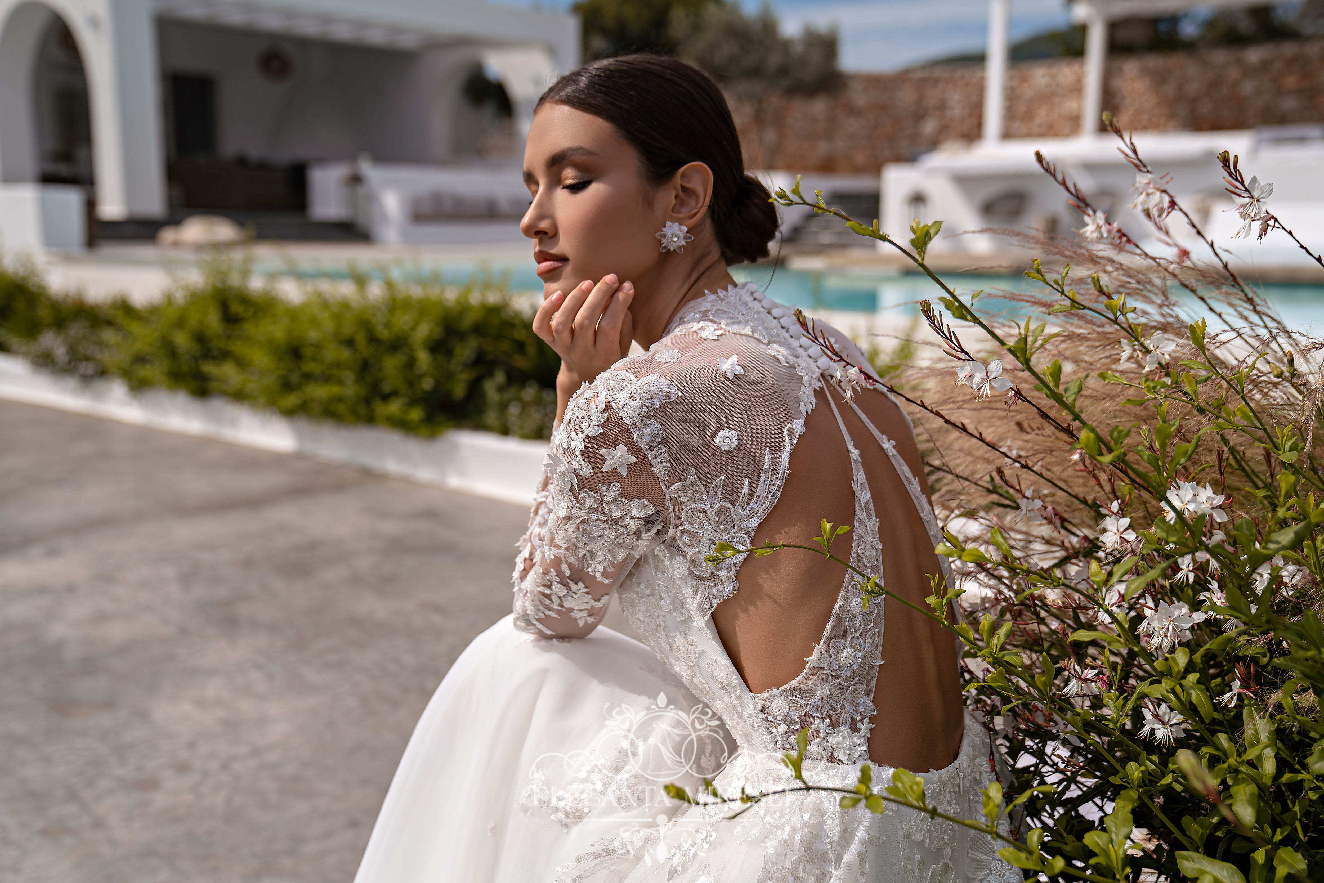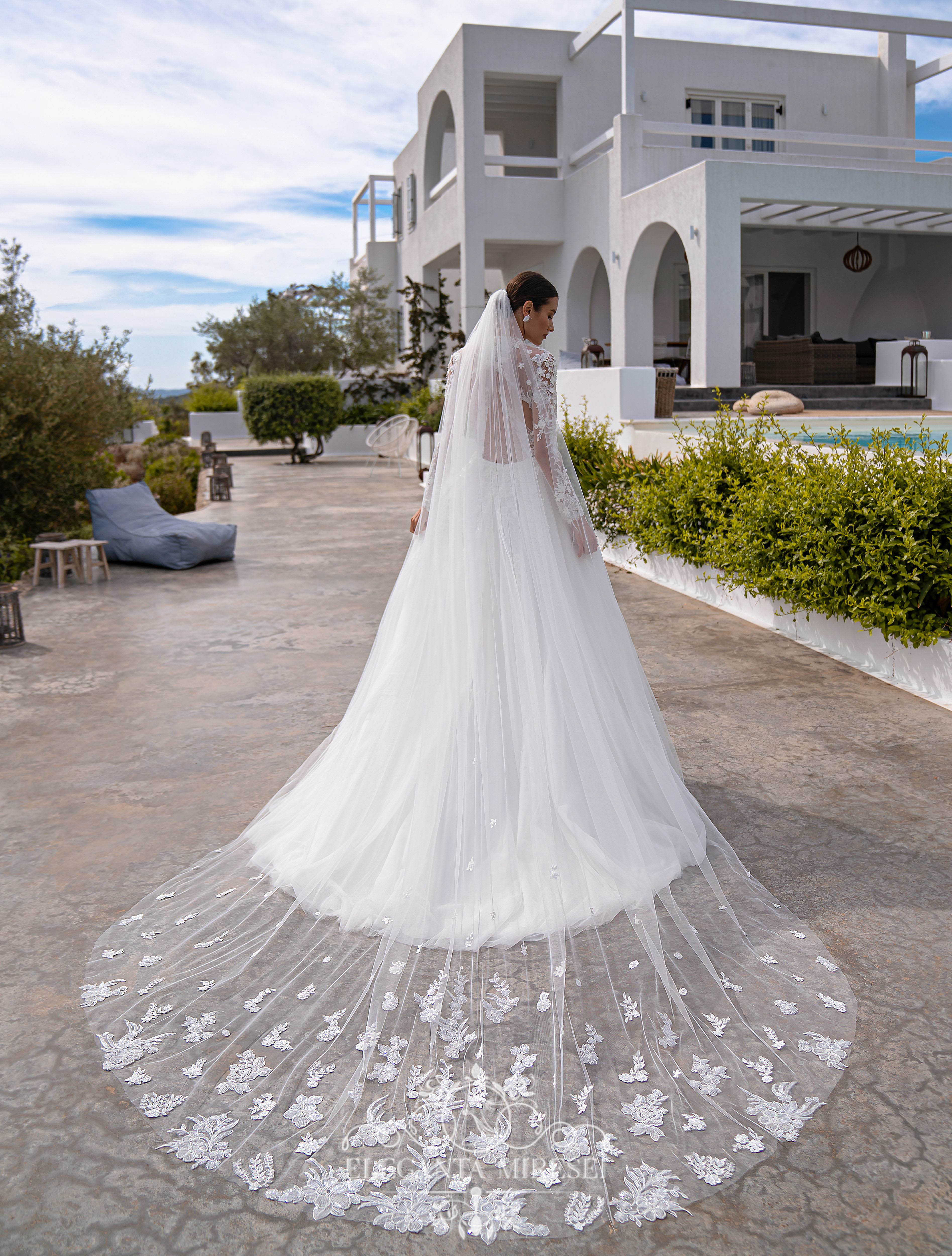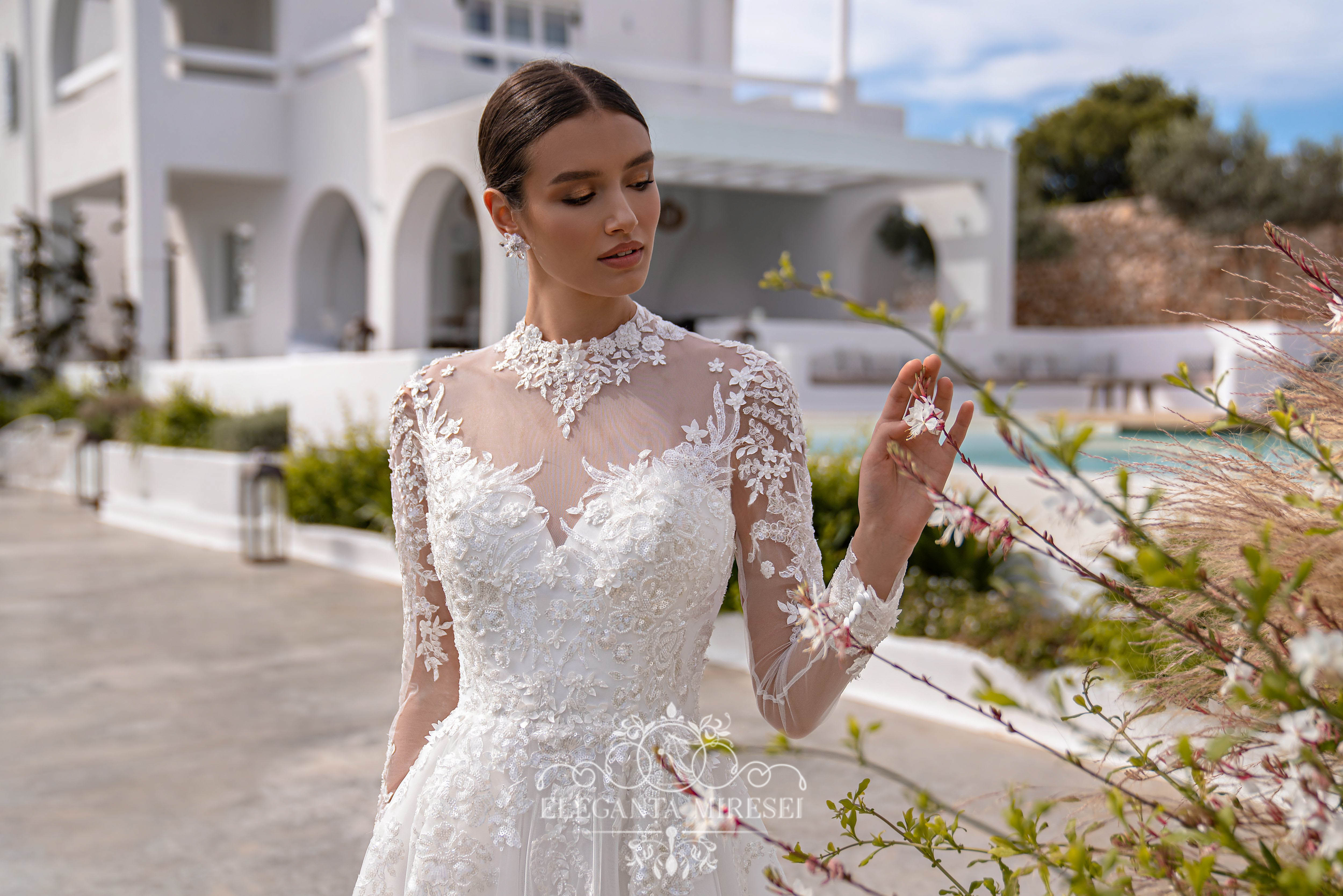 Rochie de mireasă superbă, ușoară, stil prințesă,cu mâneci lungi, guler, și o fustă moale, cu trenă. „Punctul culminant” care conferă modelului originalitate și unicitate este partea din spate, cu o croială neobișnuită. Mânecile lungi se fixează cu nasturi în partea de jos. Modelul este decorat cu două tipuri de dantelă, unul este brodat cu mărgele și paiete, iar celălalt – 3D brodat cu mărgele, paiete și flori mici cu crenguțe
