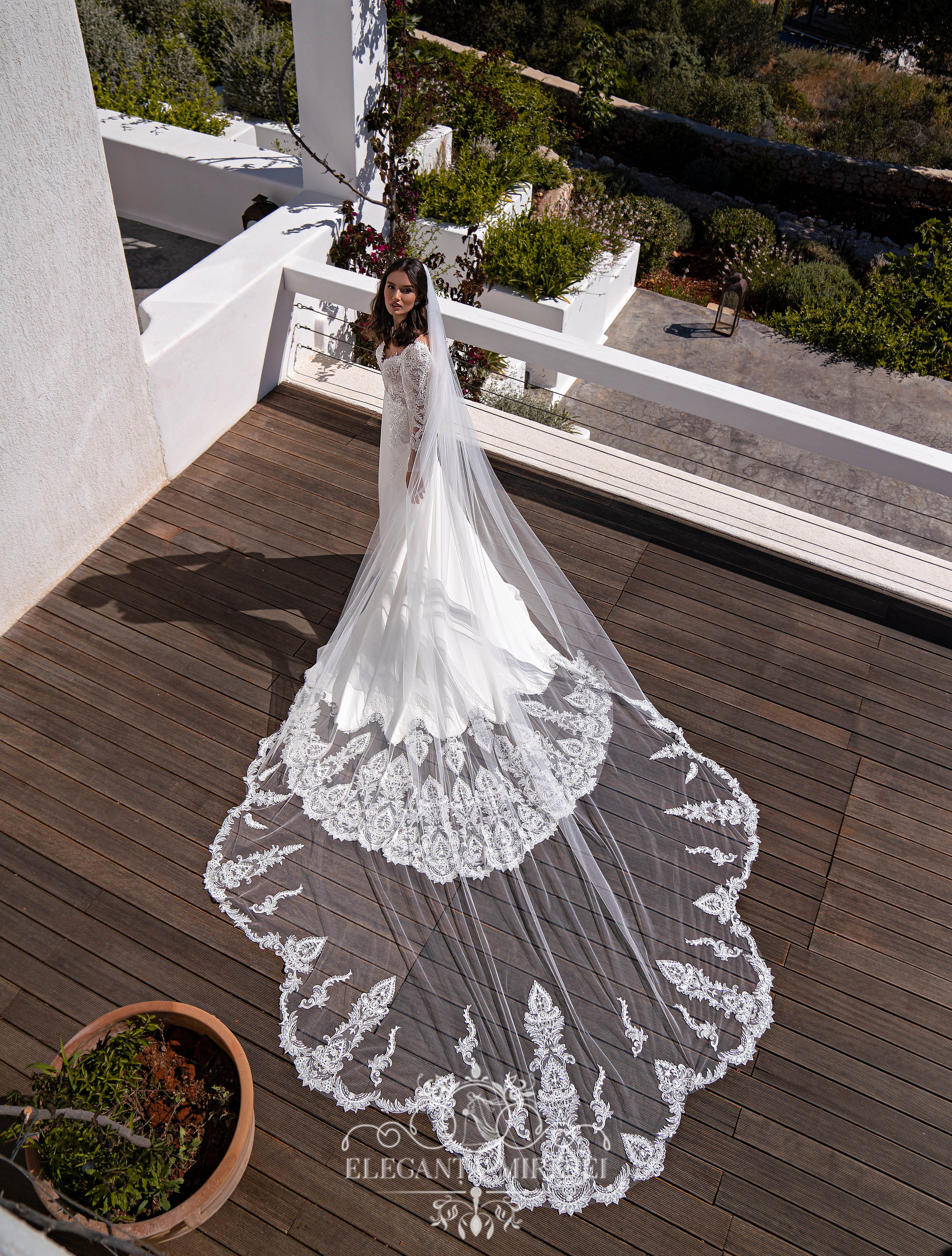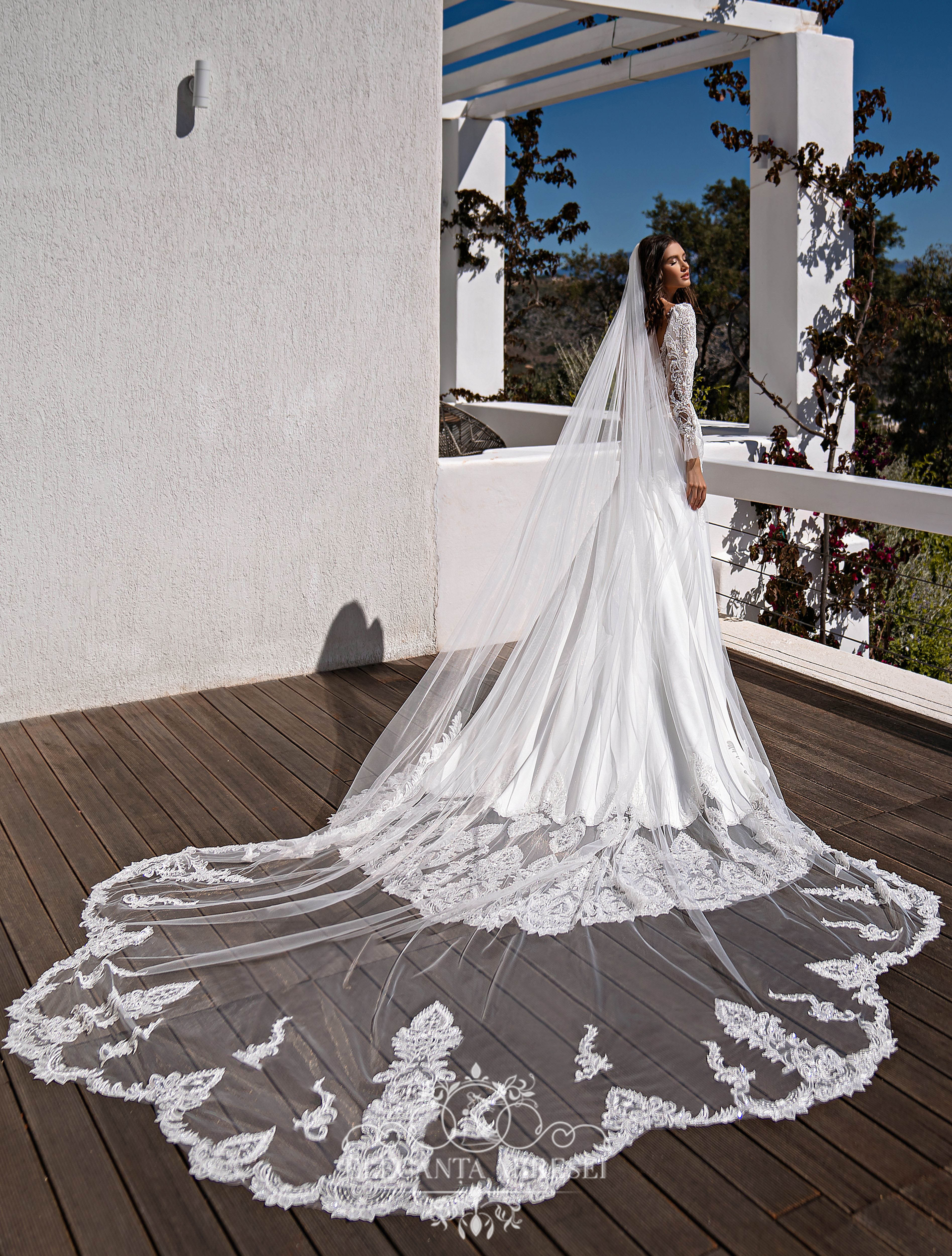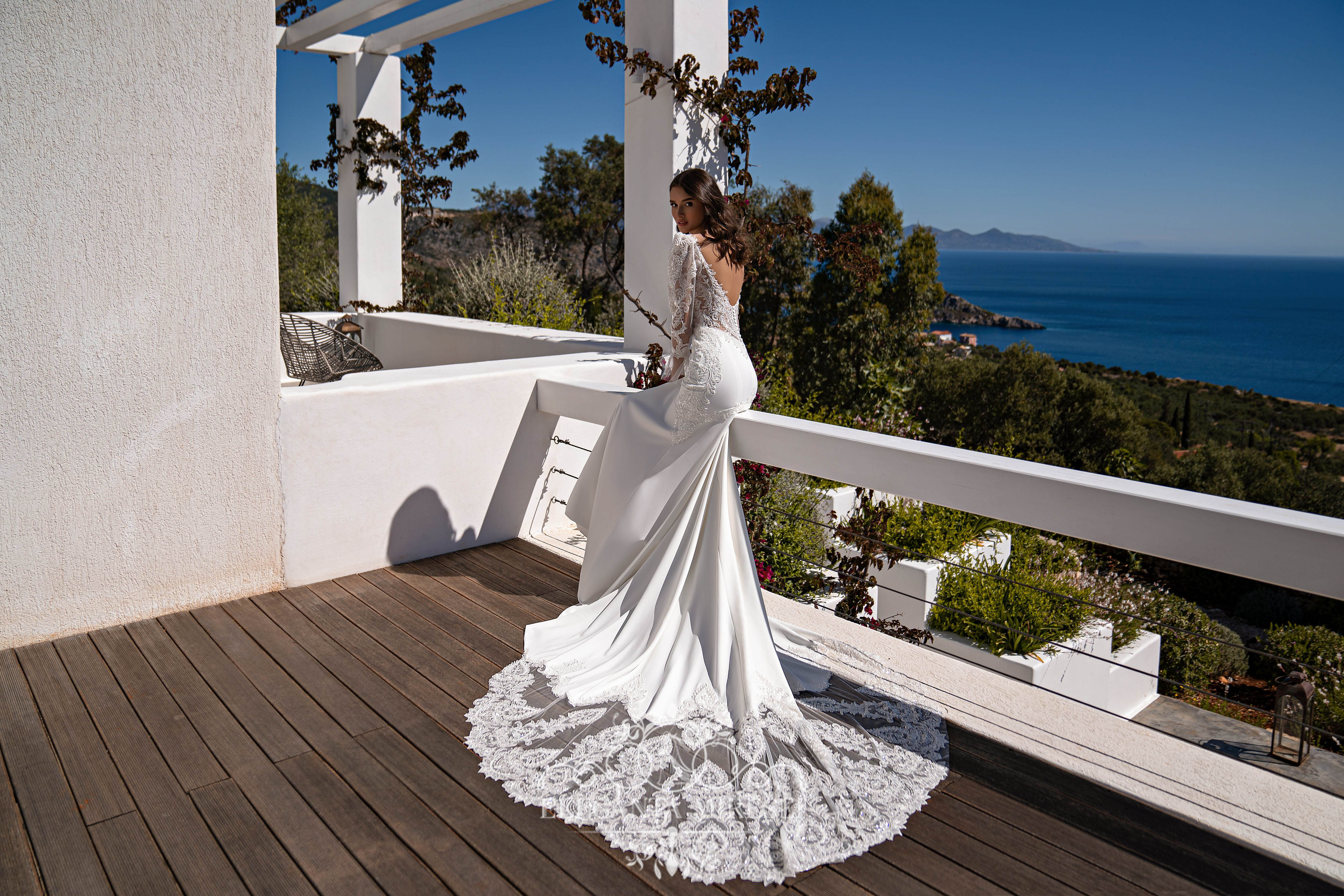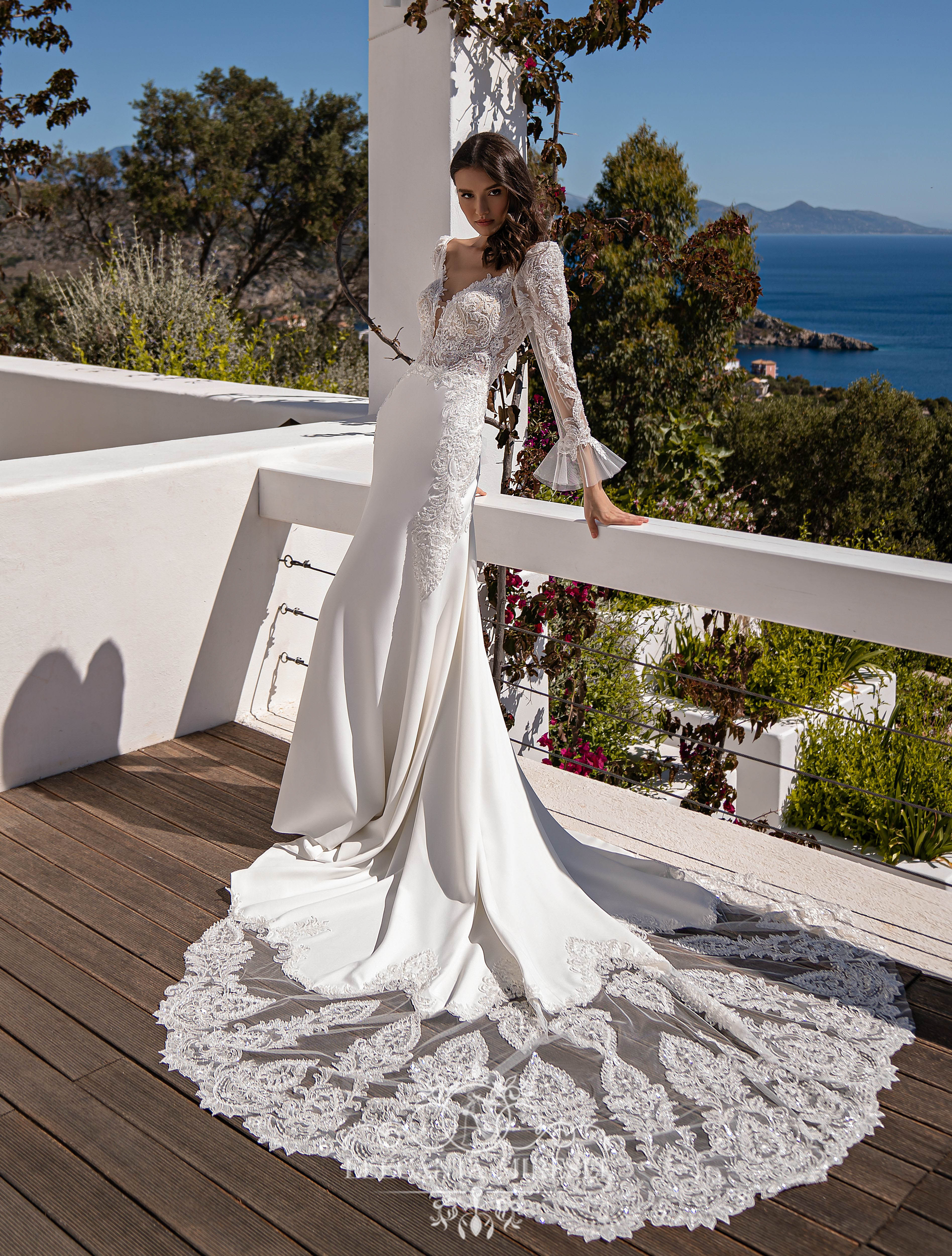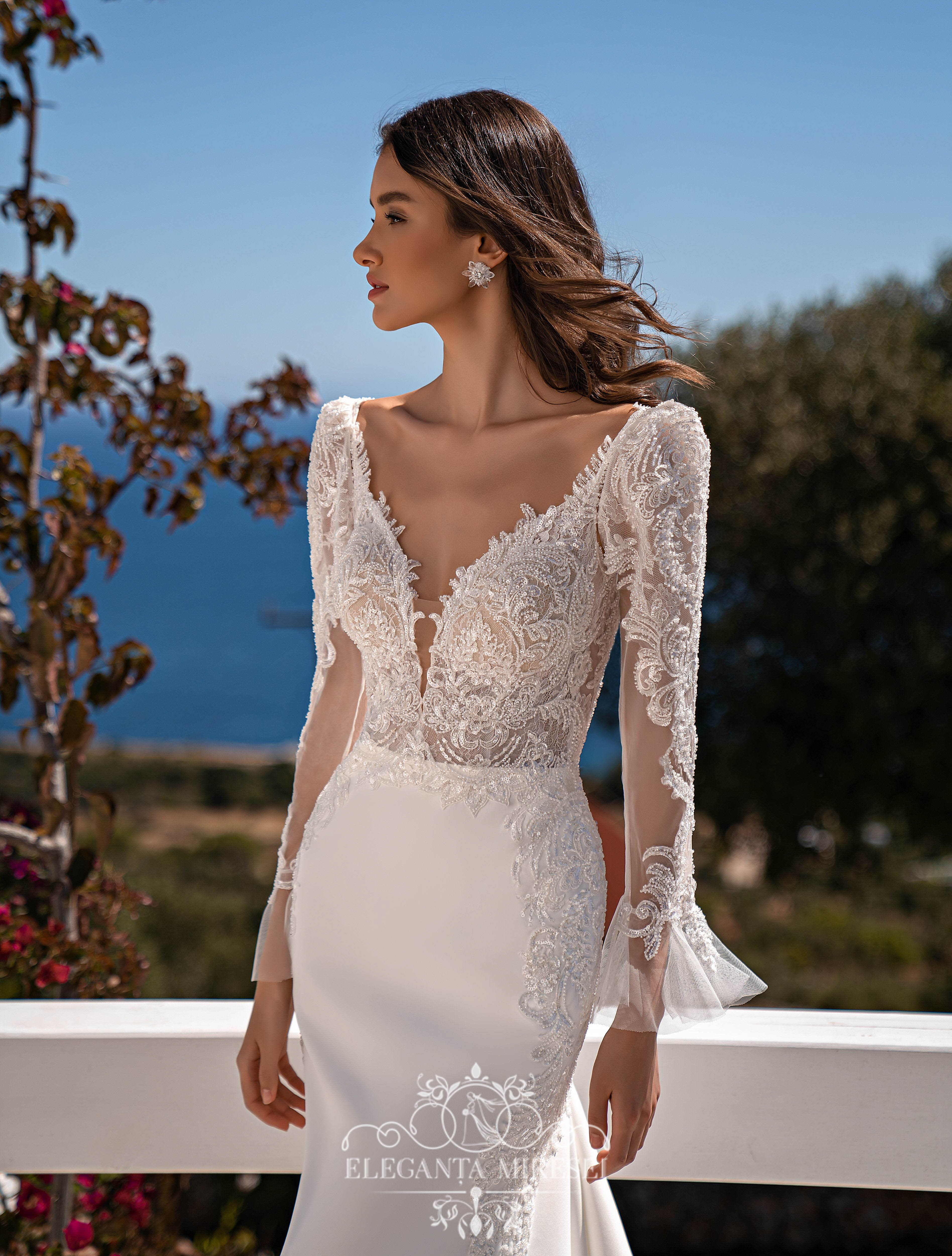 Rochie de mireasă încântătoare, stil sirenă, cu trenă și mâneci detașabile. Corsetul este transparent, cu bretele și un decolteu adîncit în partea din față. Partea din spate este în formă de „v” cu o adâncitură în fustă. La rochie sunt atașate mâneci detașabile grațioase, cloșate în partea de jos. Fusta este confecționată din crep elastic cu reliefuri și reșilieu în partea de jos, și o trenă decorată deosebit de frumos. Modelul este decorat cu dantelă brodată cu mărgele și paiete.
