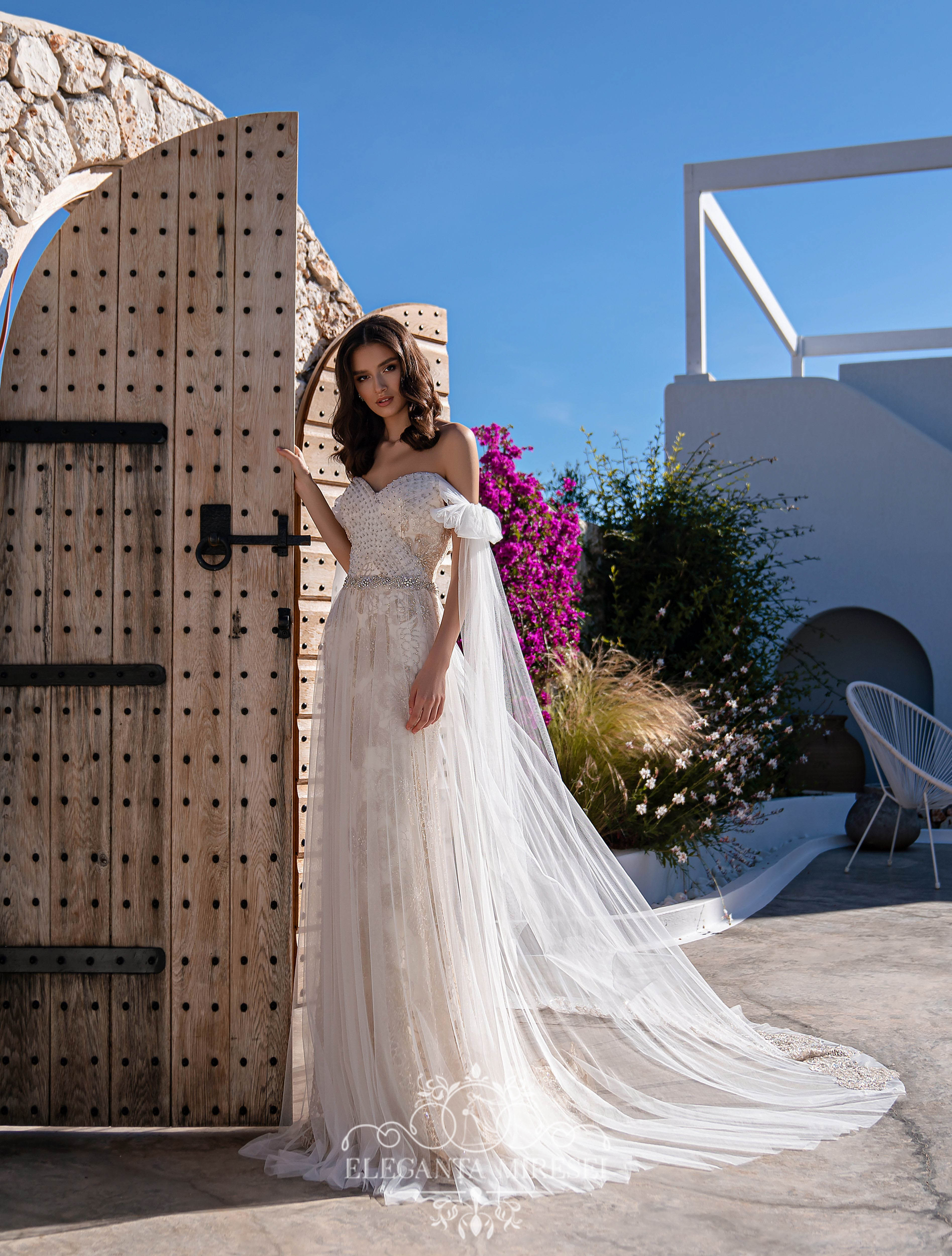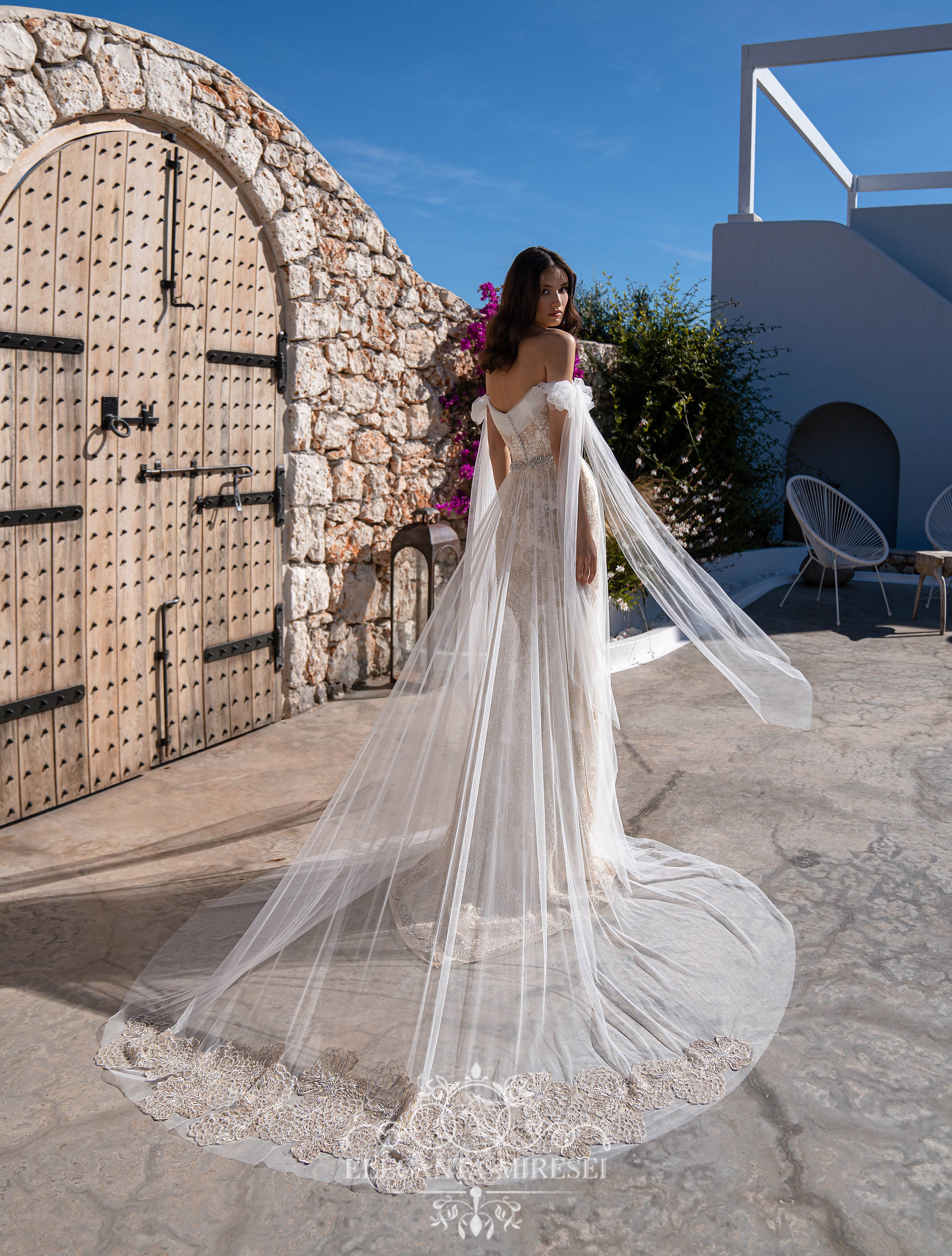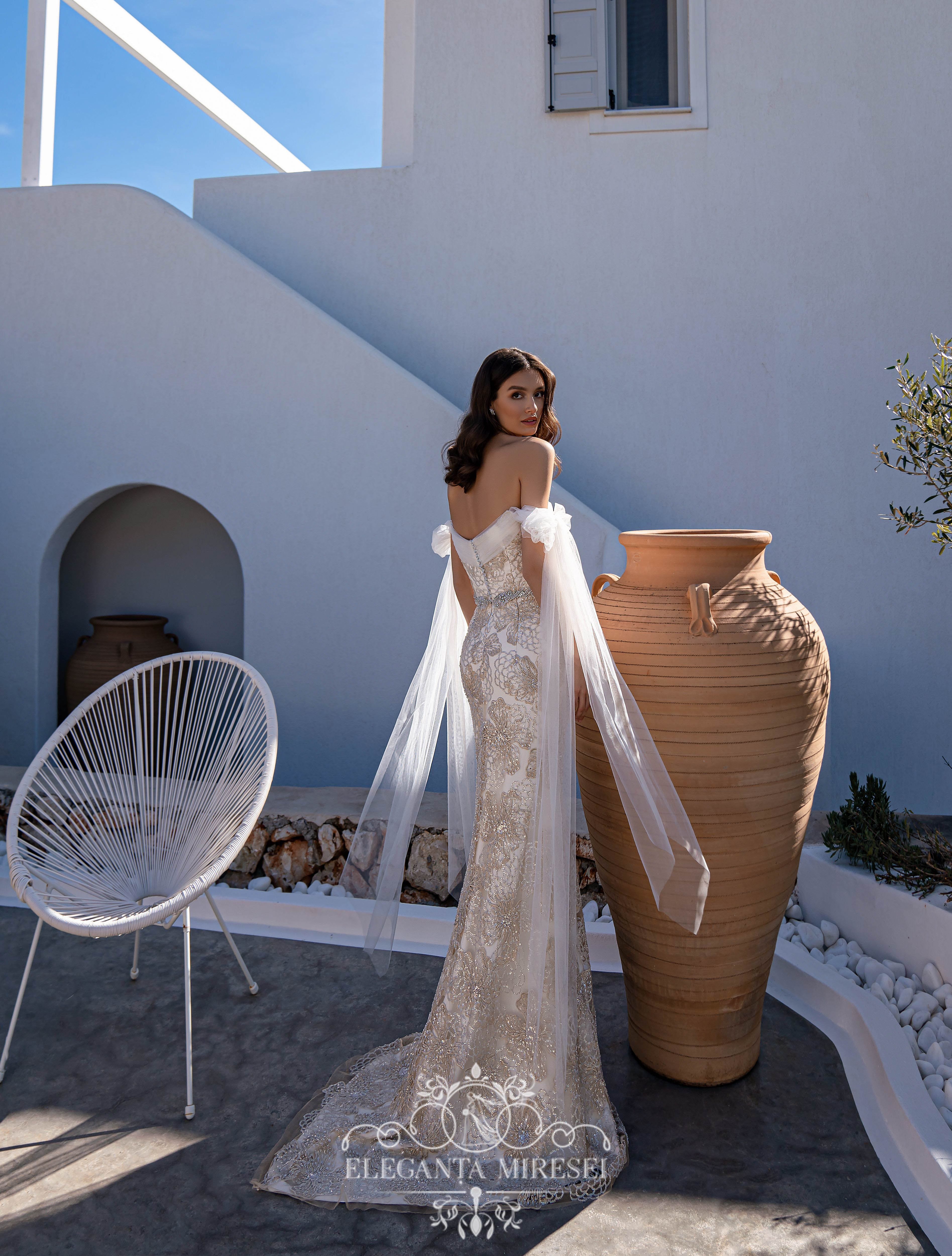 Un set de nunta minunat, format dintr-o rochie din dantelă si o fusta detasabila cu trenă. Rochia este luxoasă datorită efectului culorii aurii pe o bază cremă, care se potrivește uimitor cu silueta. Corsetul cu draperie din tiul este brodat cu mărgele și pietre argintii. Draperia miraculoasă se transformă în funde pe mini. Spatele este închis cu un rând de nasturi argintii. O fustă detașabilă superbă realizată din tiul fin adaugă ușurință imaginii. La talie, rochia este completată cu un cordon în stil „indian”, brodată cu mărgele, pietre și paiete.