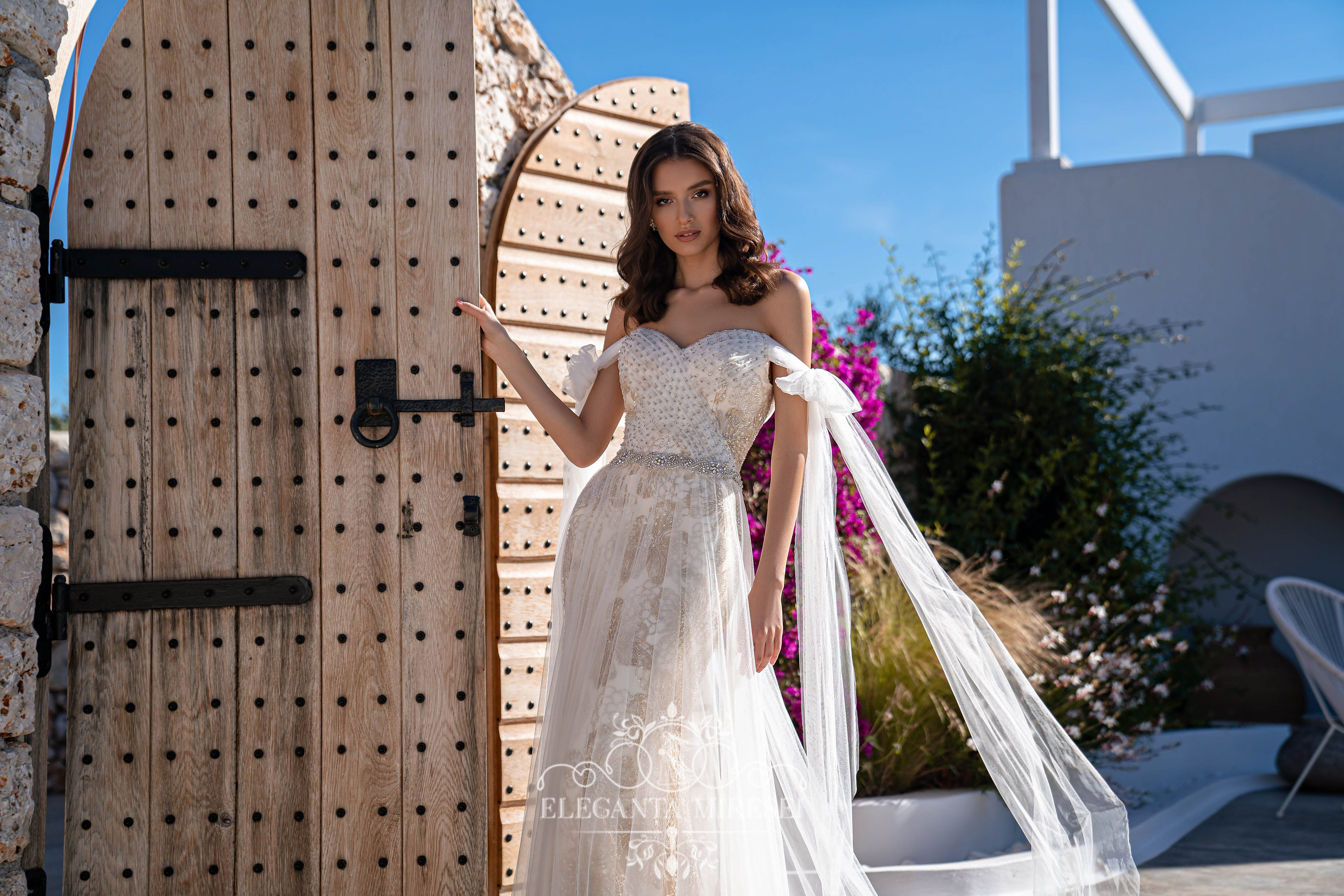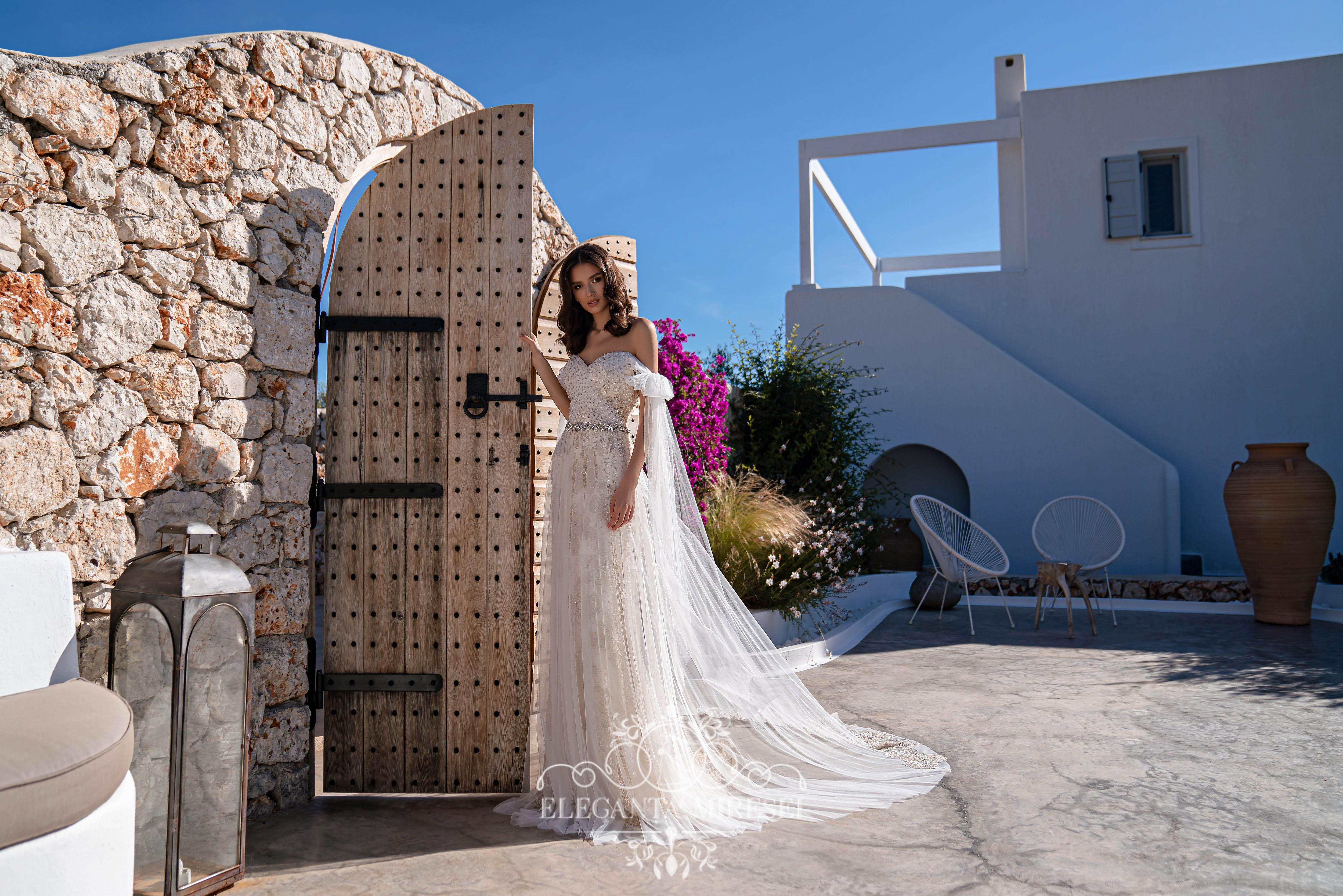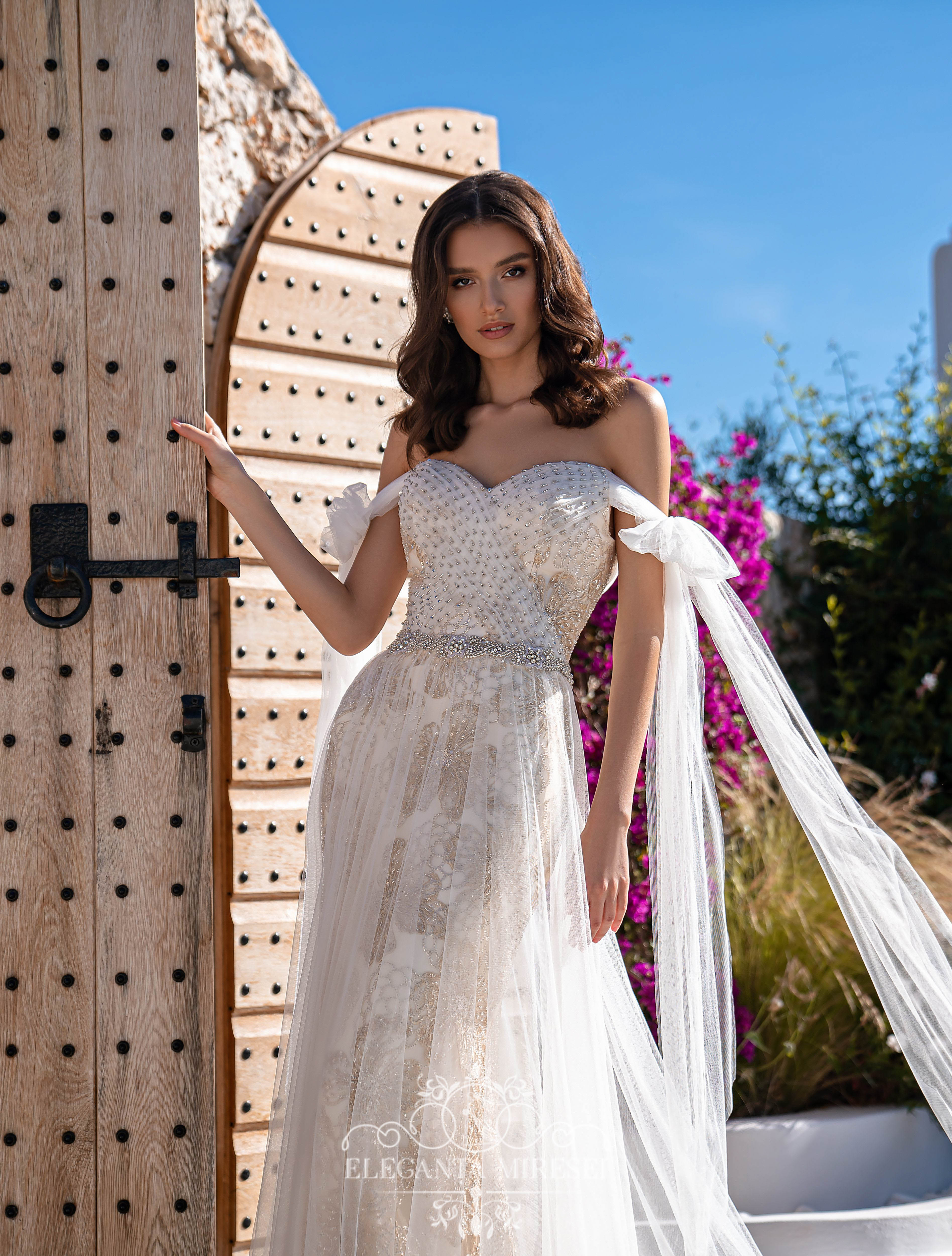 Un set de nunta minunat, format dintr-o rochie din dantelă si o fusta detasabila cu trenă. Rochia este luxoasă datorită efectului culorii aurii pe o bază cremă, care se potrivește uimitor cu silueta. Corsetul cu draperie din tiul este brodat cu mărgele și pietre argintii. Draperia miraculoasă se transformă în funde pe mini. Spatele este închis cu un rând de nasturi argintii. O fustă detașabilă superbă realizată din tiul fin adaugă ușurință imaginii. La talie, rochia este completată cu un cordon în stil „indian”, brodată cu mărgele, pietre și paiete.