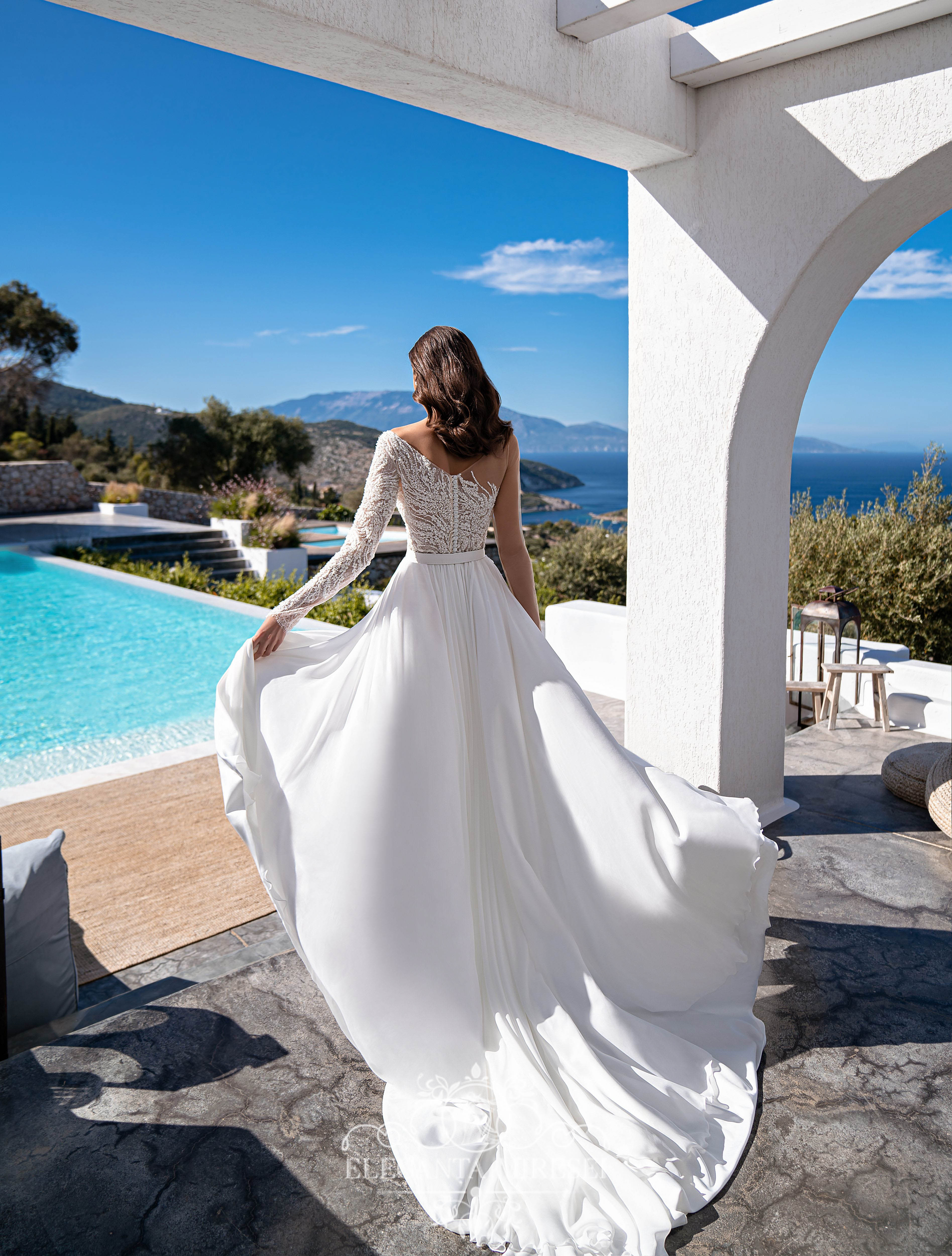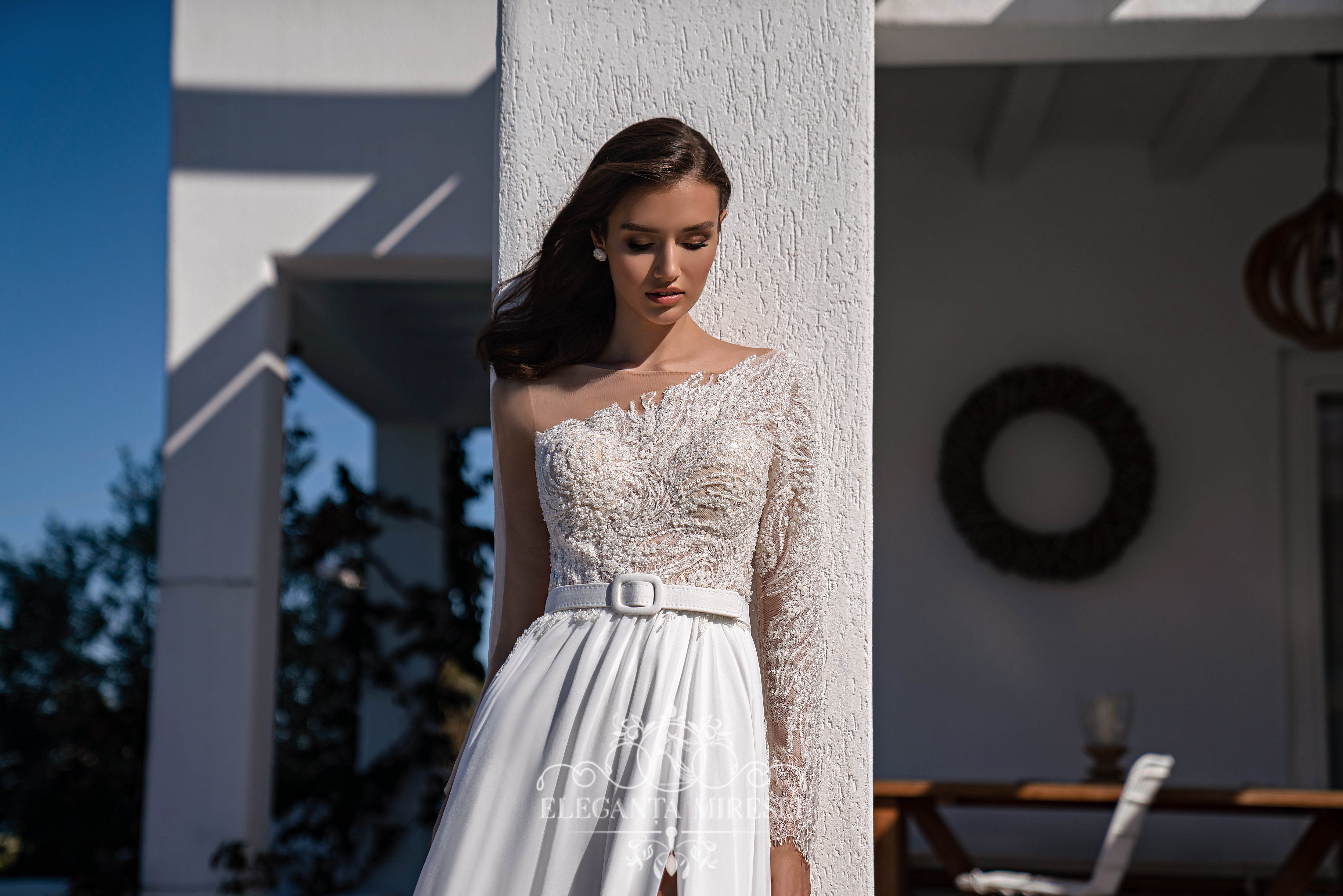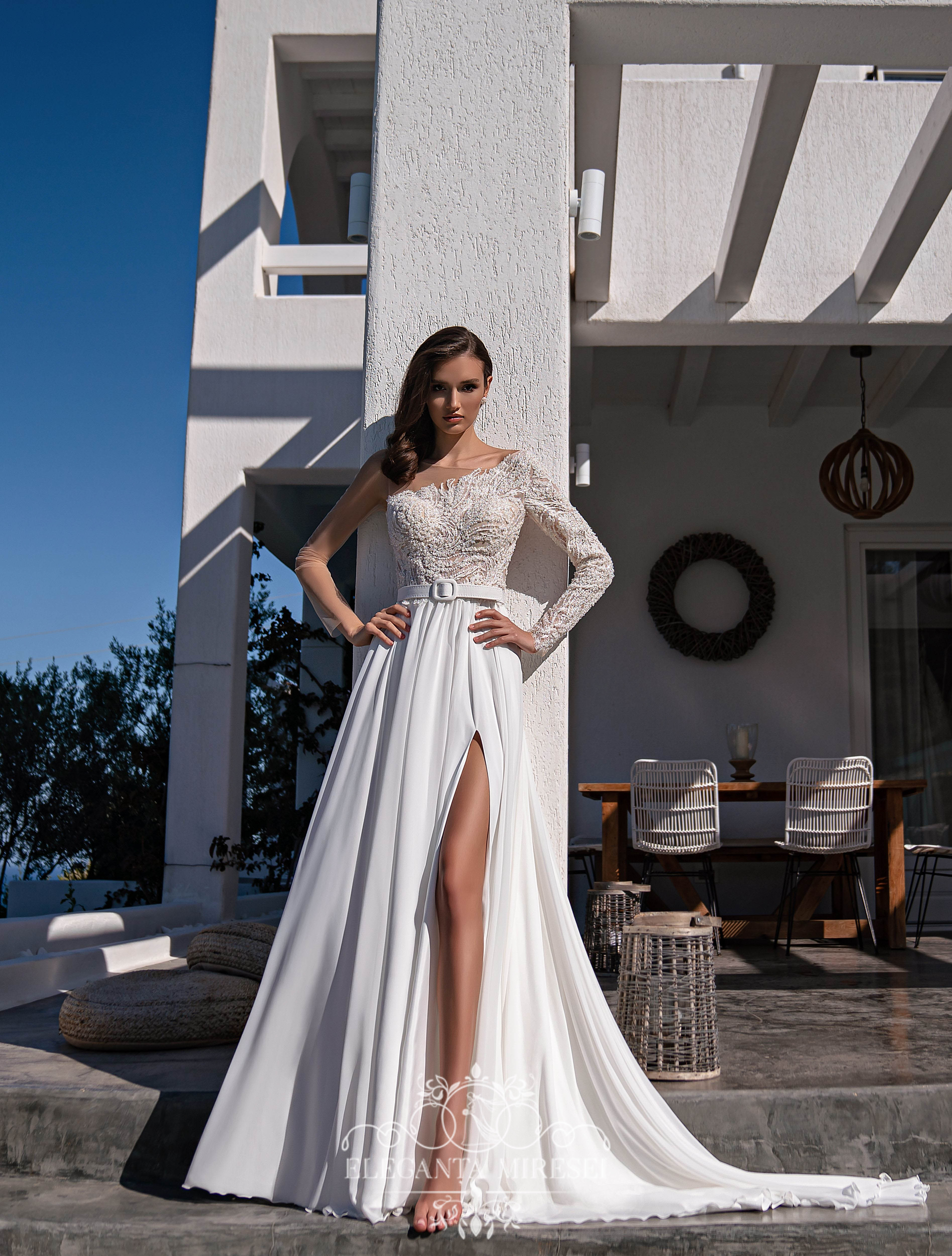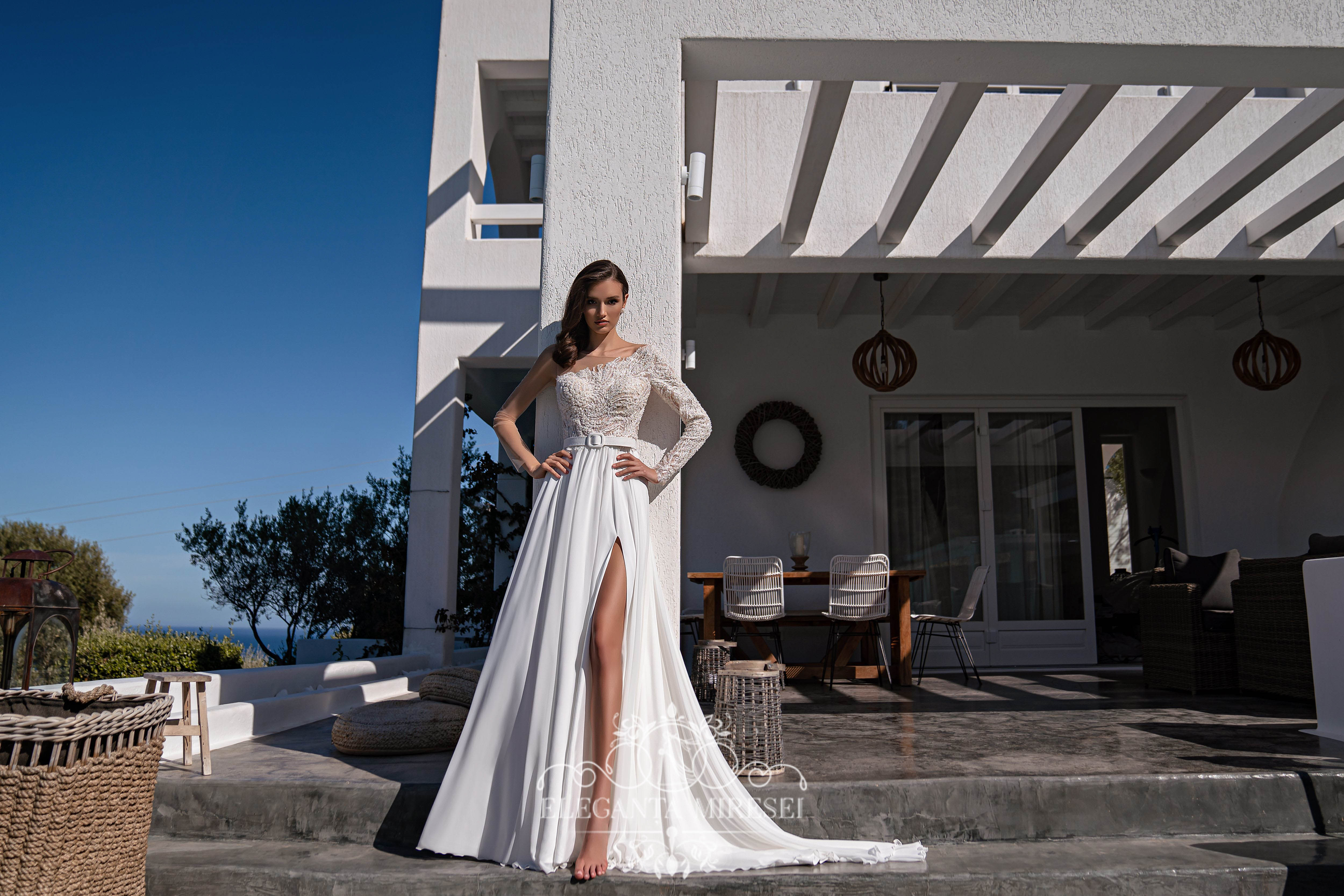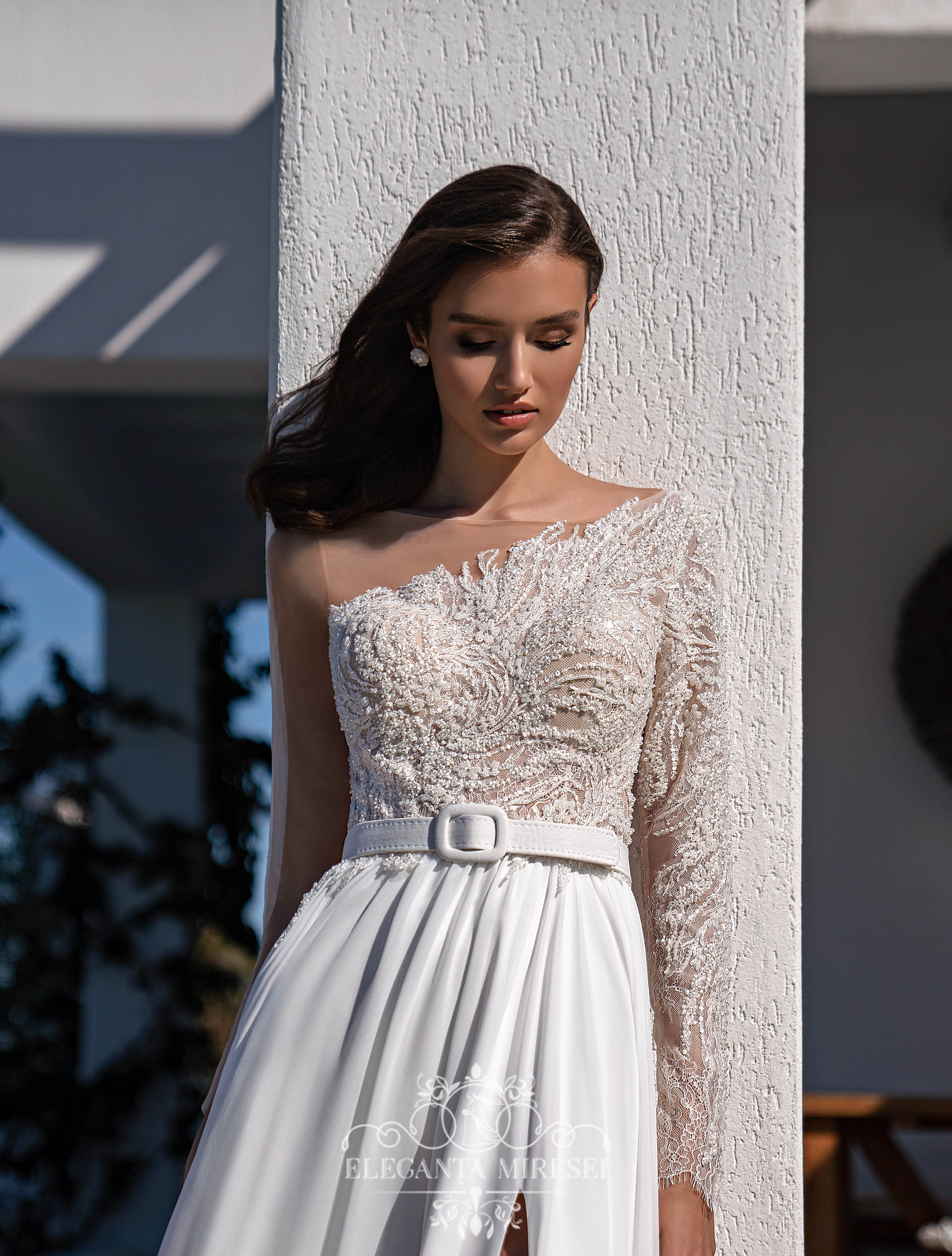 Rochie de mireasă strălucitoare și spectaculoasă, cu înfrumusețare asimetrică, mâneci lungi și o fustă cu o crapatură seducătoare pe piciorul stâng. Un corset moale transparent este acoperit asimetric cu șantelieu . O centură detașabilă accentuează talia. Spatele este fixat cu nasturi. Fustă este din multișifon, cu o trenă luxoasă. Modelul este decorat cu dantelă, brodată cu mărgele, cristal, perle și paiete.