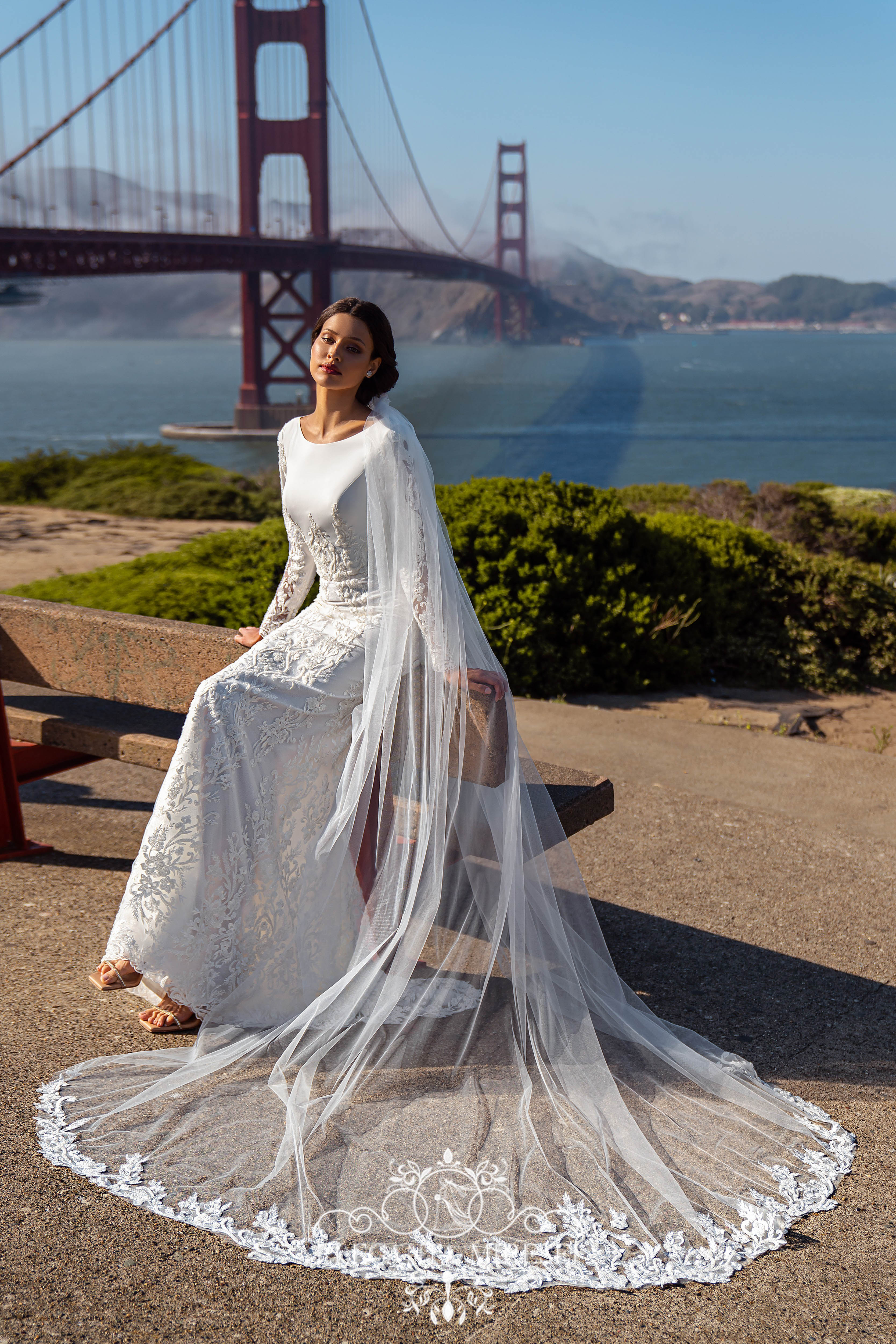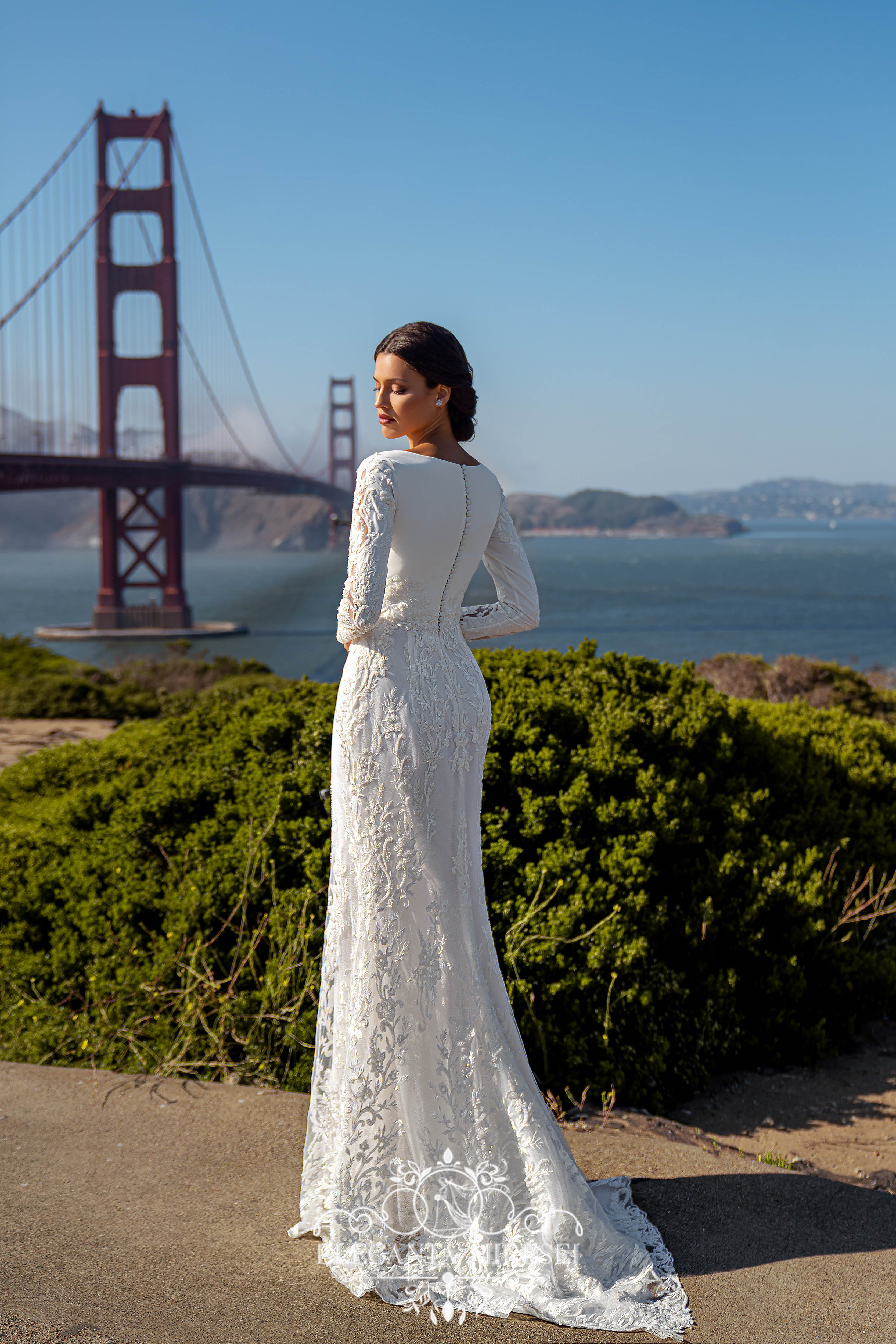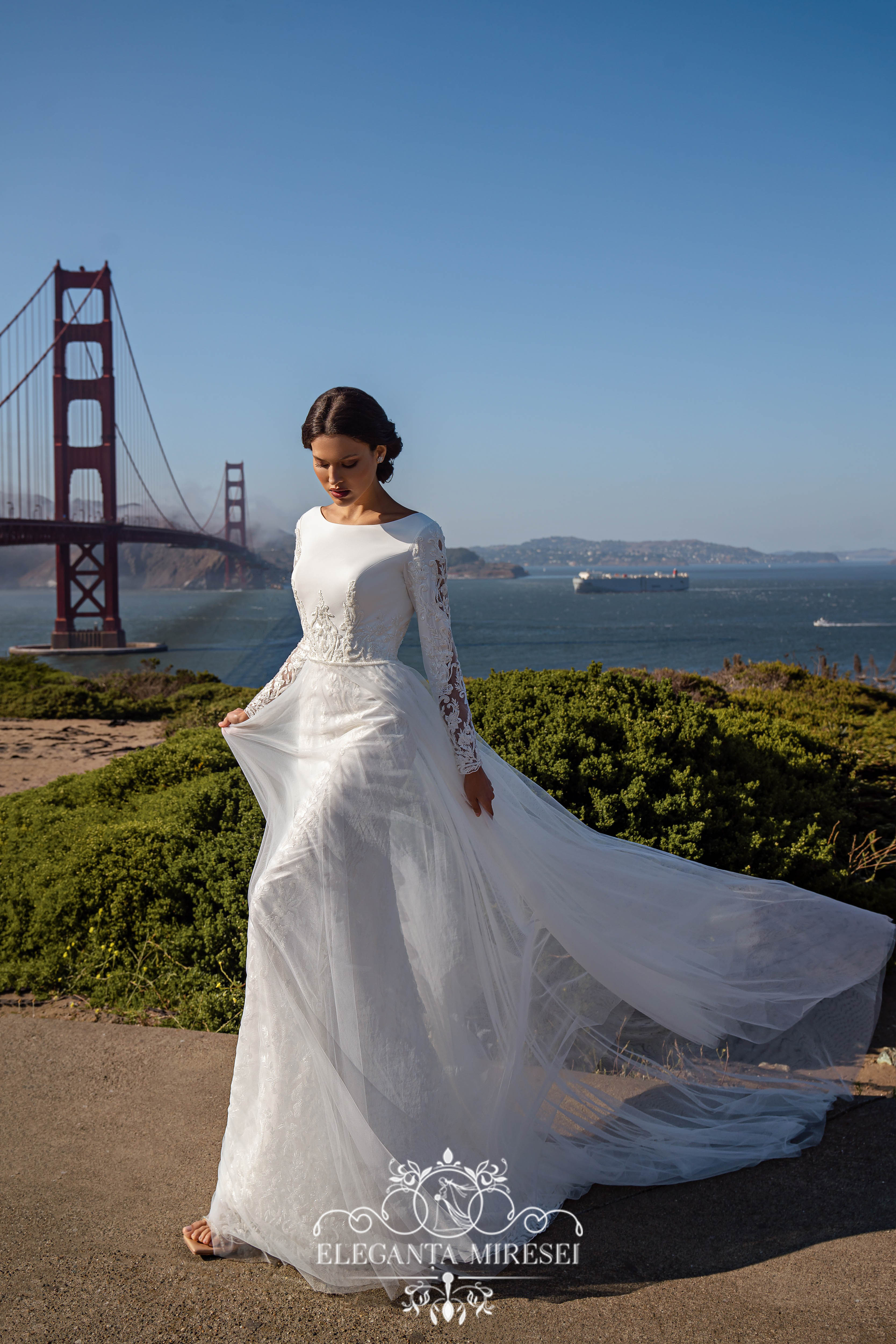 Sophisticated and elegant wedding set consisting of an elegant dress with long sleeves and a detachable skirt with a train. The gorgeous waist-length corset is made of minimalist and comfortable waist-length stretch crepe, complemented with a modest “bâteau” neckline. Long, straight sleeves are made using the exquisite “Richelieu” technique. A skirt with a train of the “godet” silhouette emphasizes the slender and beautiful lines of the body, making the bride even more attractive. A removable skirt made of euro net on an elastic waistband embroidered with beads and crystals will diversify a tender look
