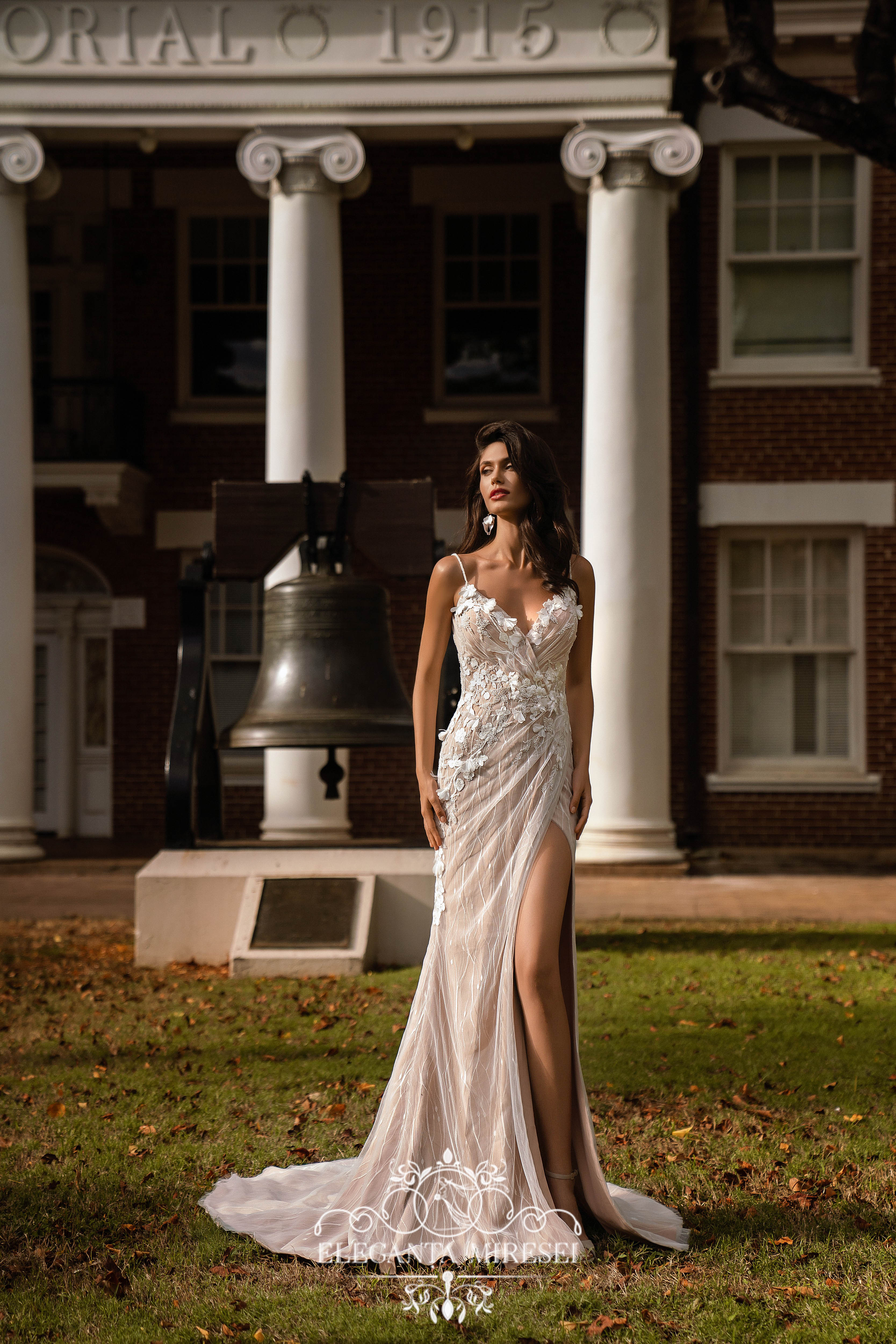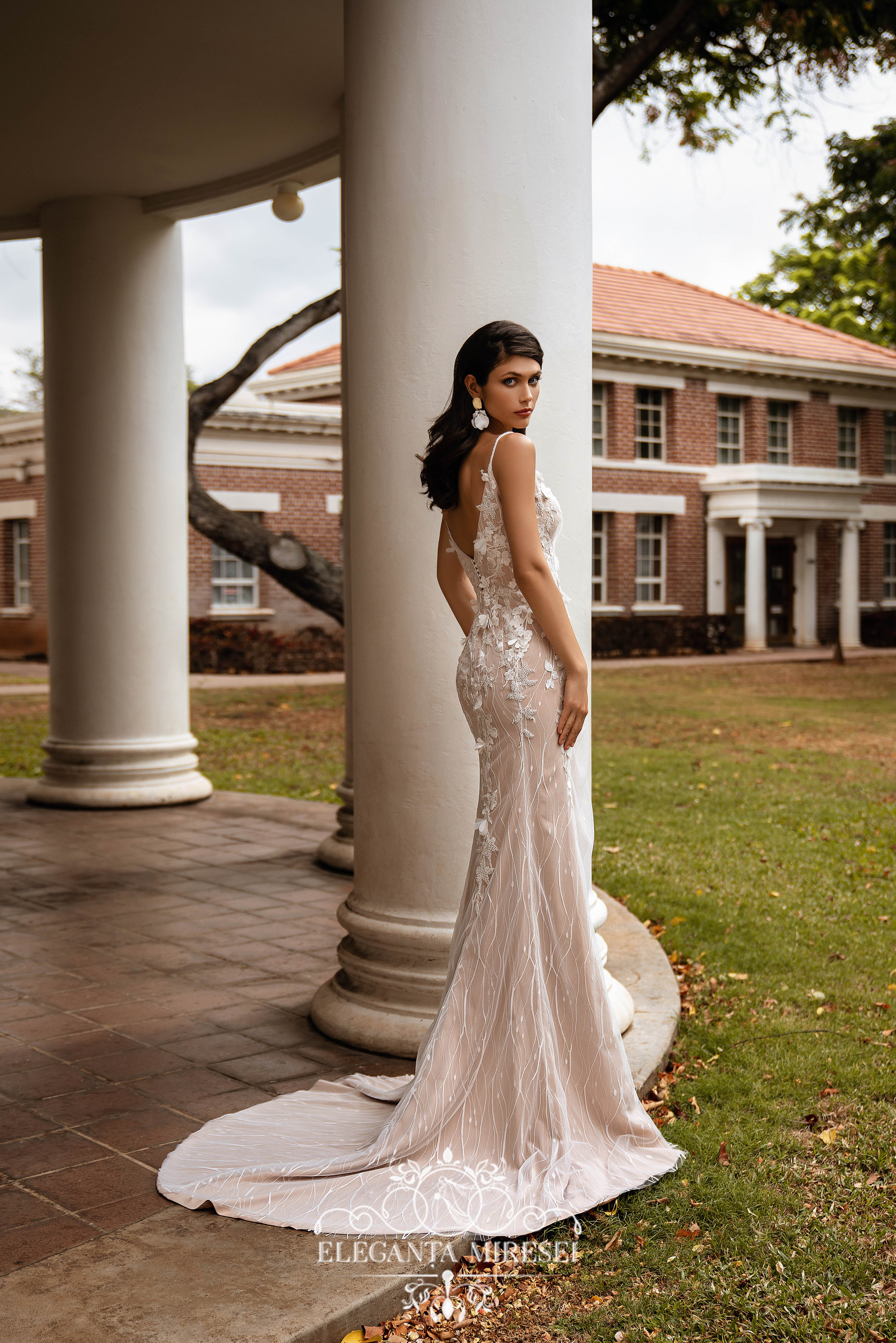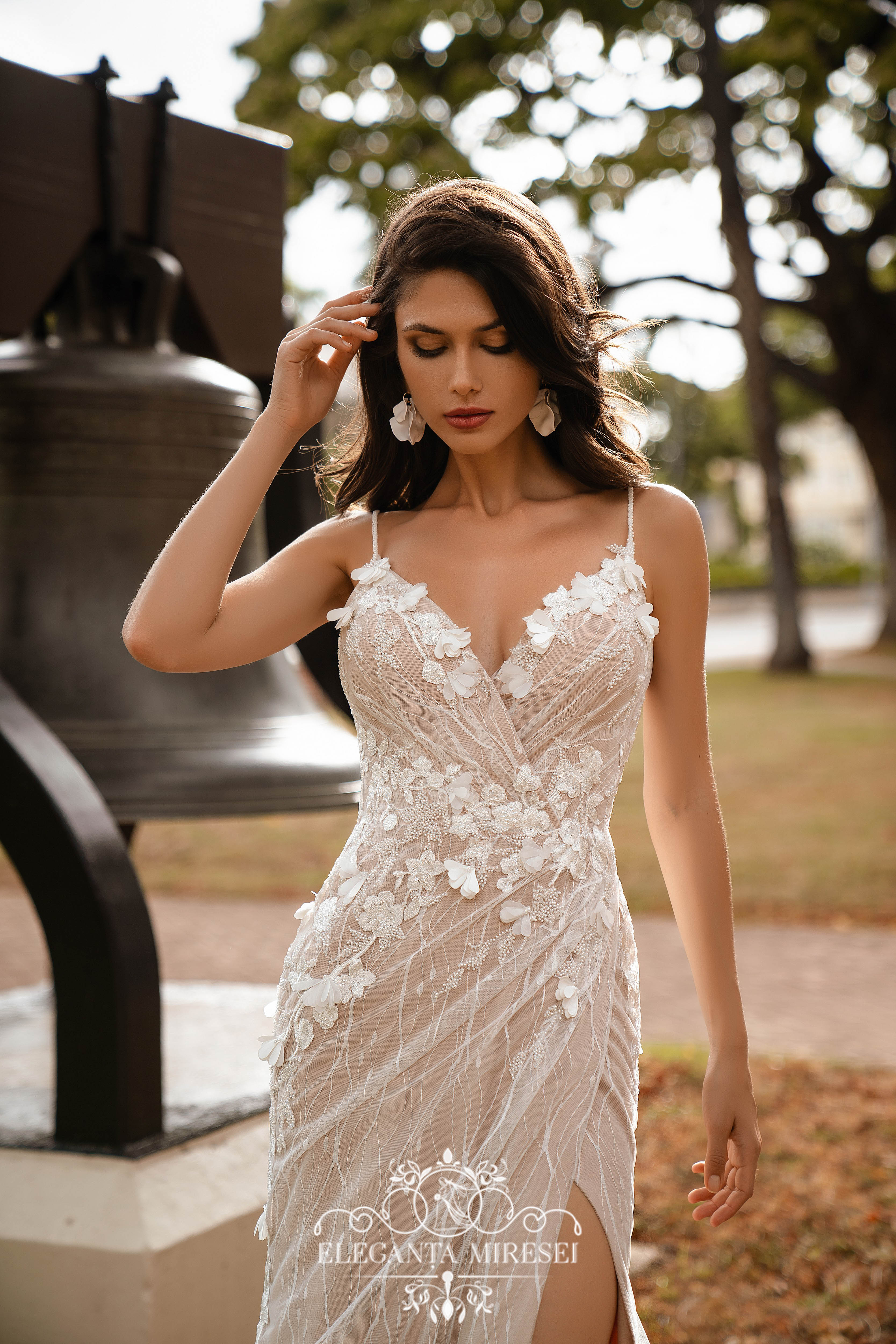 This elegant wedding dress on straps with a wrap skirt and a train is a true image of elegance and attractiveness. Every detail of this dress gives an image of luxury and sophistication. The dress has a “godet” silhouette that will best accentuate the female figure of the bride, adding grace and charm. The body-based model gives effect to the image, giving it tenderness and lightness. The waist corset is decorated with a drape that creates an excellent visual effect and gives an image of luxury and sophistication. The model is decorated with elements of a guipure embroidered with beads and sequins, as well as bulk colors. These exquisite details create a magnificent shining effect on every move of the bride, giving the image a fabulous charm. Elegant straps embroidered with beads are a detail that gives the image extra elegance and romance.