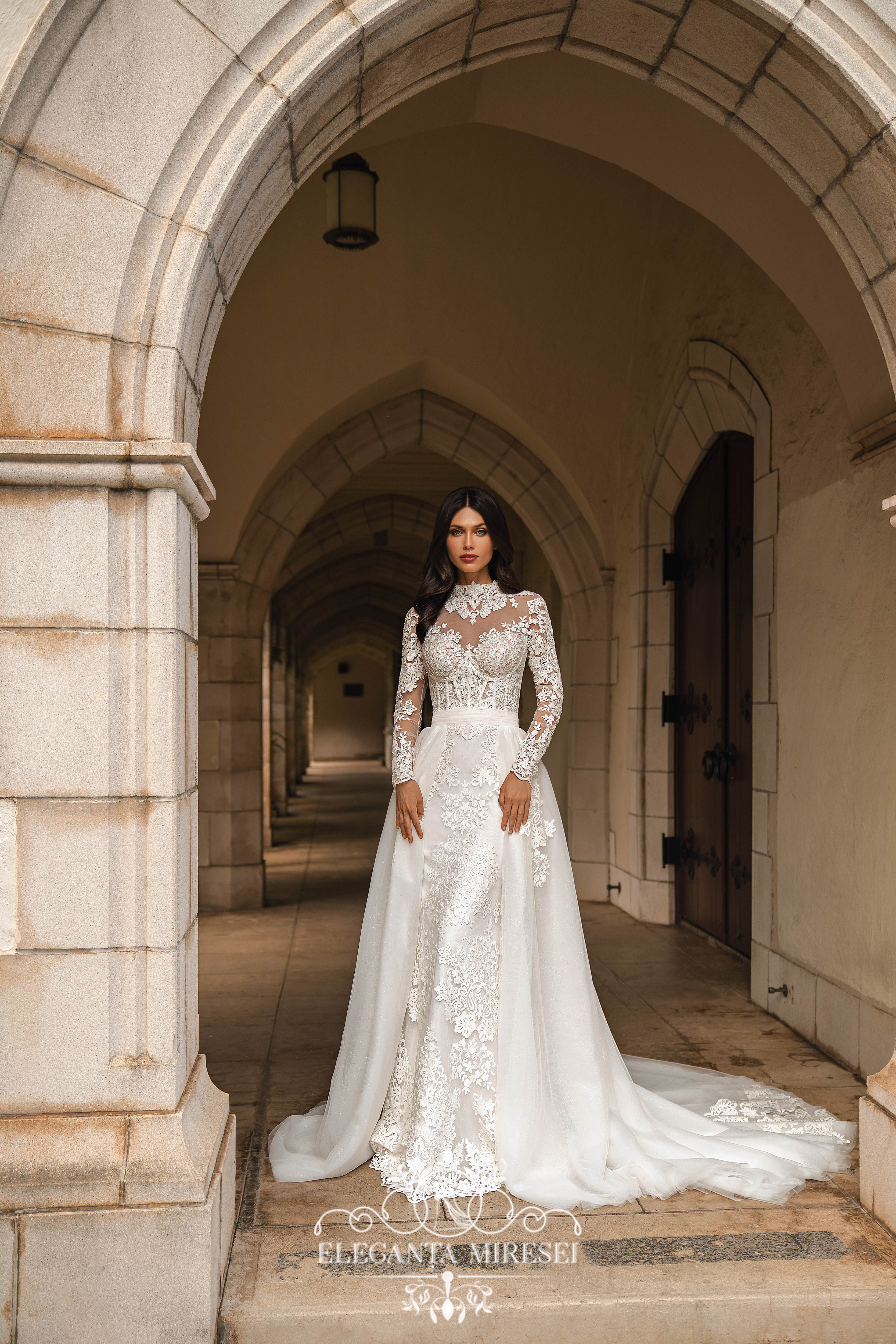 The luxurious bridal set, consisting of a guipure dress and a detachable train on the belt, represents luxury and elegance. Every detail of this set gives an image of elegance and impressive style. The dress has long sleeves and a high collar, which creates a great sense of grace and tenderness. A translucent bodice with a light chantilly accentuates the natural beauty of the bride, giving an image of mystery and romance. The back of the dress on the buttons adds extra dressing, creating a magical and unforgettable effect. A skirt with a fine gloss gives the image glitter and refinement. It creates an excellent visual effect that attracts attention and charm. The detachable plume with the drape belt gives an image of luxury and elegance. It allows the bride to easily change the image after the ceremony and makes it more practical for the wedding evening. The model is decorated with elements of a guipure embroidered with beads and sequins. These exquisite details create a splendid, shiny effect on every move of the bride, giving her an image of luxury and shine.