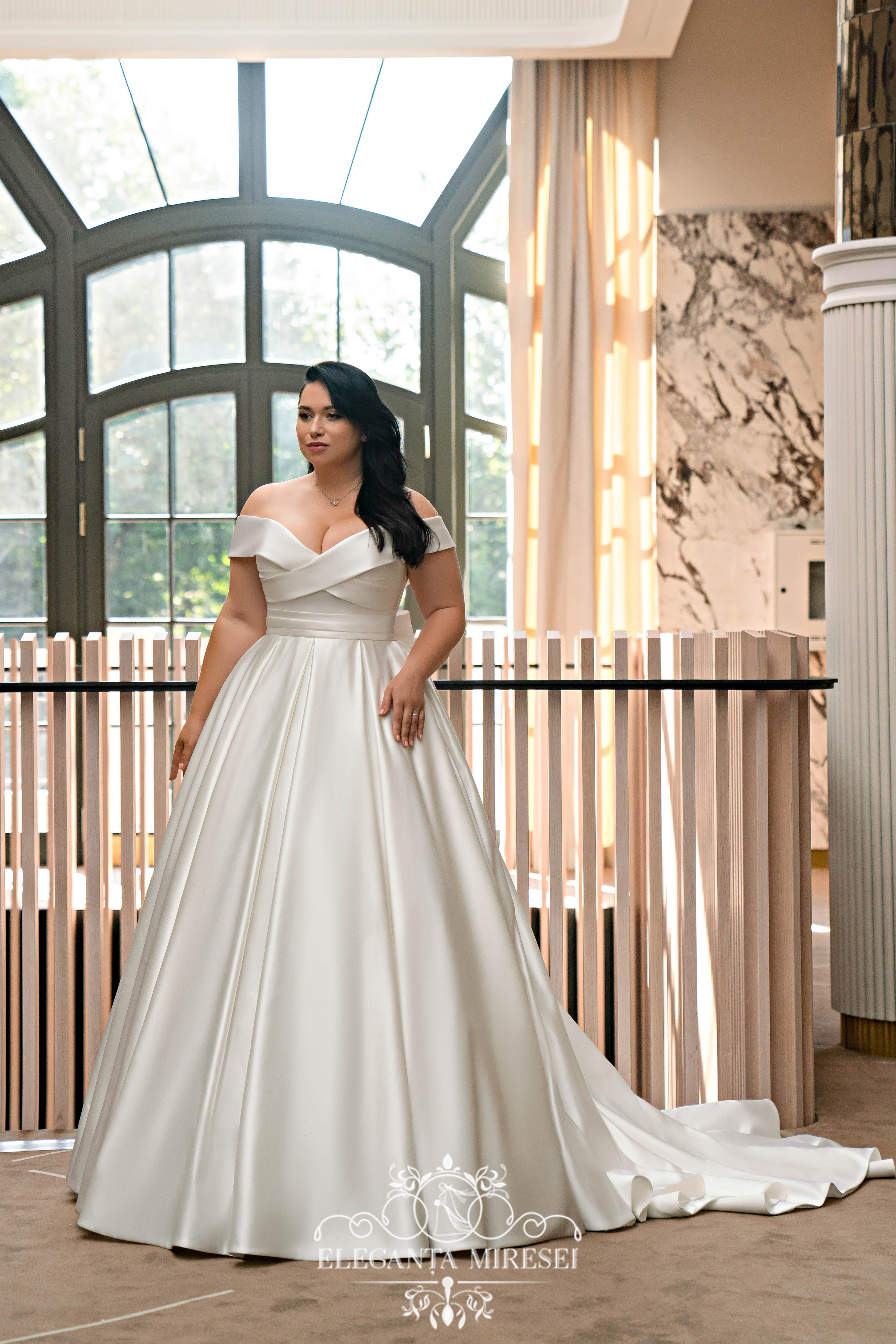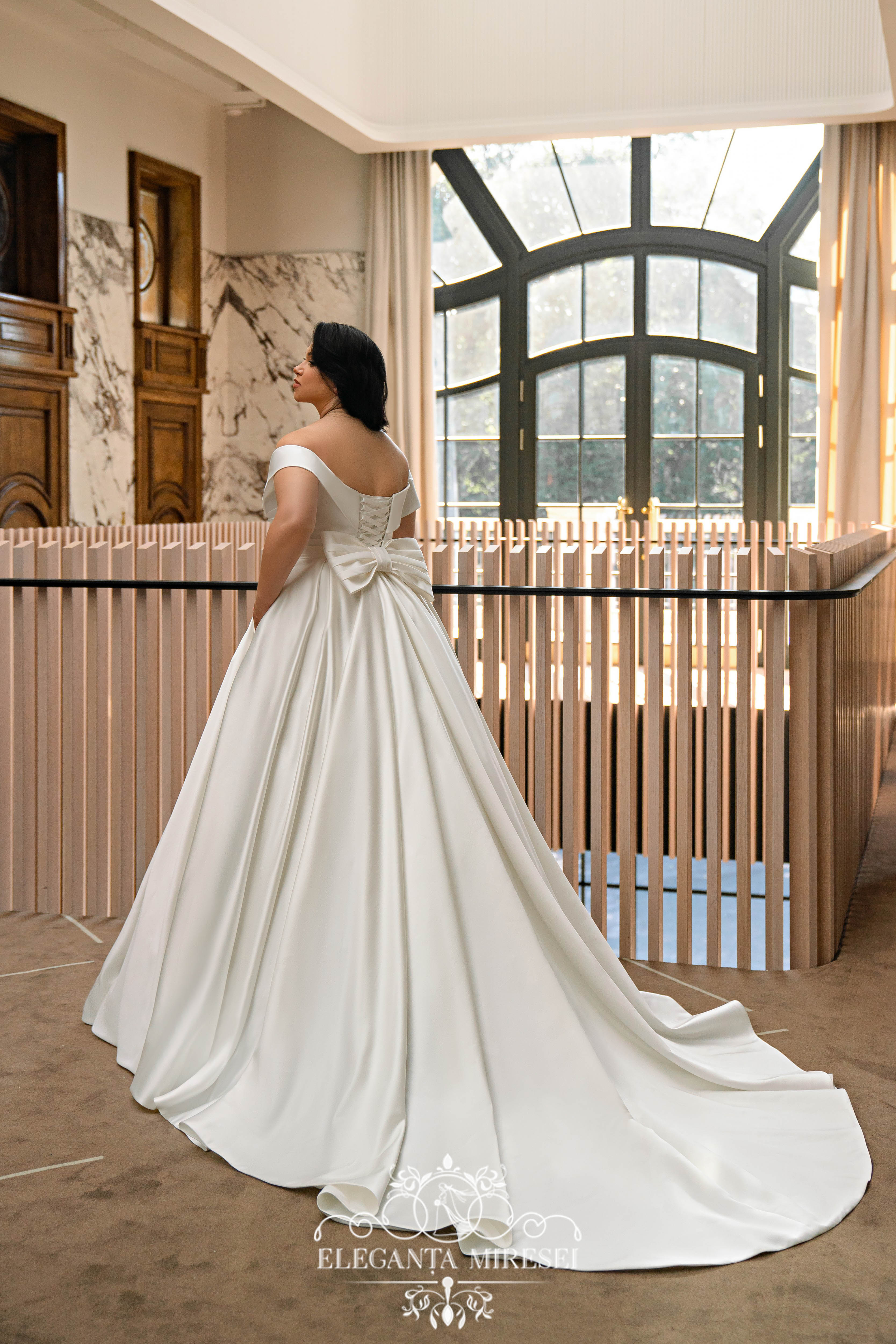 Rochie de mireasă minimalistă pentru mărimi plus size, este simbolul eleganței și frumuseții moderne, care va face mireasa să arate incredibil și să se simtă confortabil în ziua ei cea mare. Rochia este confectionata din satin regal, adaugand stralucire si lux lookului. Umerii deschiși fac aspectul deschis și senzual, iar fusta cu trenă adaugă romantism și eleganță. Corsetul pînă în talie cu guler, transformându-se lin în draperii, dă feminitate și grație. Talia drapată în partea de jos a corsetului subliniază silueta. Spatele cu șiret face aspectul clasic și elegant, permițându-vă să ajustați potrivirea rochiei la silueta dvs. Funda originală detașabilă de pe spatele rochiei adaugă aspectului o eleganță de neegalat. Rochia are buzunare practice în cusăturile laterale pentru funcționalitate și comoditate.