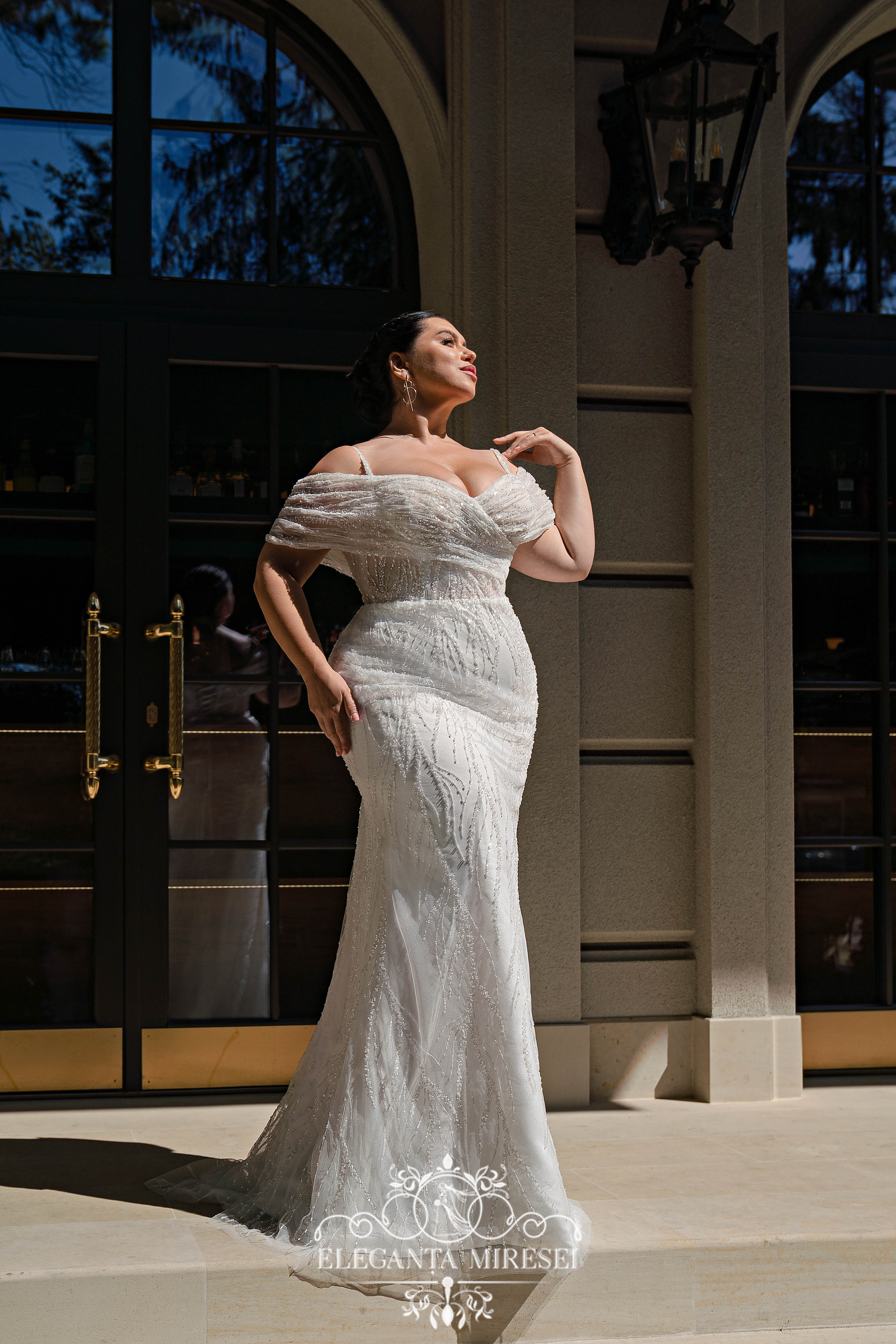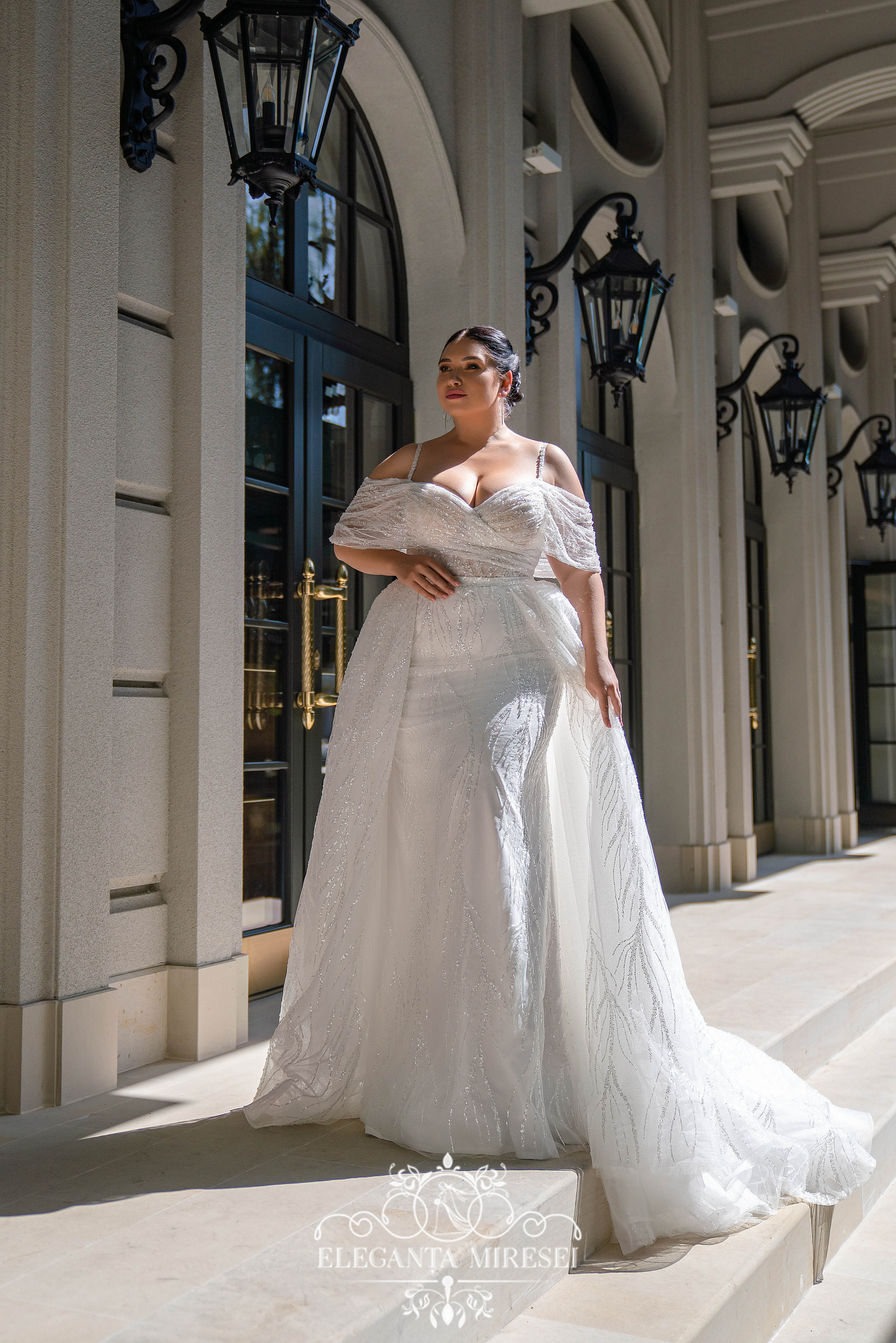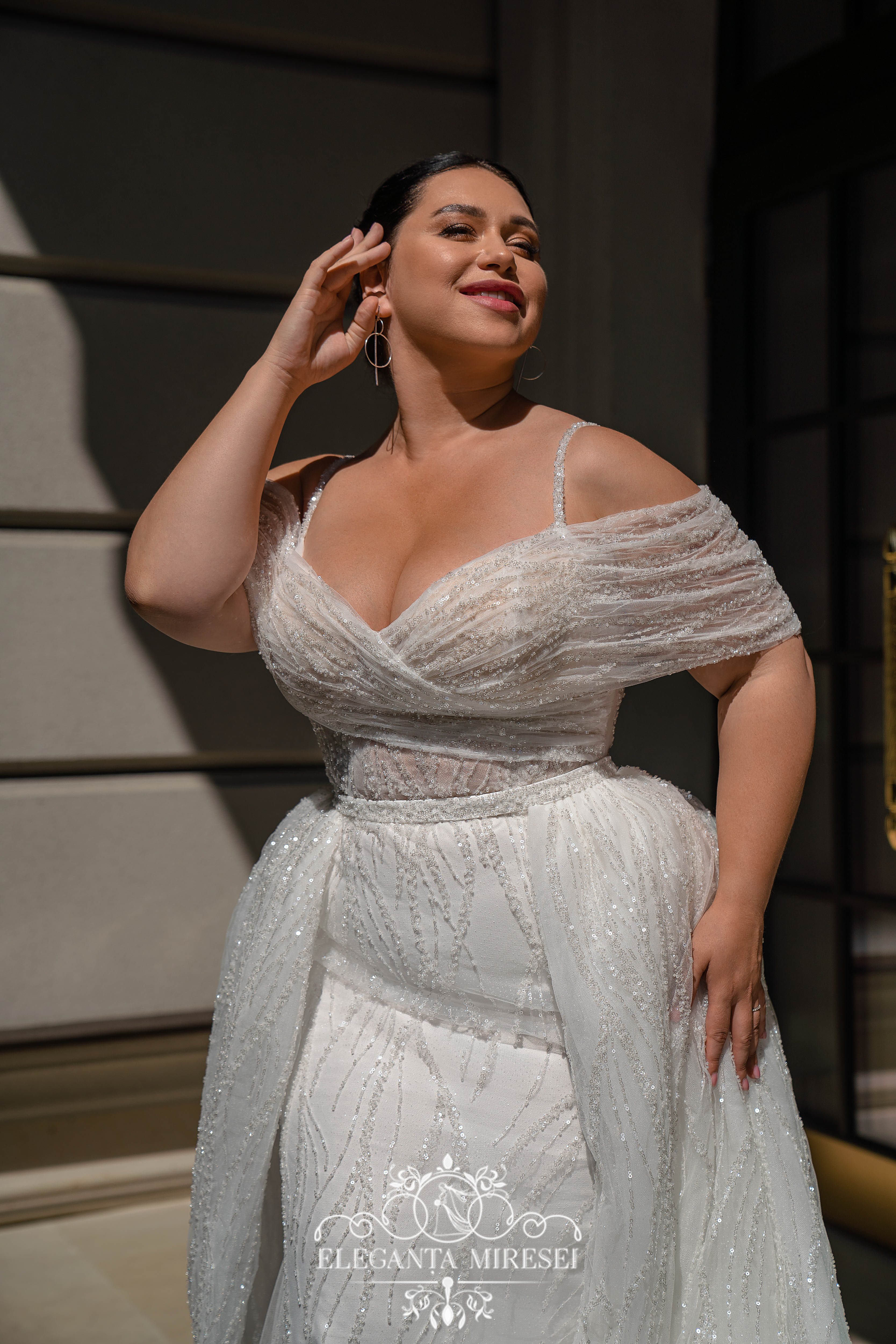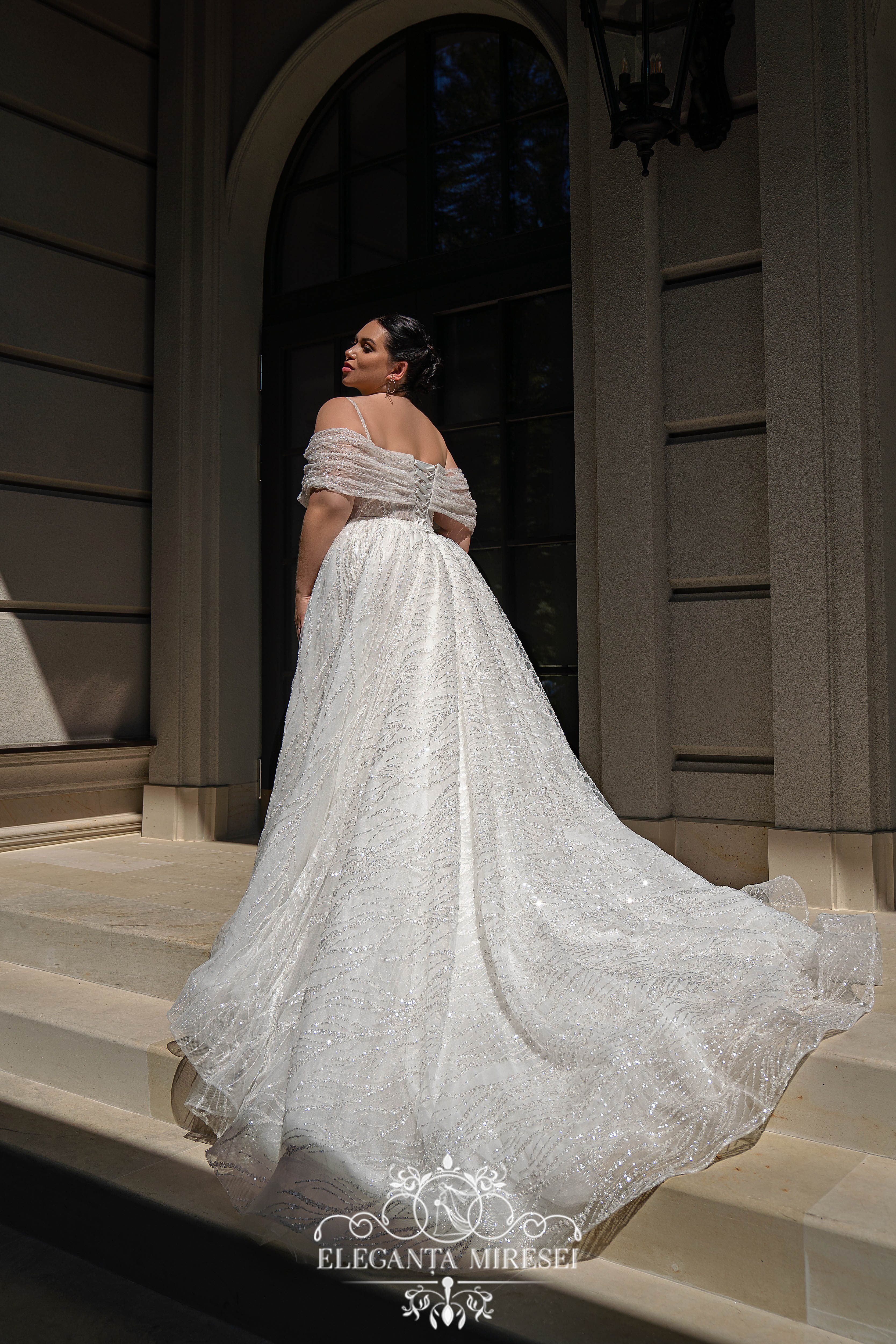 Set de nuntă extraordinar, de marime mare, este simbolul eleganței și luxului. Rochia din dantelă are o siluetă „sirenă” și bretele, adăugând lejeritate și tandrețe aspectului. Corsetul transparent pînă în talie adaugă o notă de senzualitate și eleganță rochiei. Trena detașabilă de pe centură este confecționată din satin regal, adăugând un farmec luxos aspectului. Modelul este decorat cu elemente din dantela, cusut cu margele si paiete, ceea ce il face deosebit de elegant si luminos. Acest set de nuntă te va face să arăți uimitor și să te simți ca o adevărată regină la nunta ta, lăsând o impresie de durată tuturor celor prezenți.