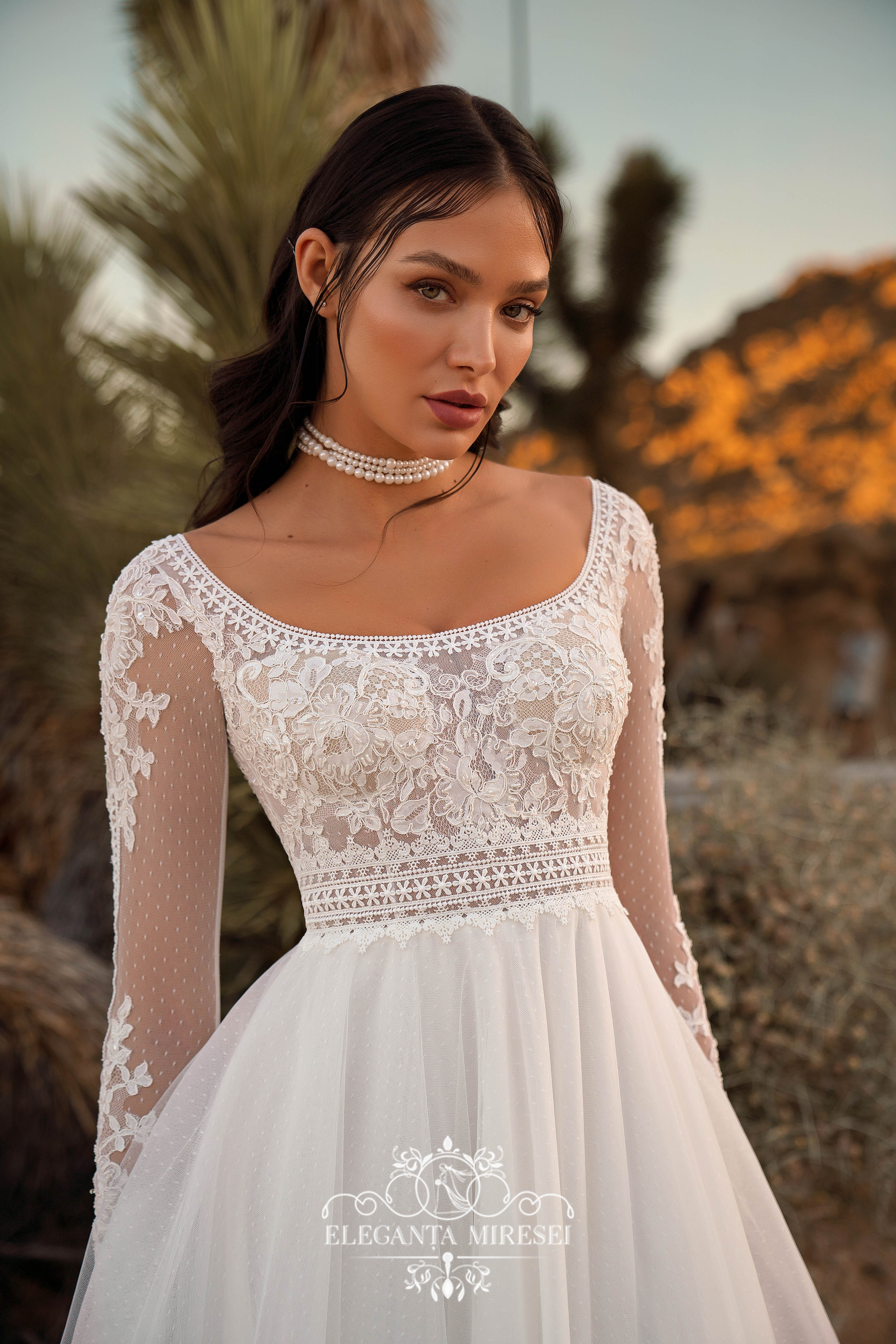 Această rochie de mireasă „boho” atrage atenția cu frumusețea sa unică și sofisticarea fiecărui detaliu. Mânecile lungi și o fustă moale cu trenă adaugă lejeritate și grație look-ului. O crăpătură pe piciorul stâng adaugă un accent rochiei. Corsetul translucid și mânecile decorate cu dantelă, aplicații, mărgele și paiete creează un aspect uimitor și memorabil. Fiecare detaliu al acestei rochii creează o imagine magică, făcând mireasa să arate irezistibilă.