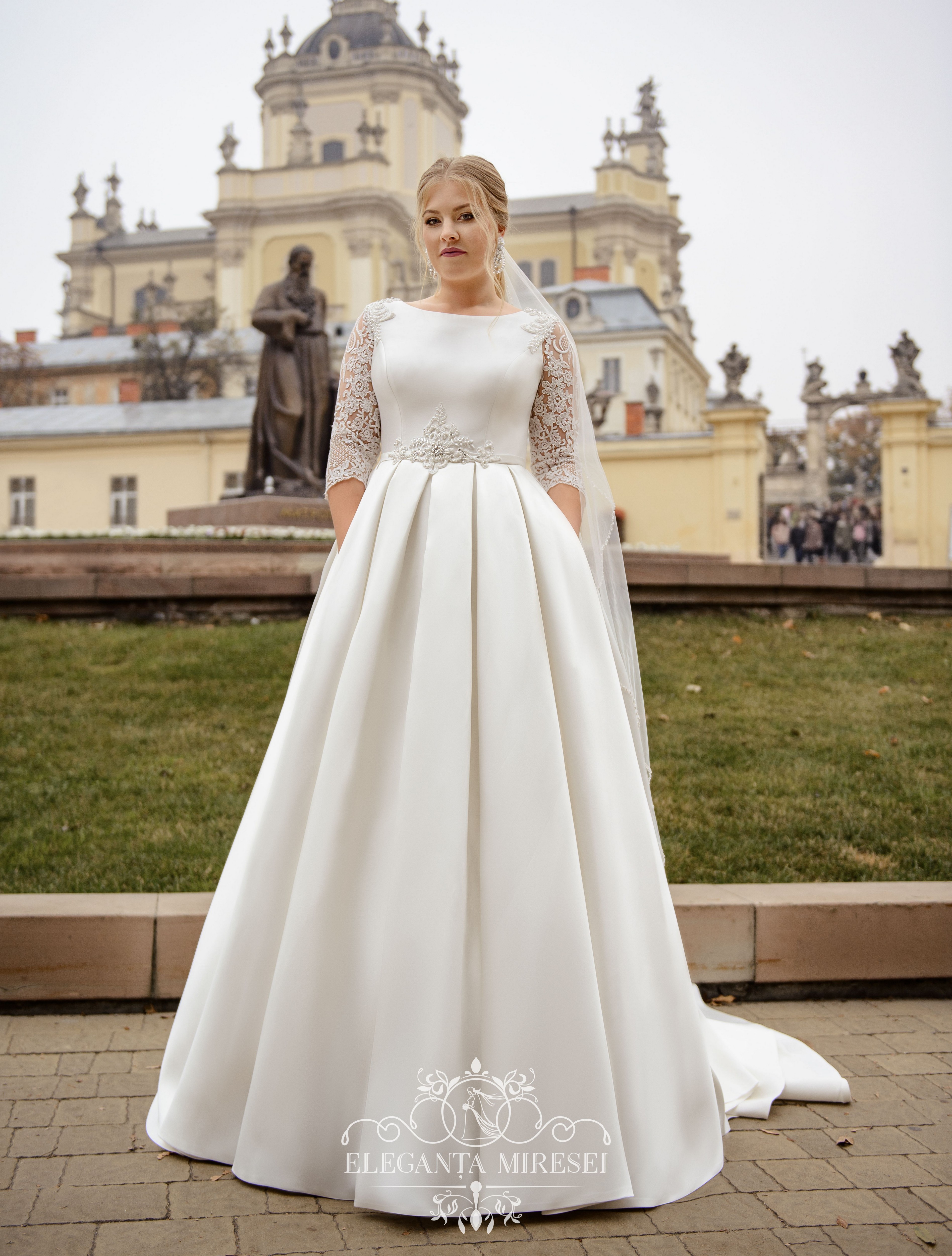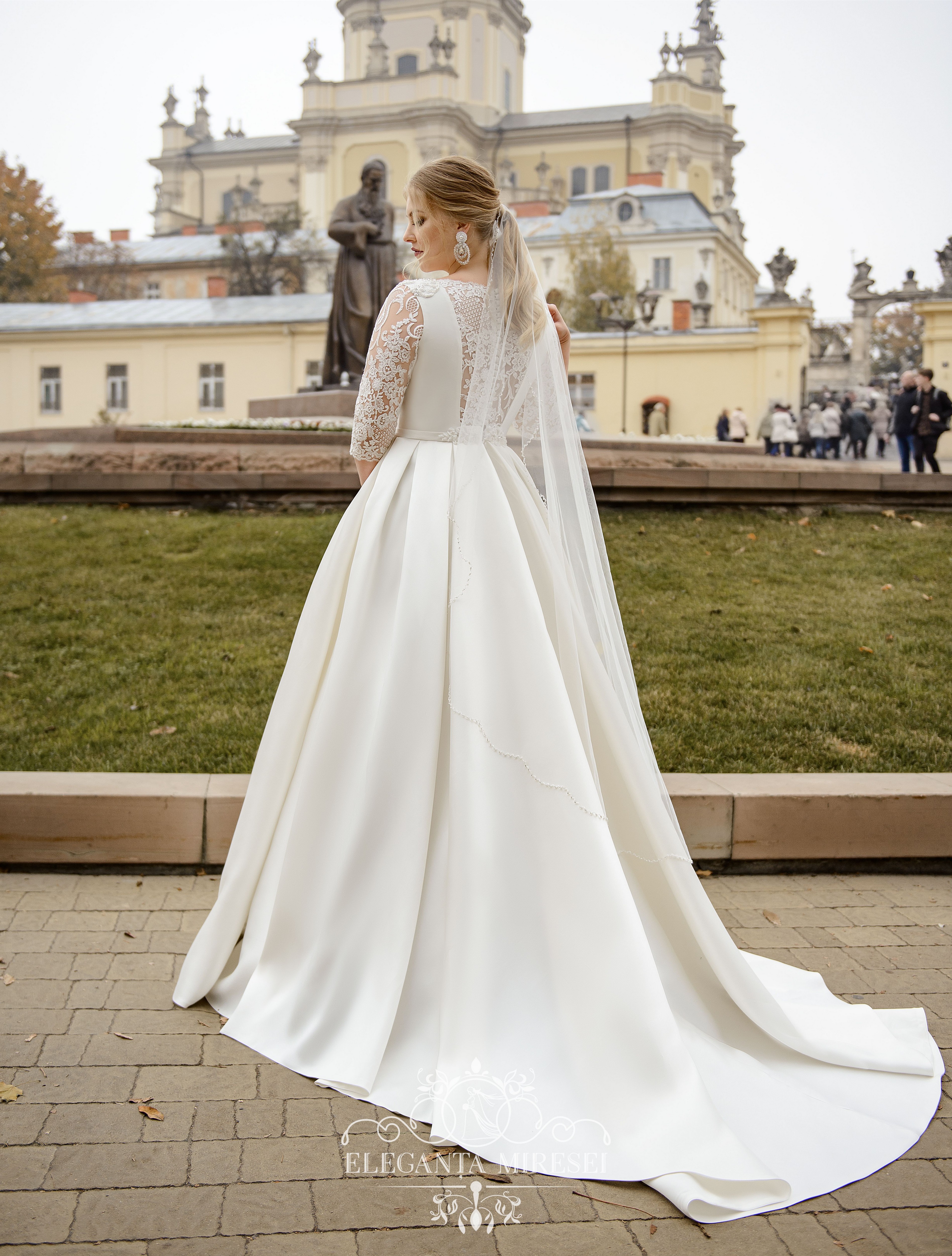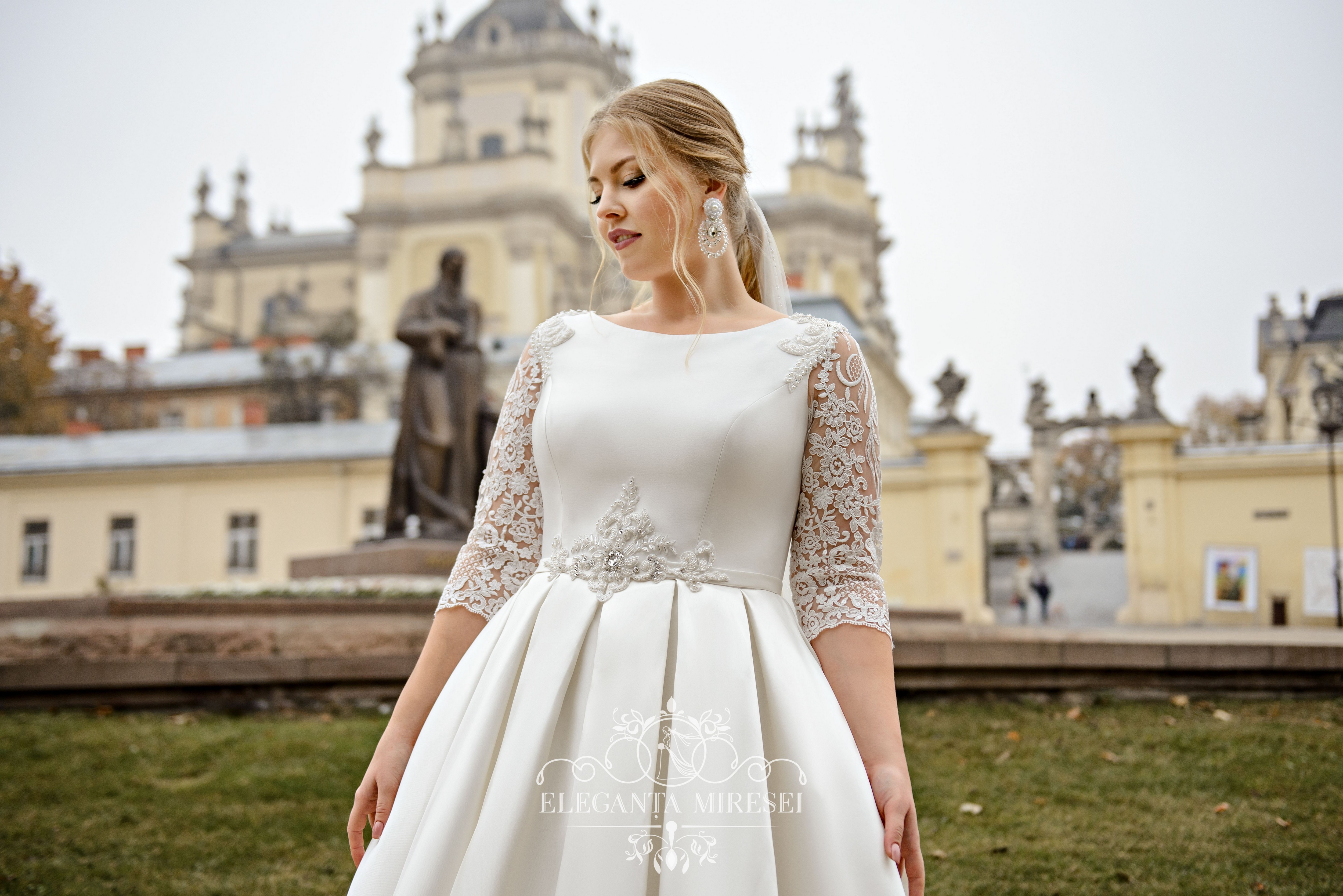 Rochie de mireasă silueta „A” culoarea ivory cu mâneci ¾ și fustă trenă. Modelul produs din țesătură „micado”. Mânecile și detaliu mediu a spatelui din ghipur, brodat cu paiete. Corsetul până la talie cu brâu. Spatele se încheie pe nasturi. Fusta cu straturi, cu buzunare în părți. Pe fermoar sunt cusute nasturi. Modelul decorat cu elemente de ghipur, brodat cu mărgele, perle și pietre.
