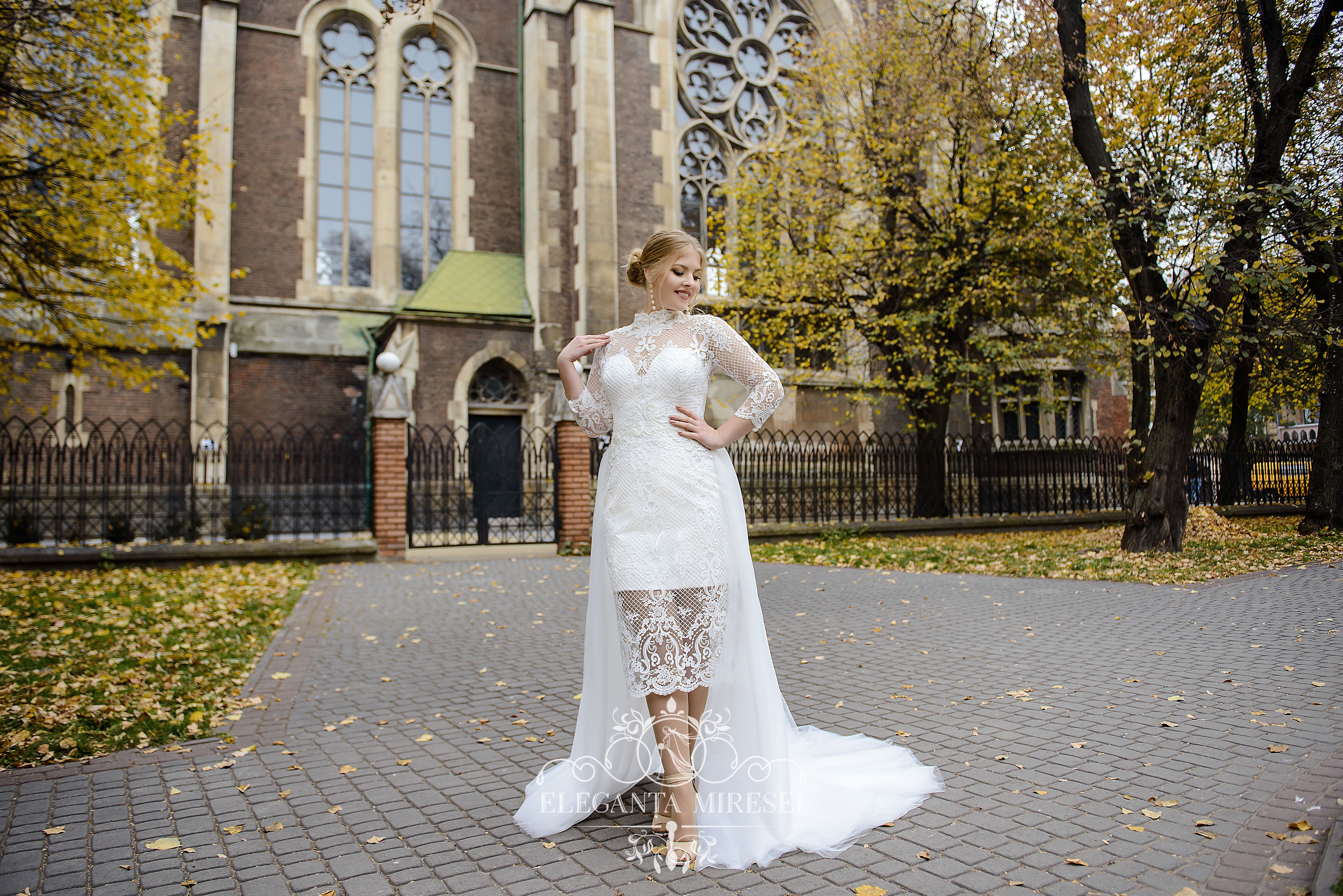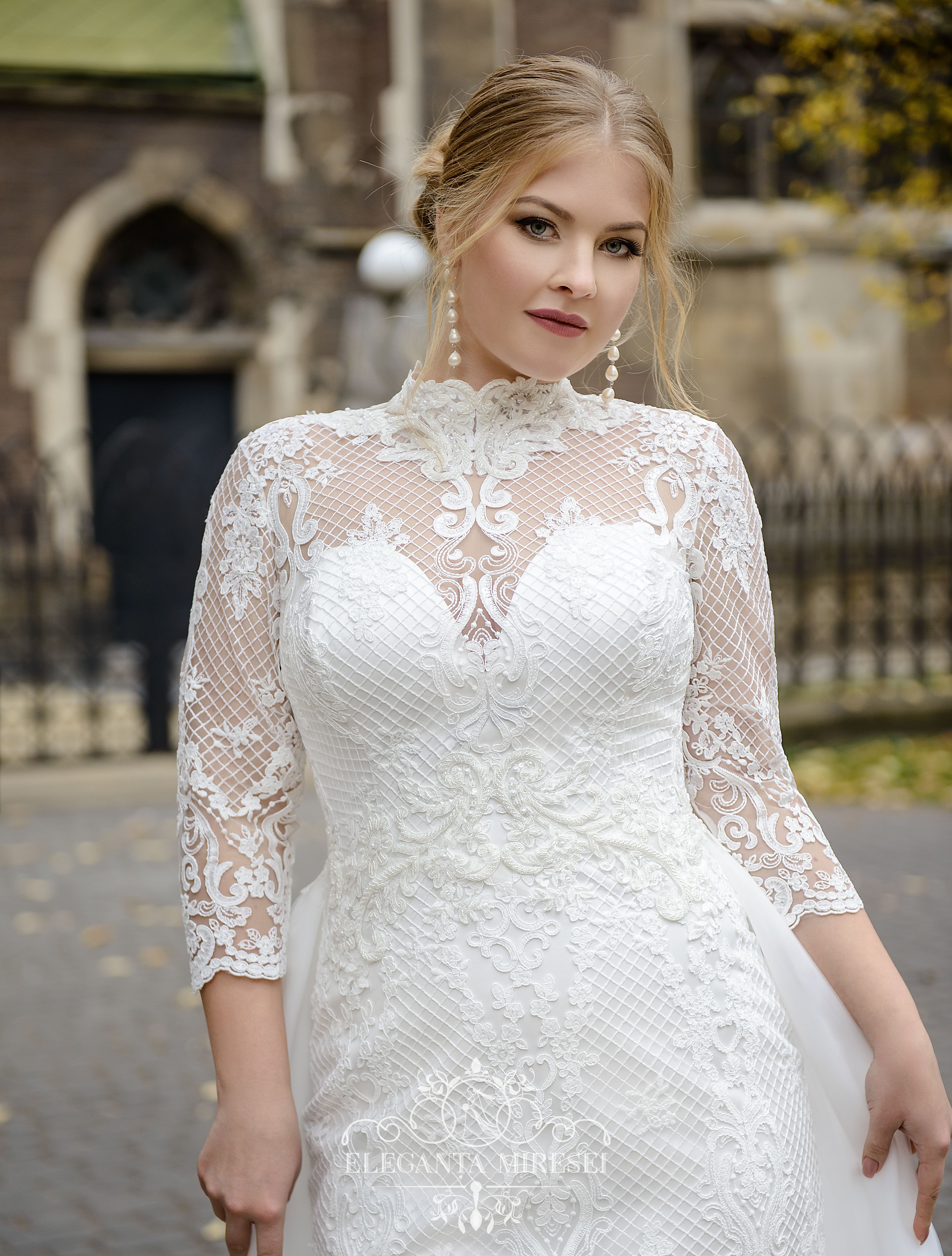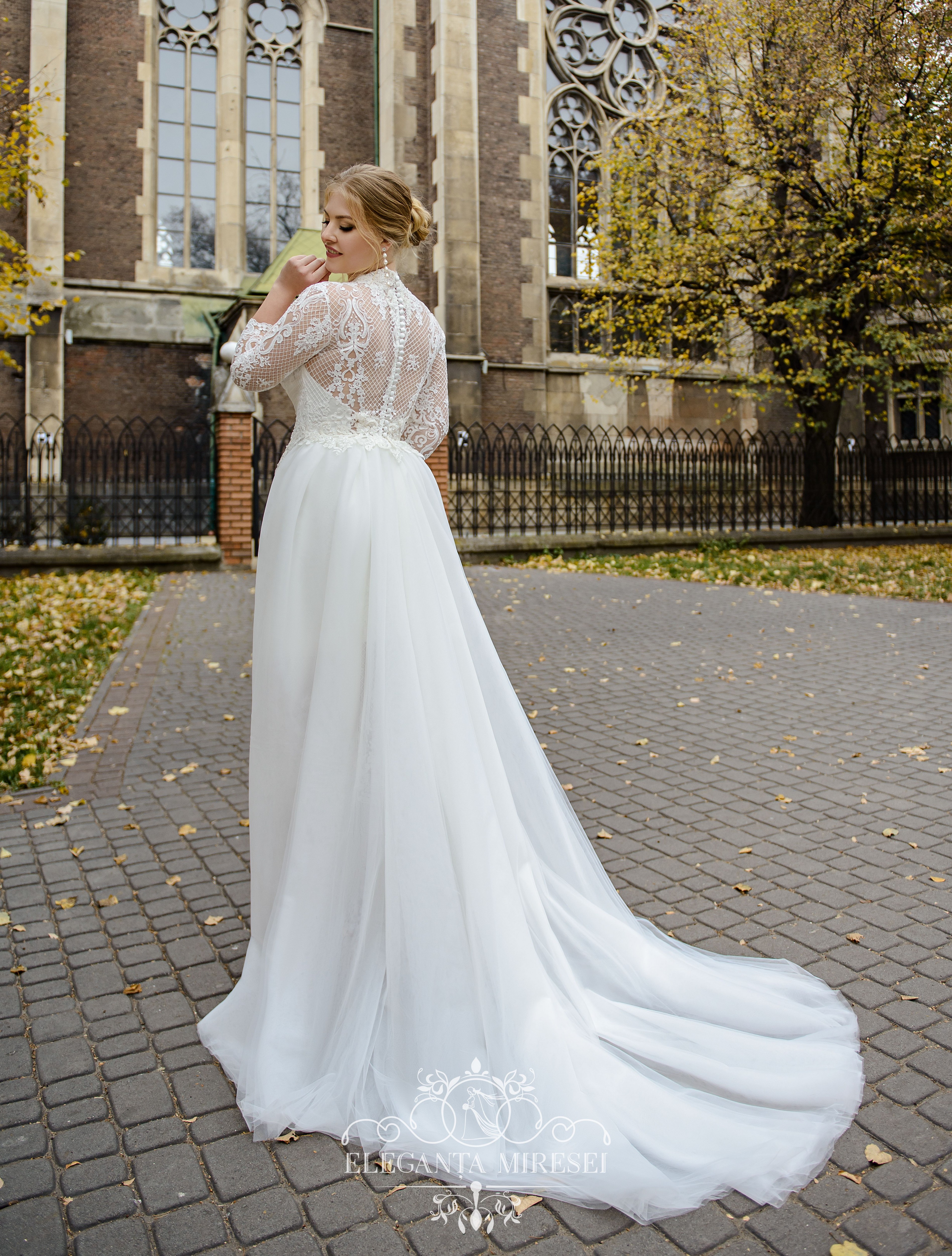 Set de nuntă culoarea ivory, ce constă din rochie de ghipur cu trenă detașabilă din euro plasă. Corsetul până la talie pe cochetă cu mâneci ¾ și guler. Spatele pe nasturi cu cheotoare ascunsă. Din spate pe fustă tăietură. Trena se atașează pe bumbi. Modelul decorat cu aplicații brodate cu mărgele, perle și paiete.
