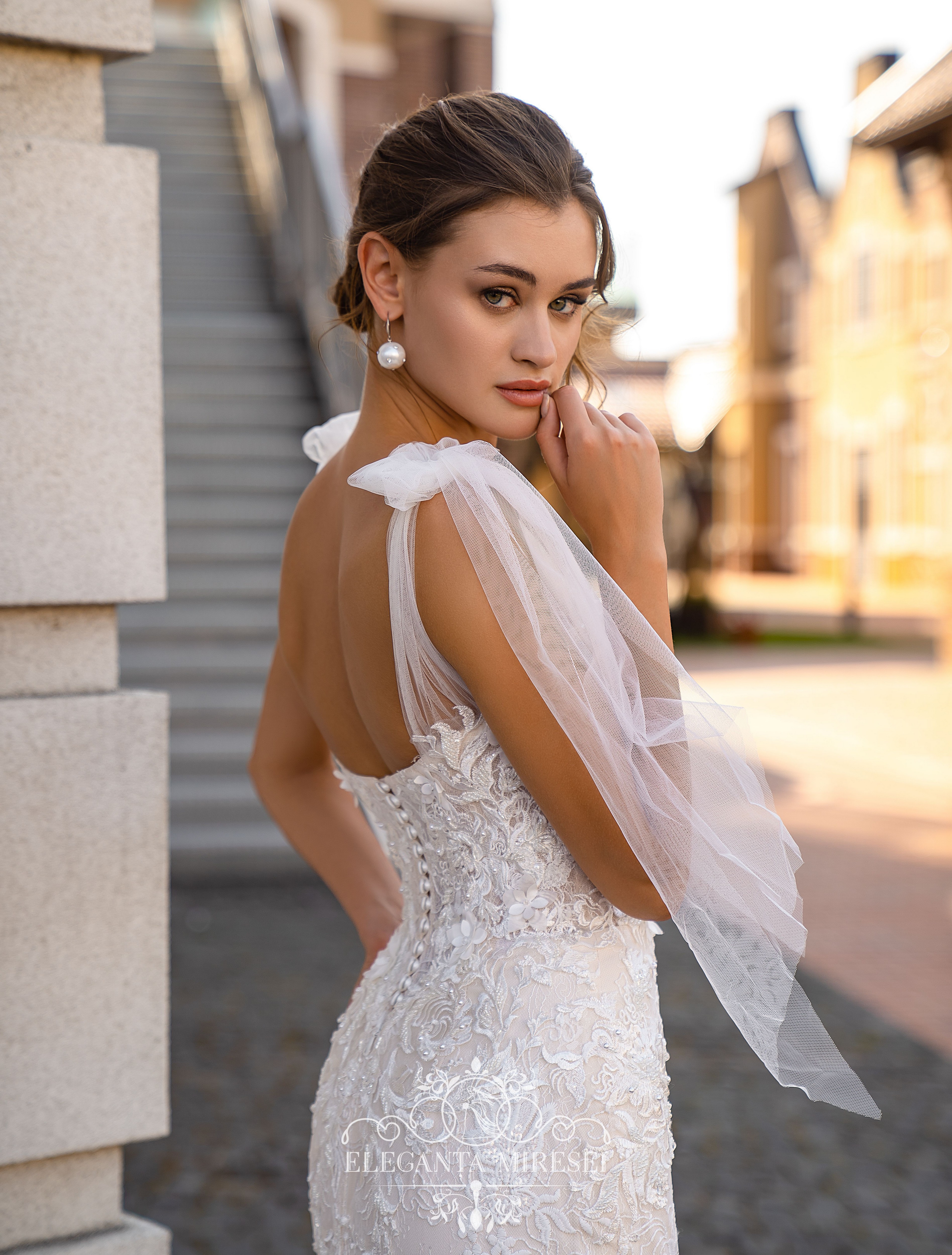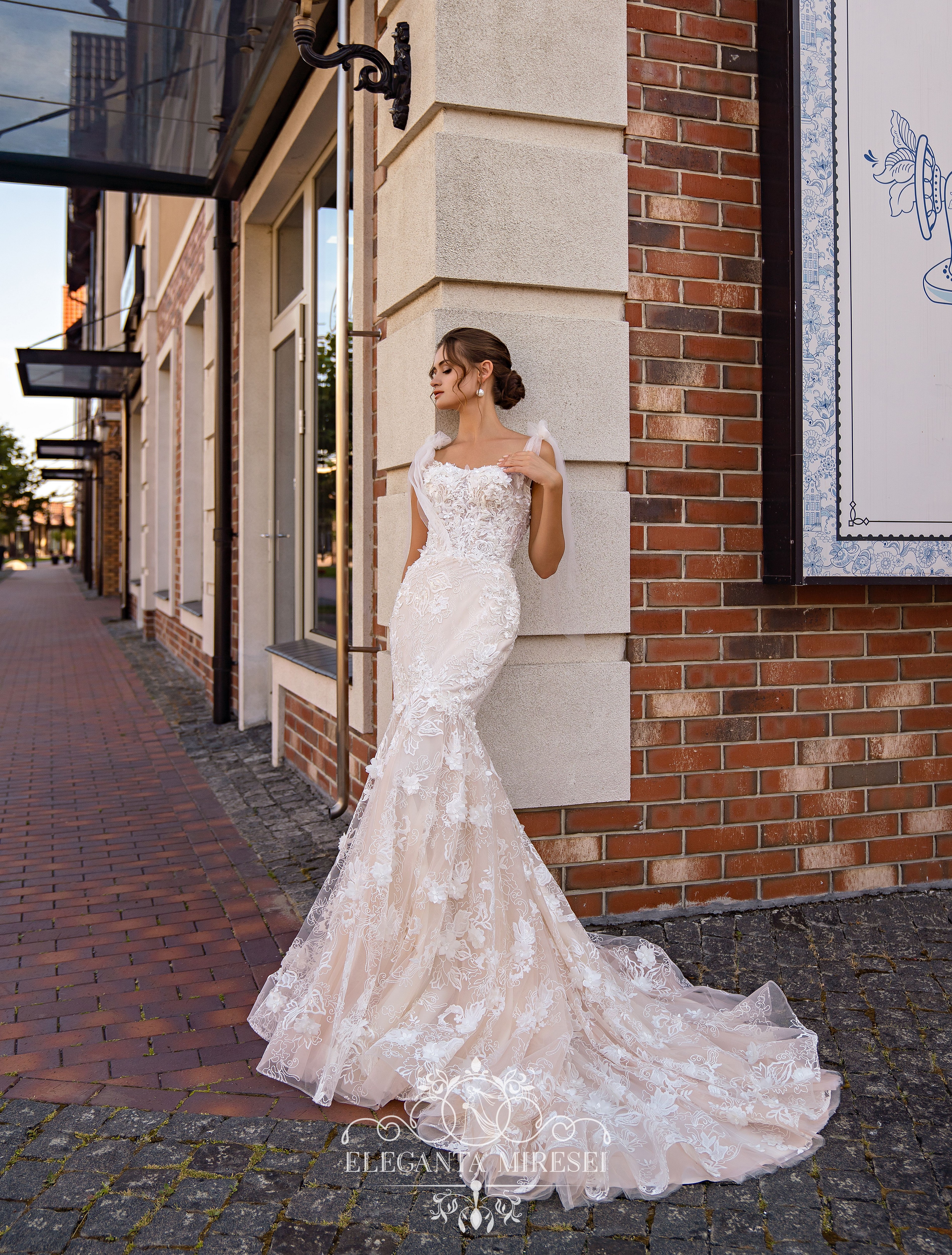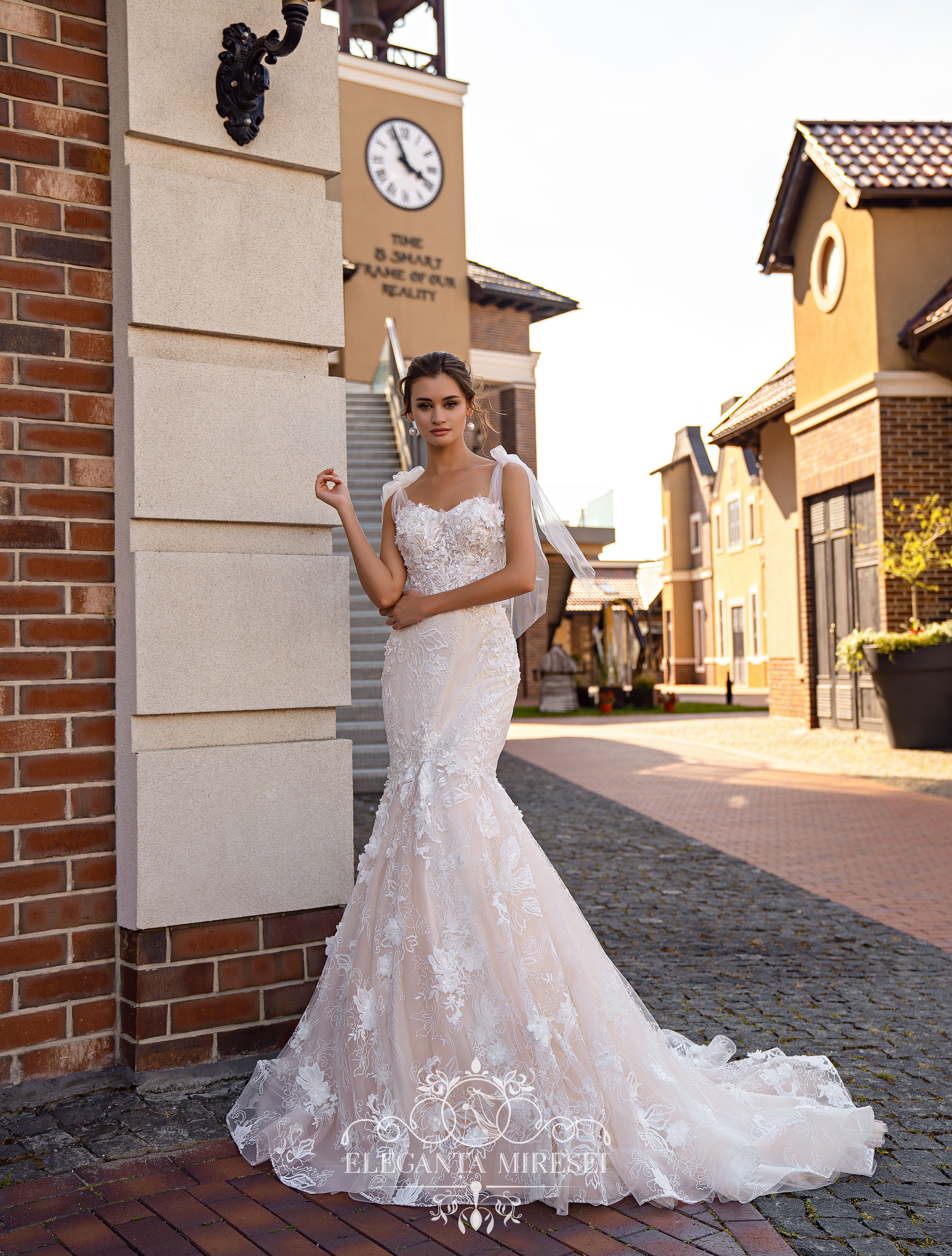 Light romantic «fish» silhouette wedding dress on straps with bows and skirt-train. Nude lining creates contrast, adding originality to the look. The model is decorated with guipure, embroidered with beads, pearls, sequins and voluminous flowers, embroidered with crystals.