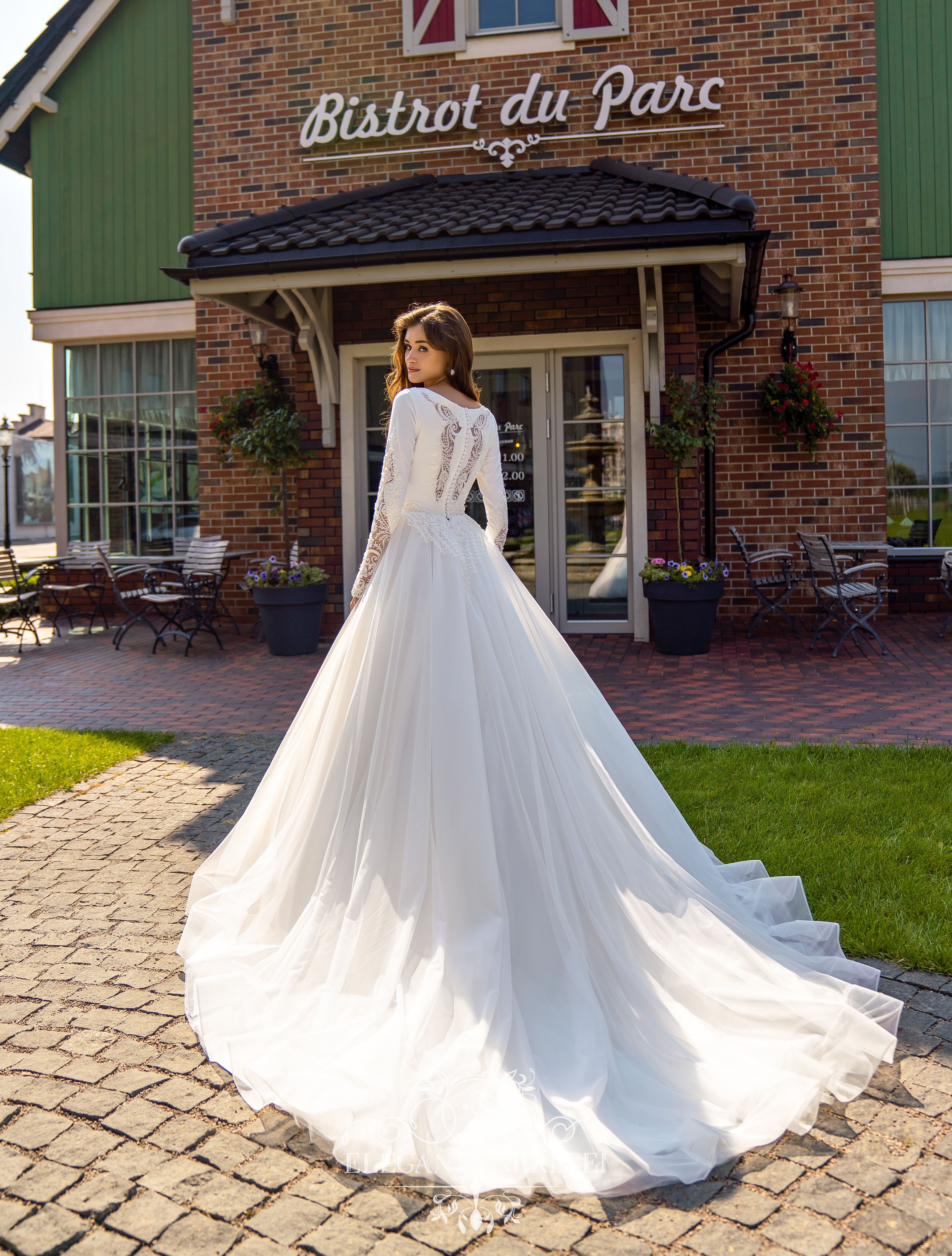 Conservative wedding dress with long sleeves and puffy skirt-train. The model is decorated with elements of guipure, embroidered with beads, sequins and pearls.