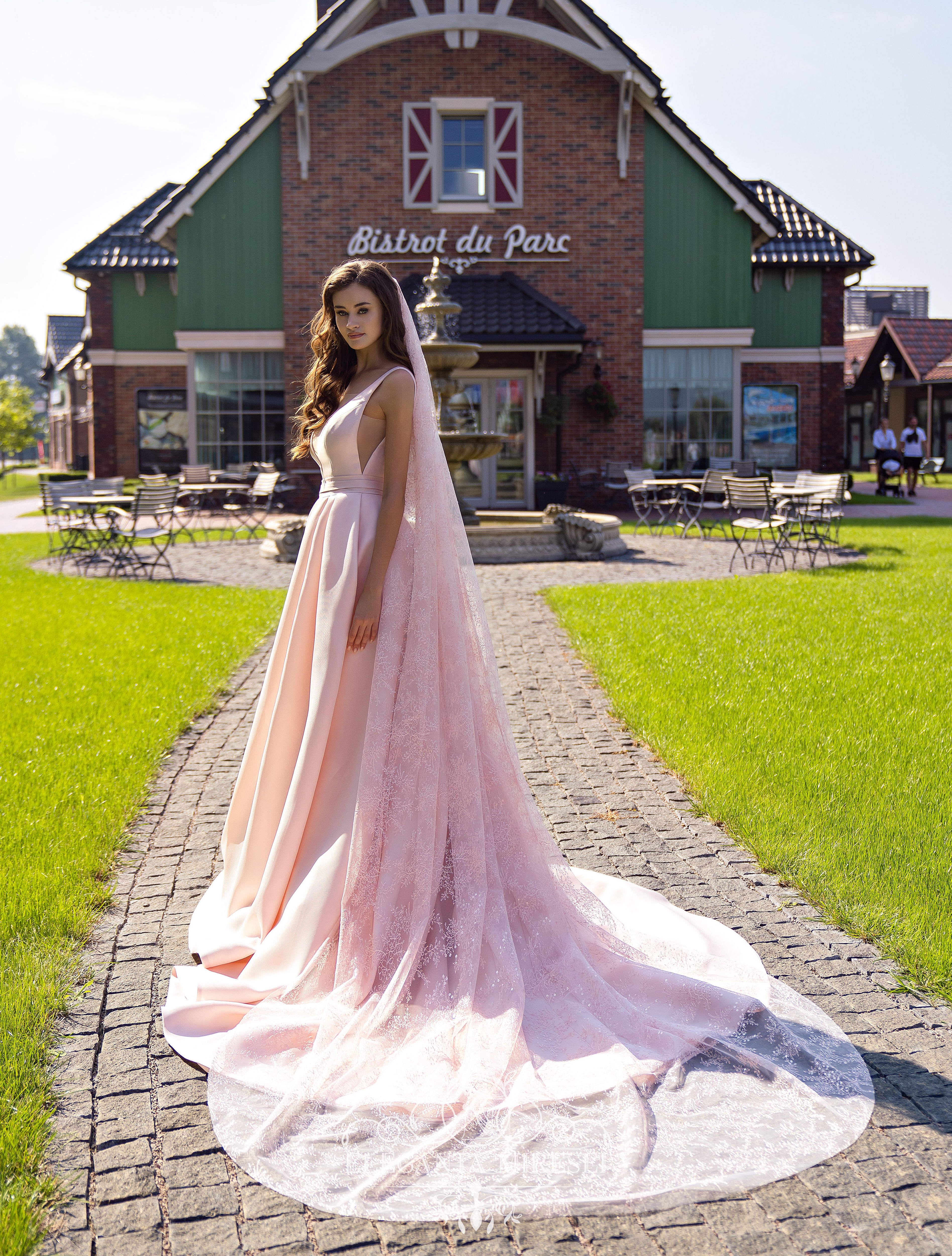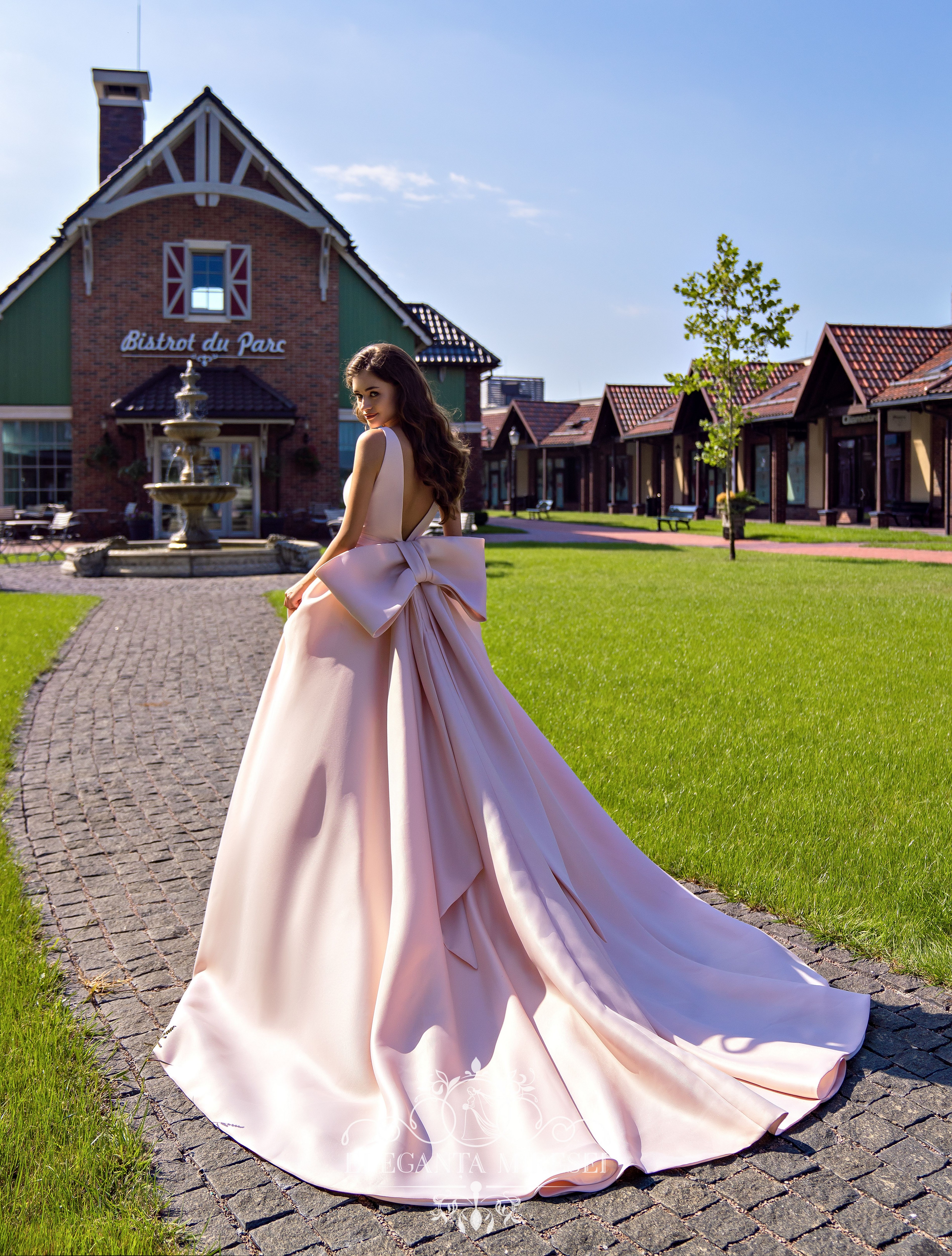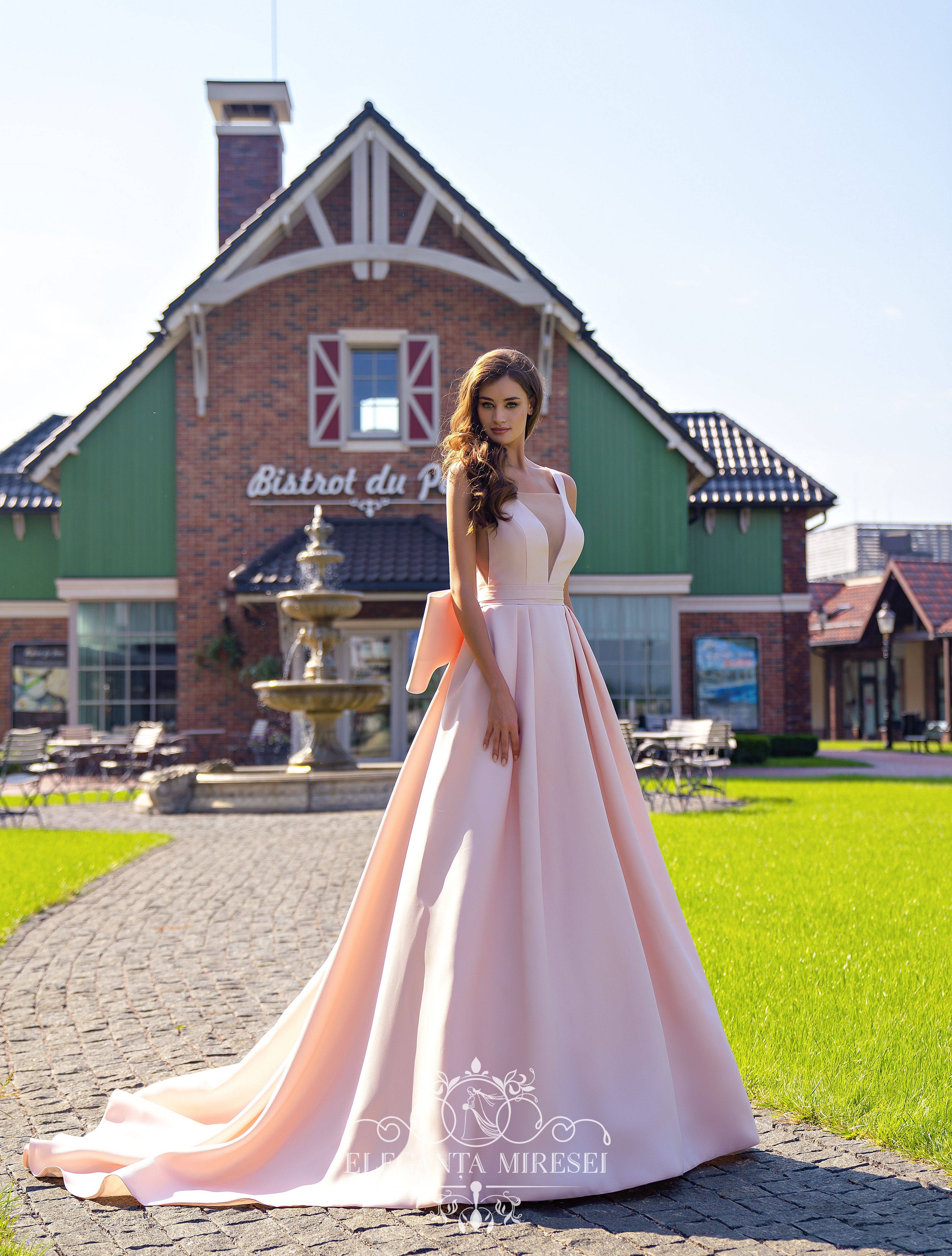 Rochie de mireasă originală pe curele cu fustă de tren. Fața și spatele rochiei sunt decorate cu un decolteu profund. Decorația principală a rochiei – un arc mare detașabil – oferă imaginii o rafinament și o fabulozitate deosebite.