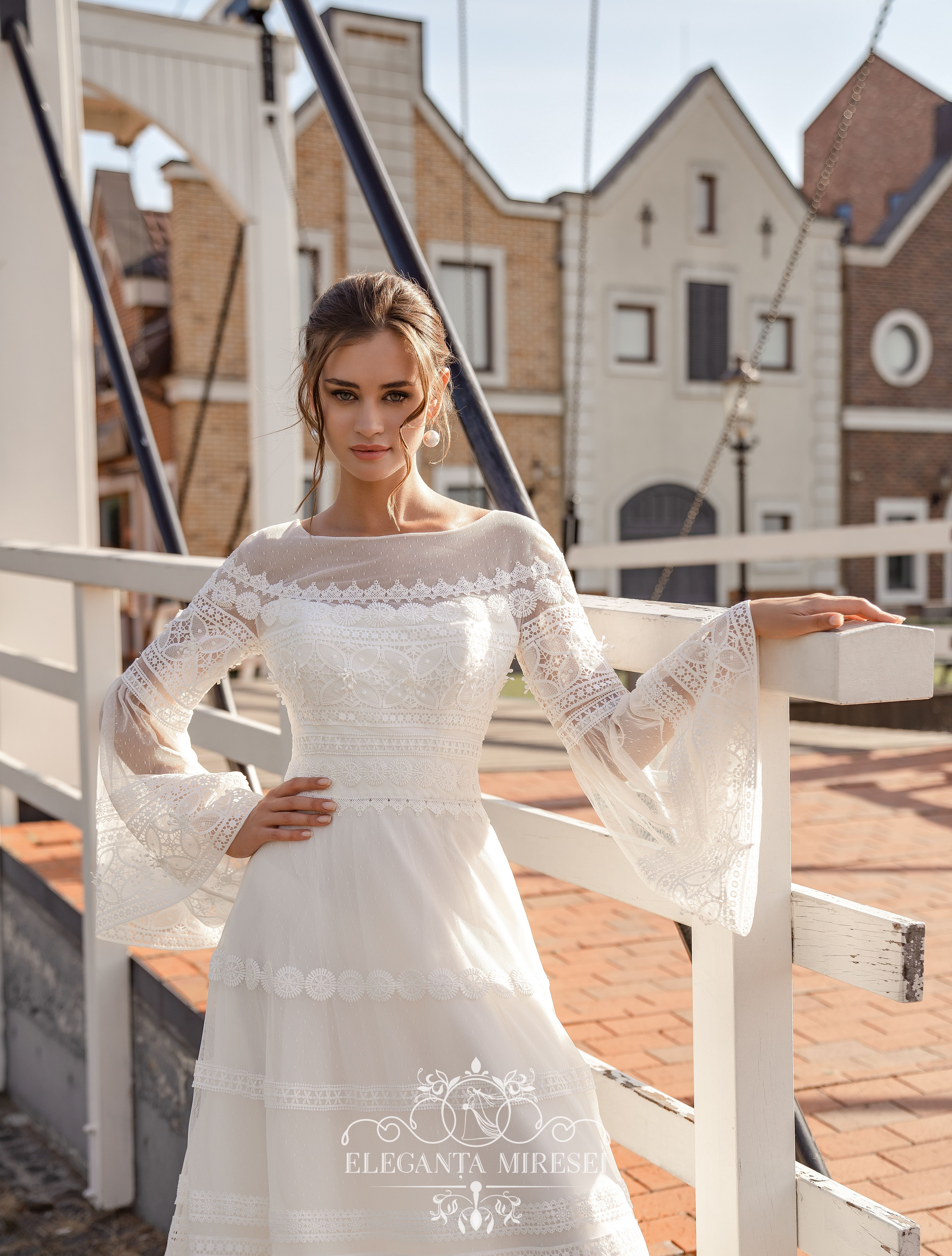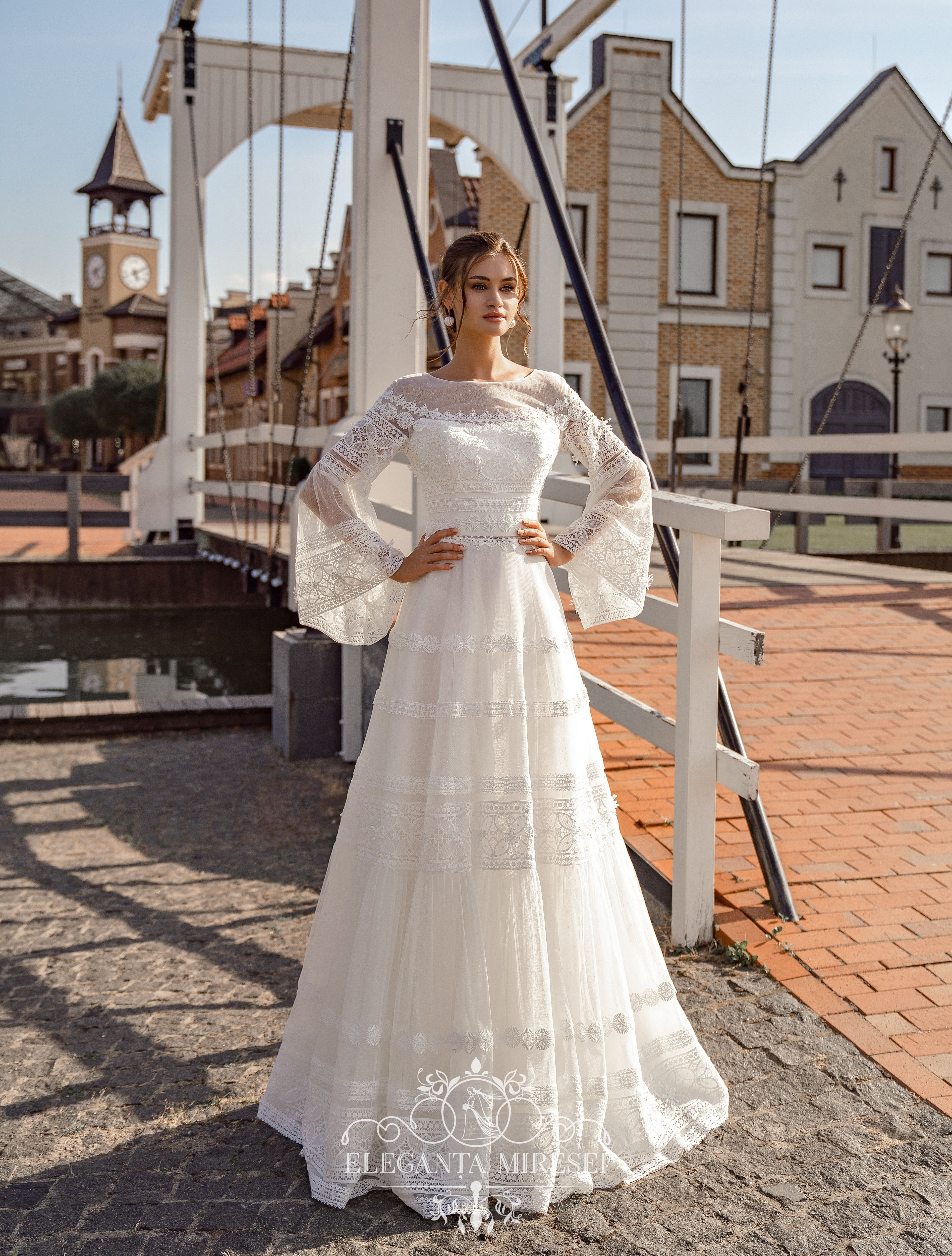 Wedding dress in free “boho” style with removable corset and soft skirt in ruffles. Original long bell sleeves make this look incredibly light. Removable corset inside the dress fixed with elastic for additional fixation. Model is decorated with five kinds of braid- macramé.