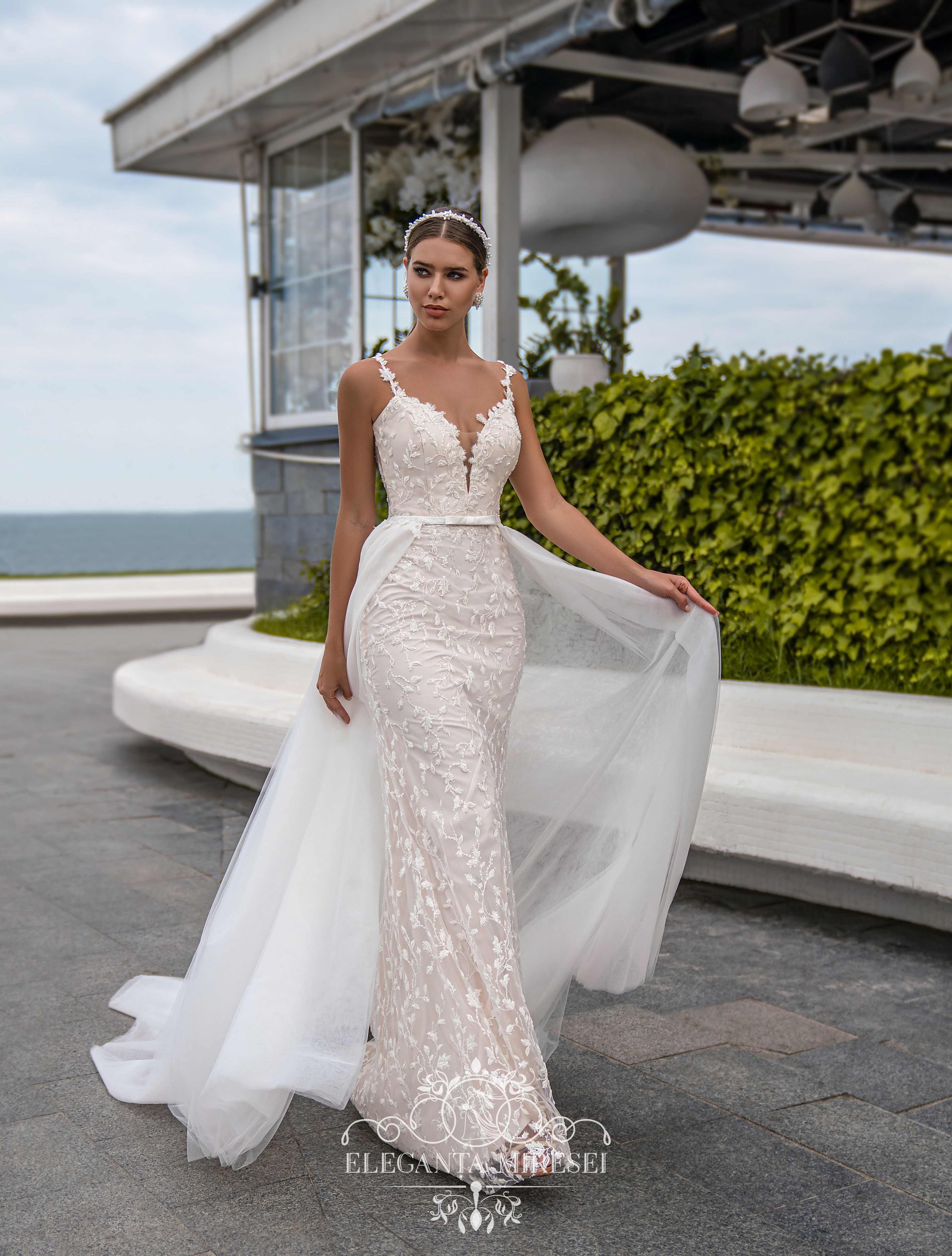 A magnificent wedding set, which consists of a dress with thin straps, with wings and a detachable train on the belt. The model is made of guipure, embroidered with beads and sequins, with nude lighting. The waist-length corset is decorated with a deep cut in the front. Light detachable train with a bow in the center. The model is decorated with guipure elements.