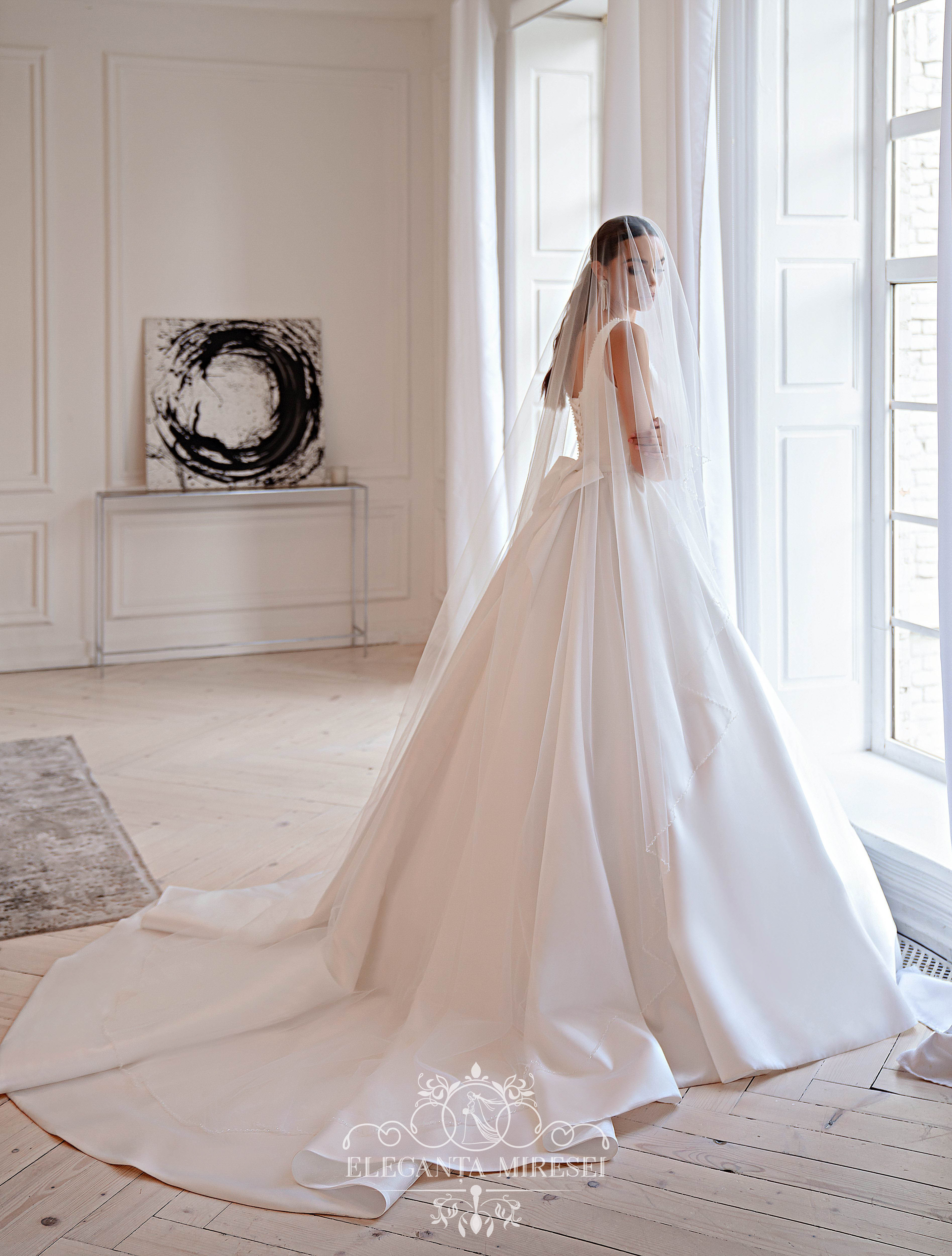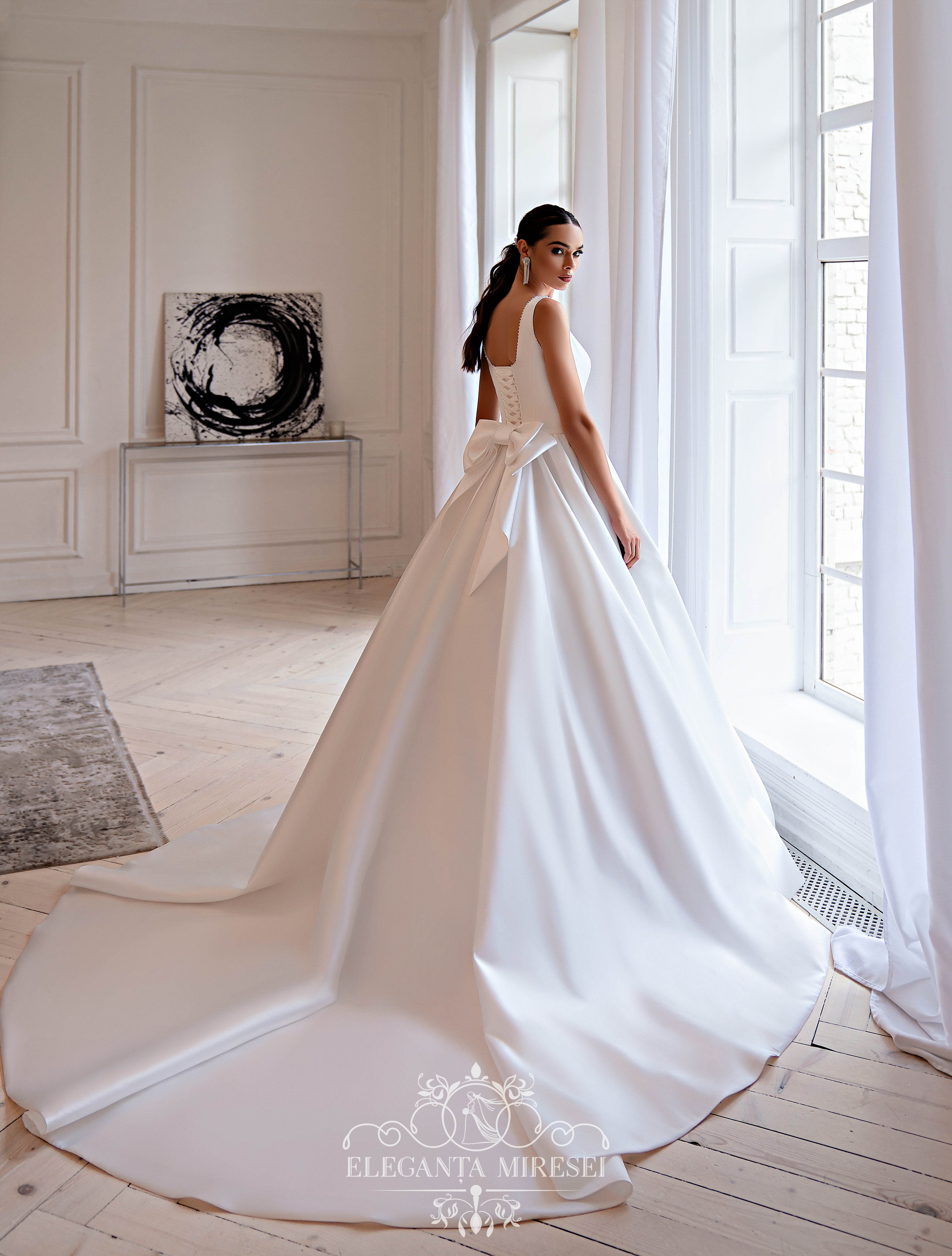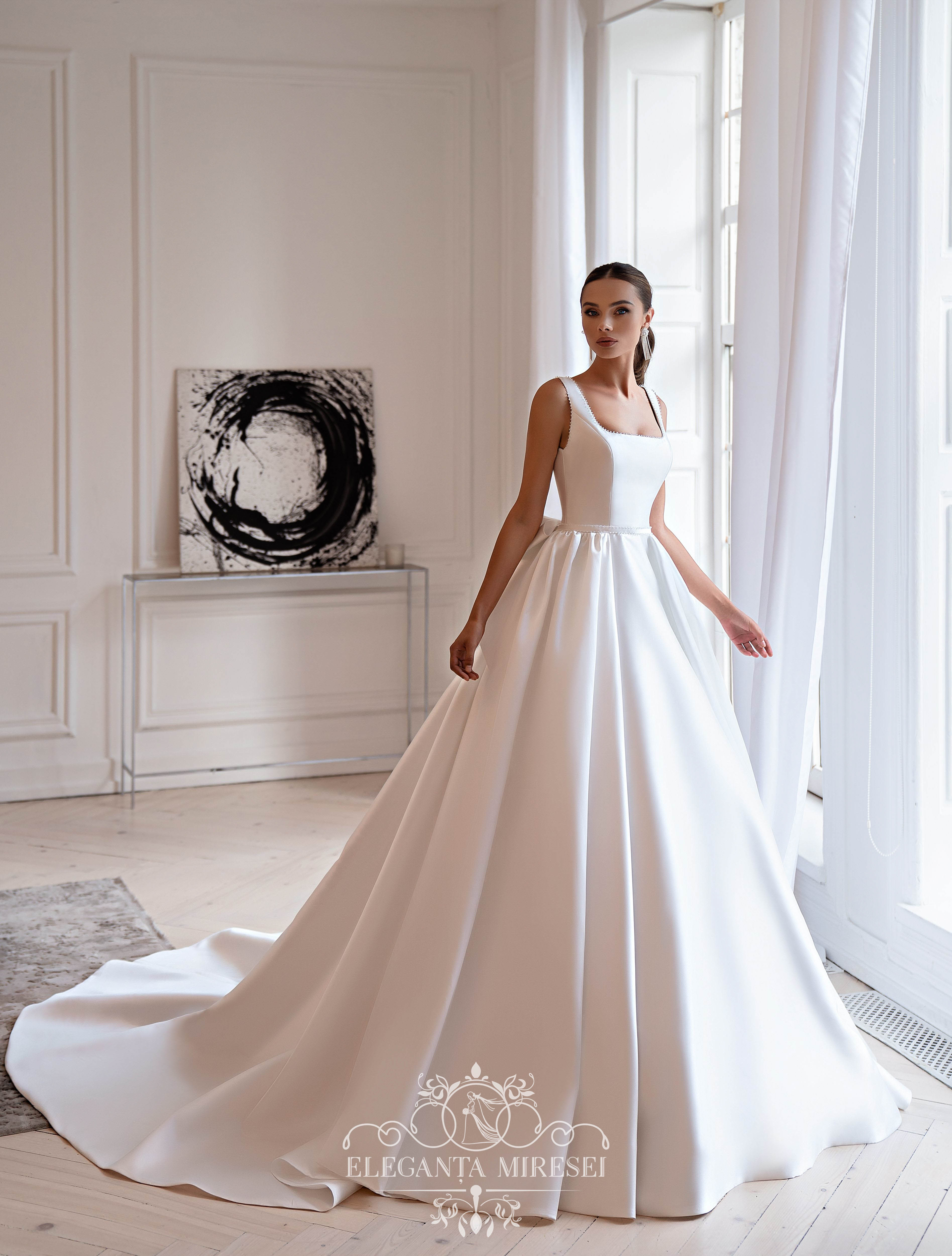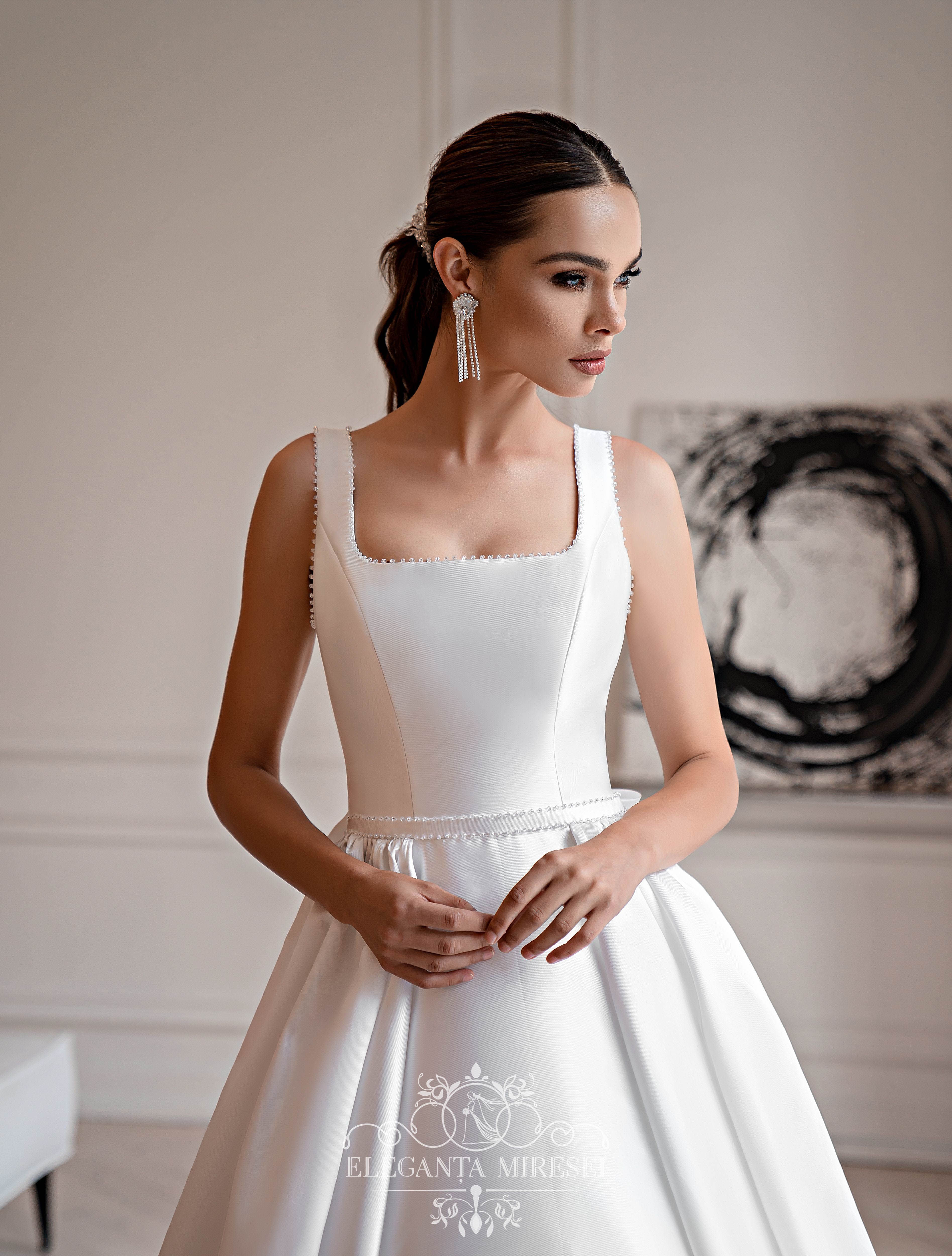 Rochie de mireasă minimalistă uimitoare. Modelul este realizat din țesătură Mikado de lux. Cu corset până la talie, cu o tăietură pătrată în față, este completat de o centură subțire care subliniază cu eleganță talia. Spatele cu șireturi este decorat cu o fundă dublă detașabilă. Rochia este cusută cu abilitate cu cristale de-a lungul taliei si decolteului.