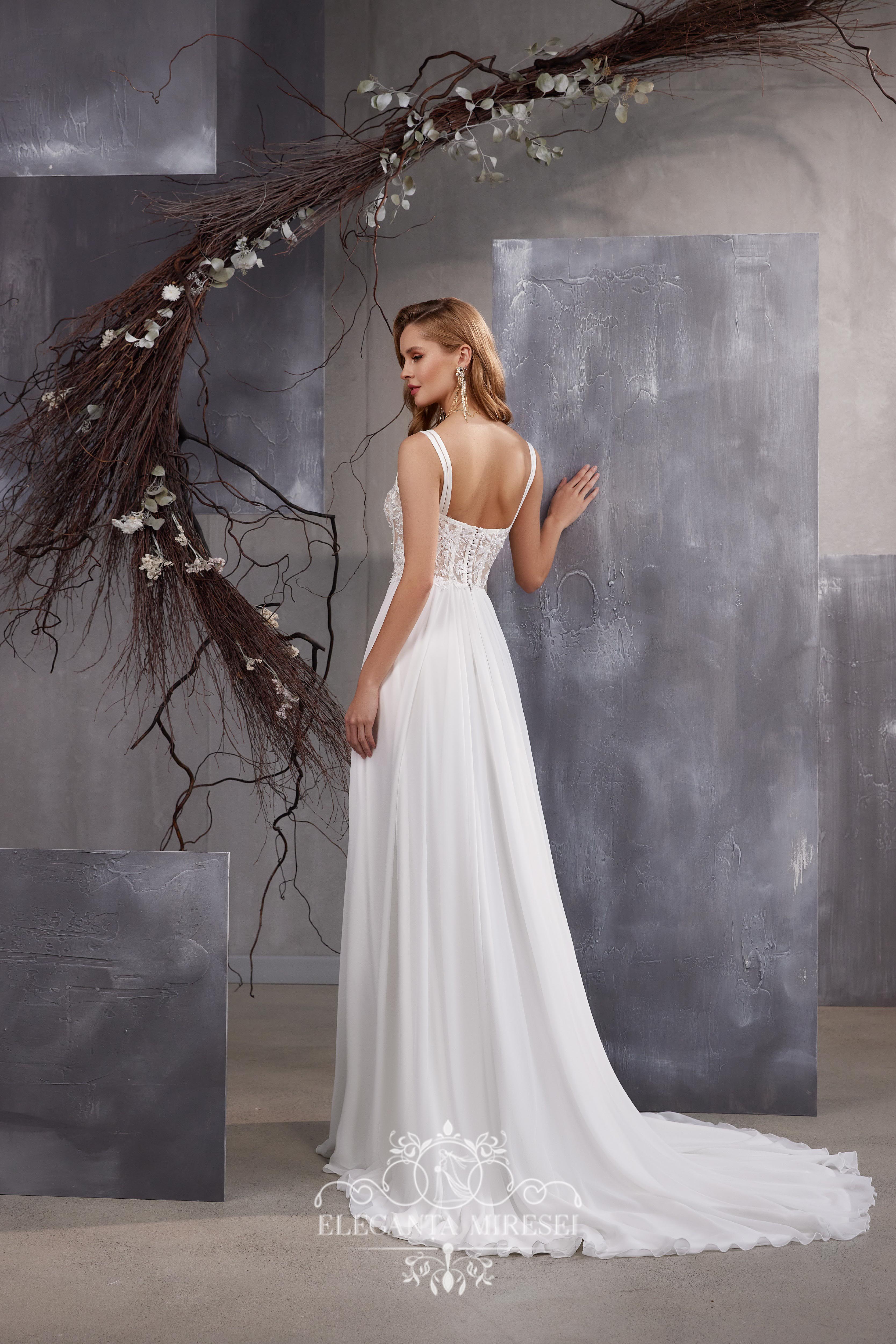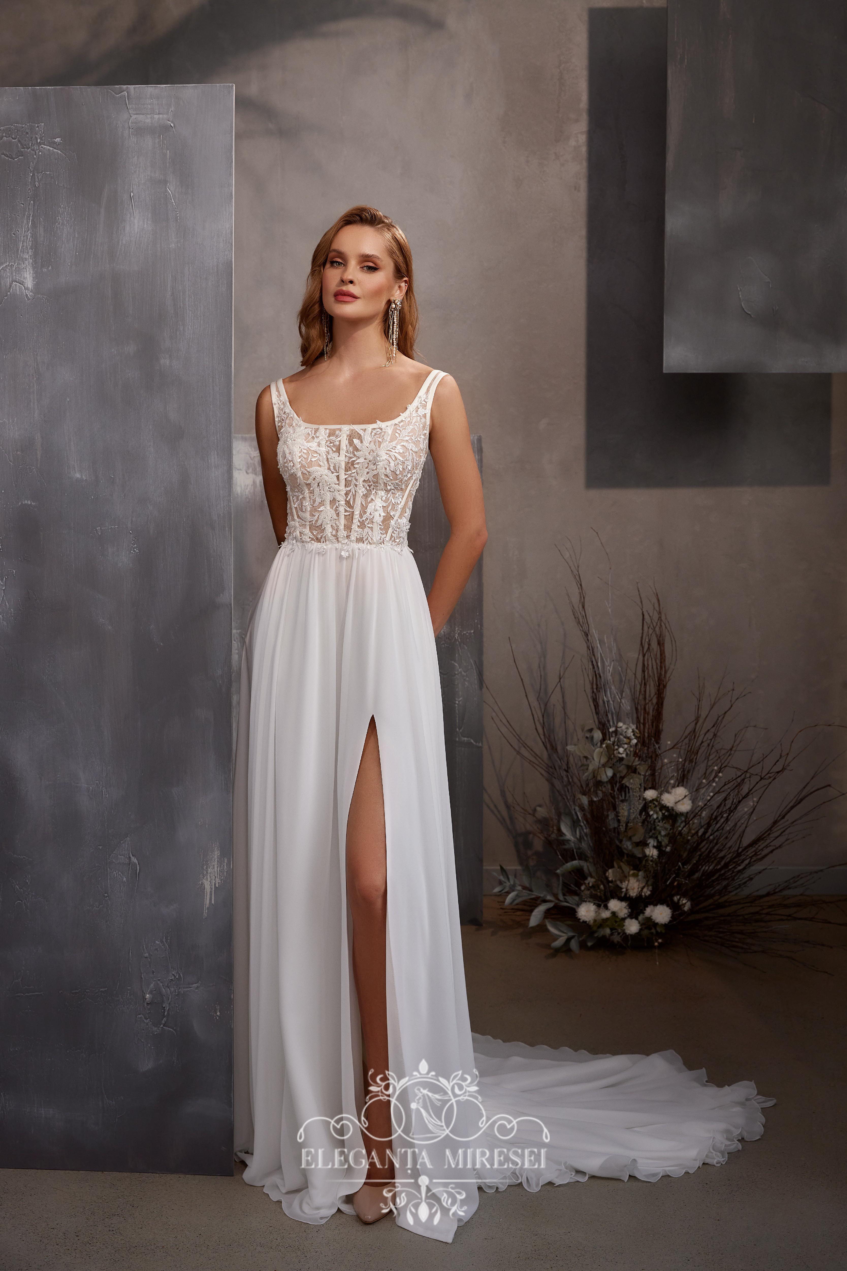 Designer wedding dress with shoulder straps and a soft, flowing chiffon skirt with a long train. Transparent corset to the waist, covered with a Chantelier, made with a square neckline in front, stitched in a designer way with a tunnel braid, creating an emphasis on the elegance of the waist. The back is fastened with a line of handmade buttons. On the left leg, the skirt is decorated with a seductive slit, giving the model spice. In this dress from the Supernova brand, the bride will look feminine and modern. The dress is decorated with magnificent guipure embroidered with beads, sequins, pearls and crystal.