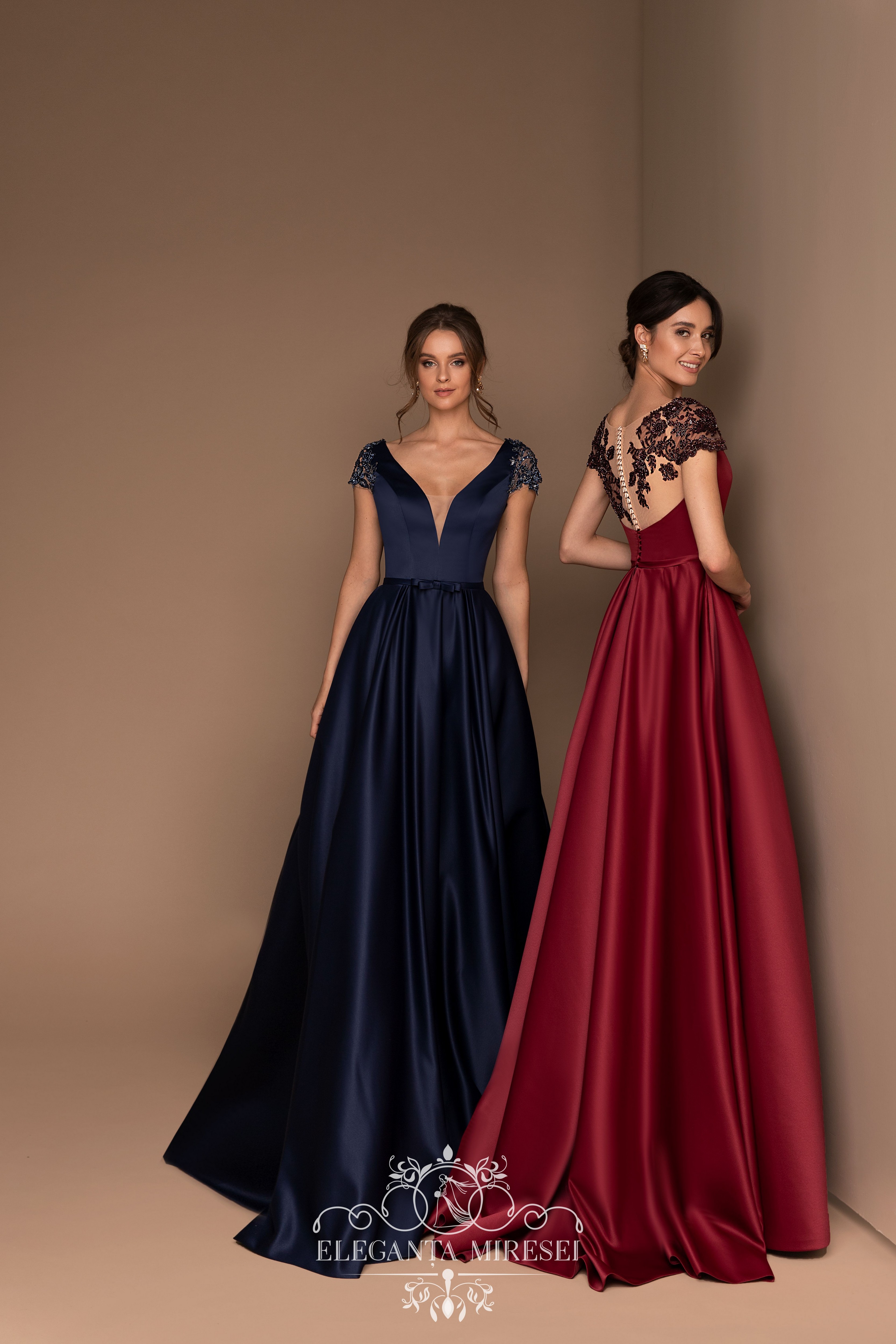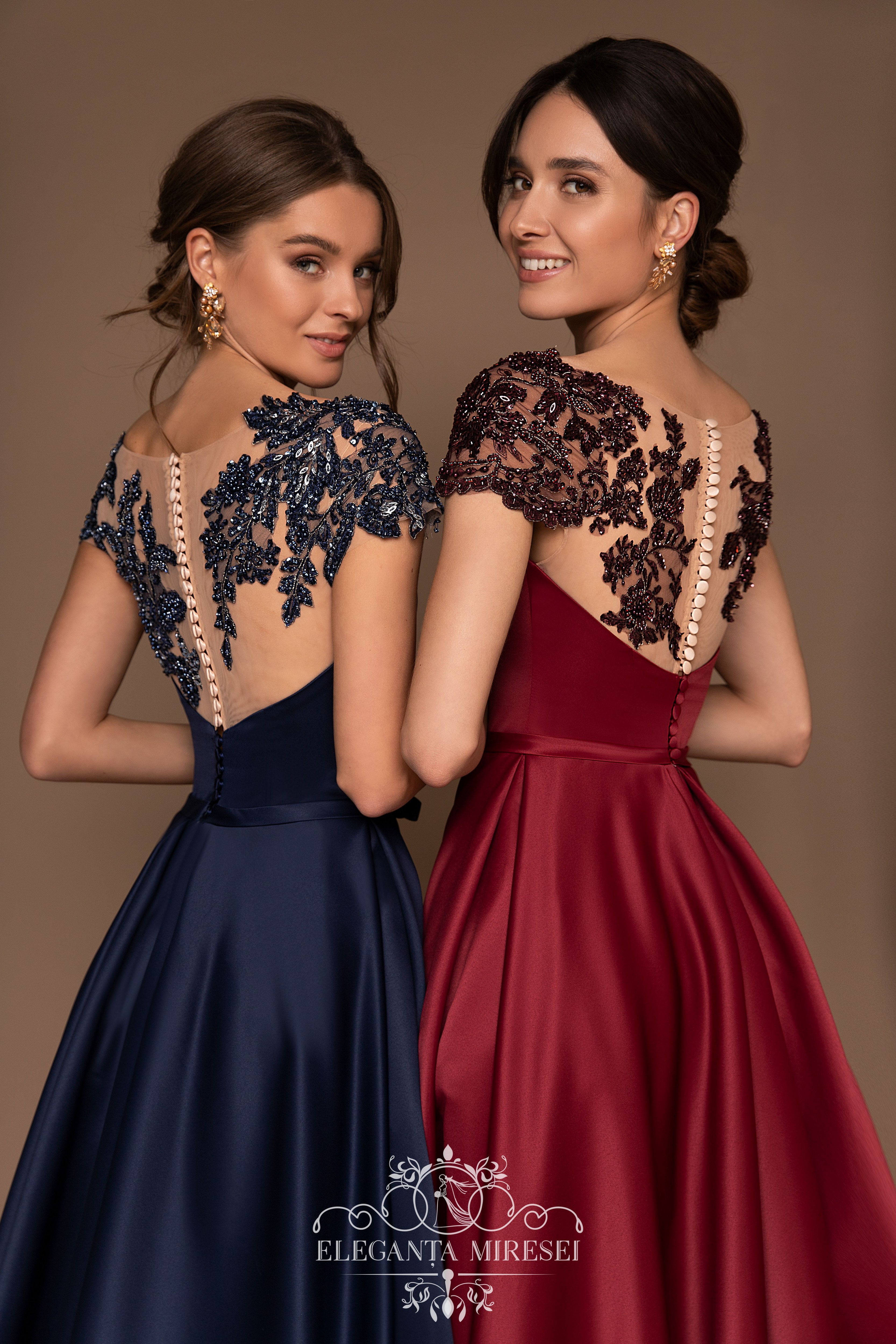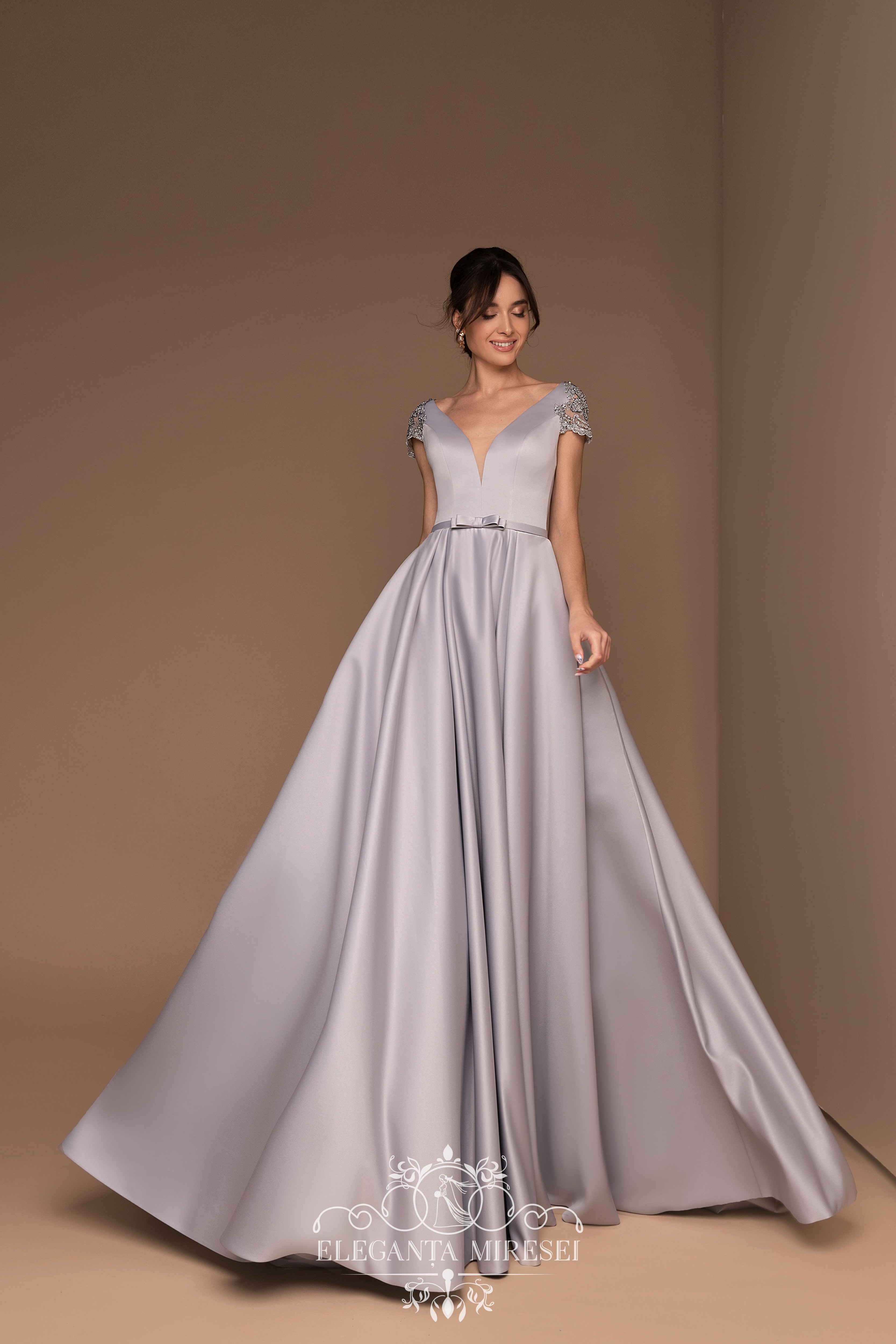 O rochie de seară elegantă din satin regal, cu fustă de tren. Un corset pe față este decorat cu un decolteu profund cret. Mânecele aripioare originale și spatele sunt decorate cu guipure brodate cu margele, perle și paiete. Fusta cu buzunare în cusăturile laterale. Imaginea este completată de o centură cu un arc dublu, subliniind talia.