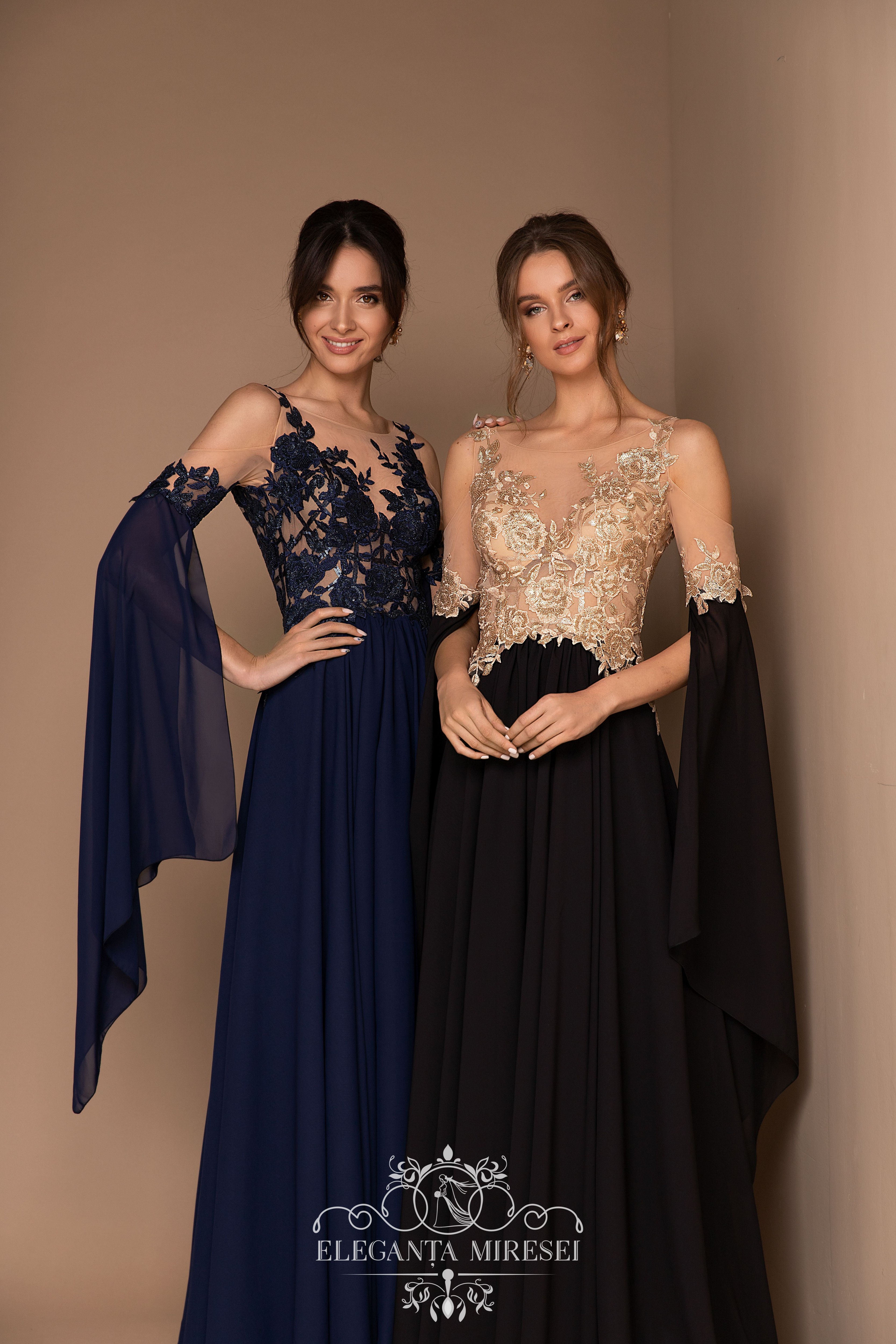 Rochie de seară spectaculoasă, cu corset translucid și fustă de șifon. Spatele este decorat cu un decolteu figurat. Mânecile lungi din șifon cu fante înalte sunt o adevărată decorare a acestei ținute. Modelul este decorat cu elemente de guipure din paiete.