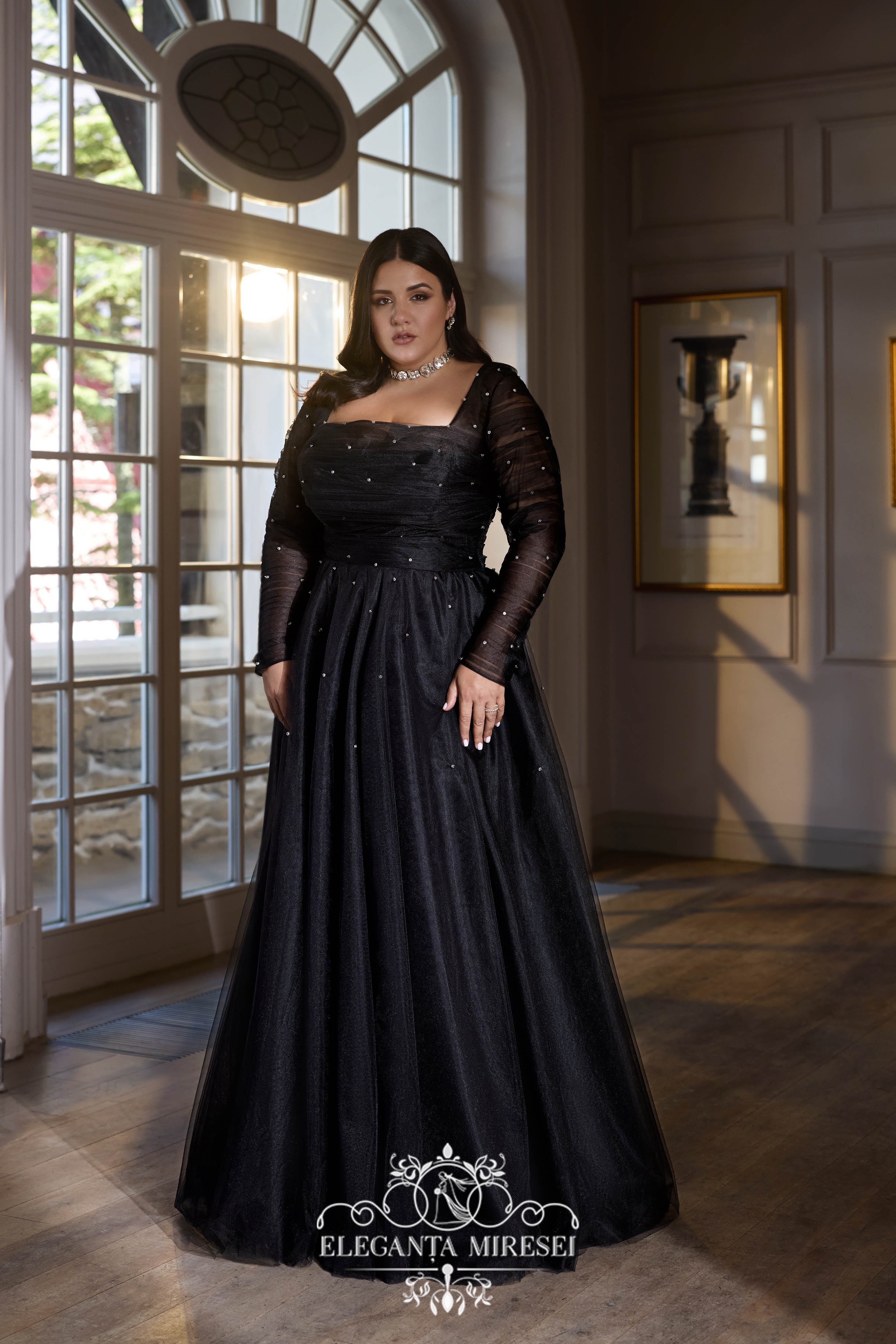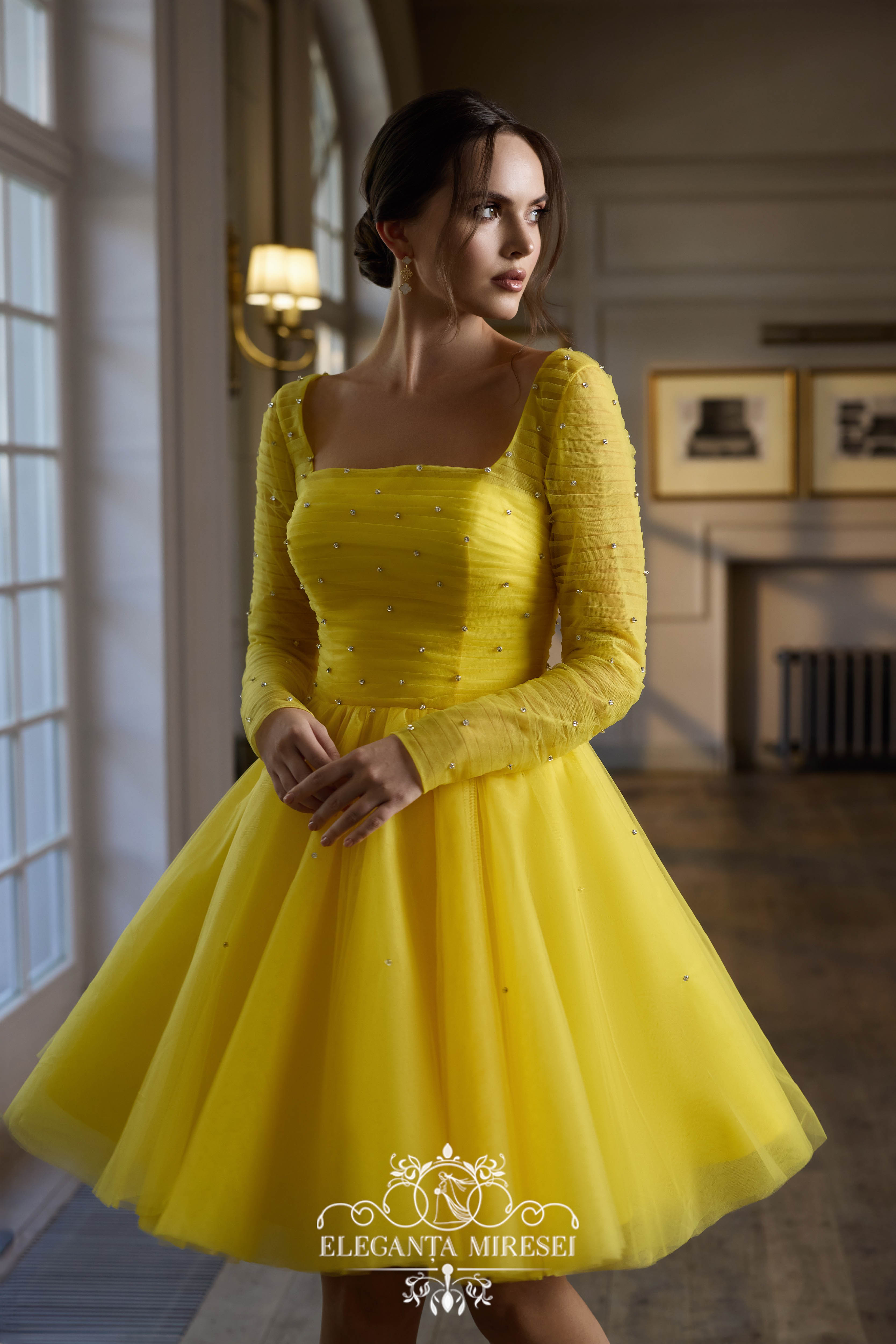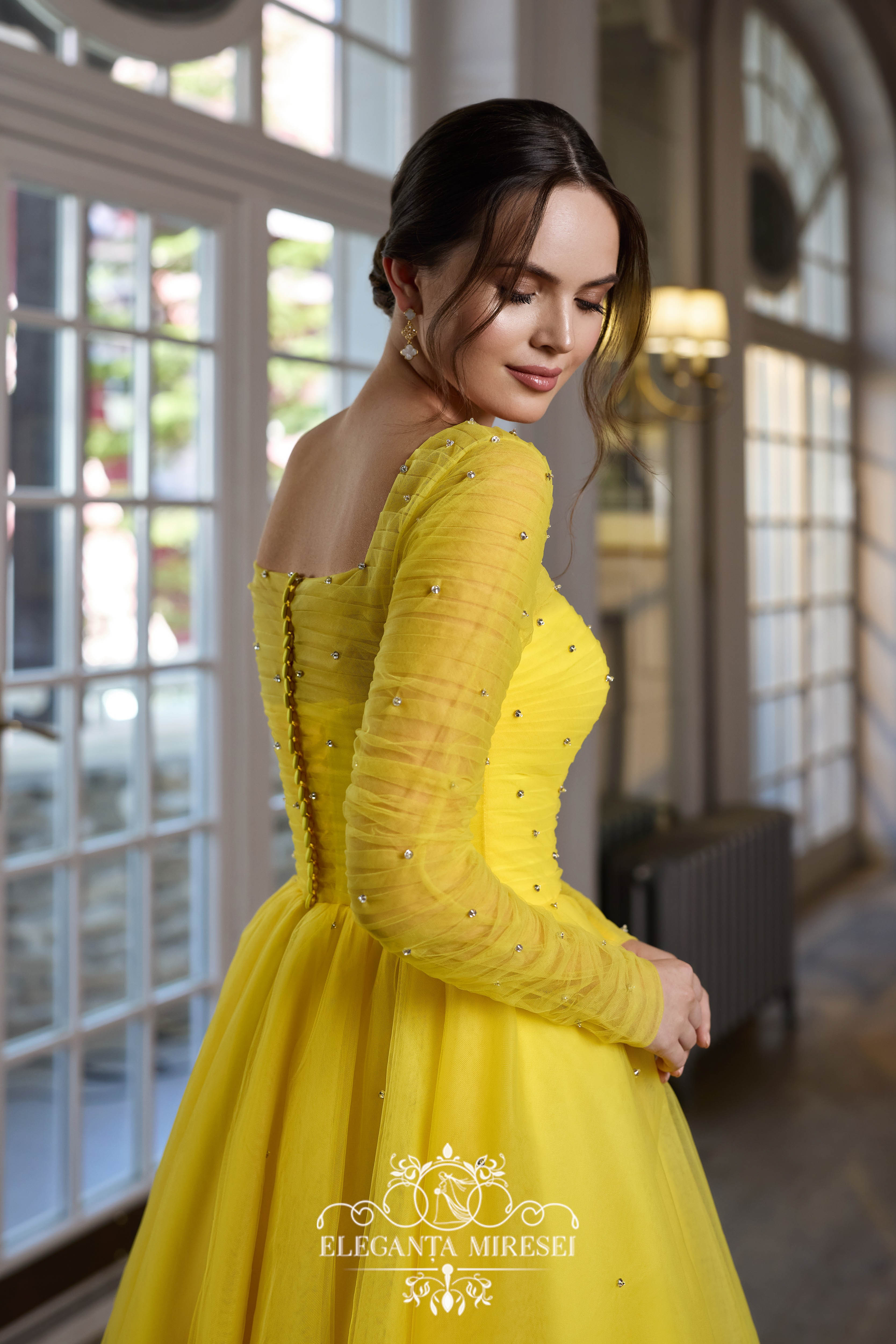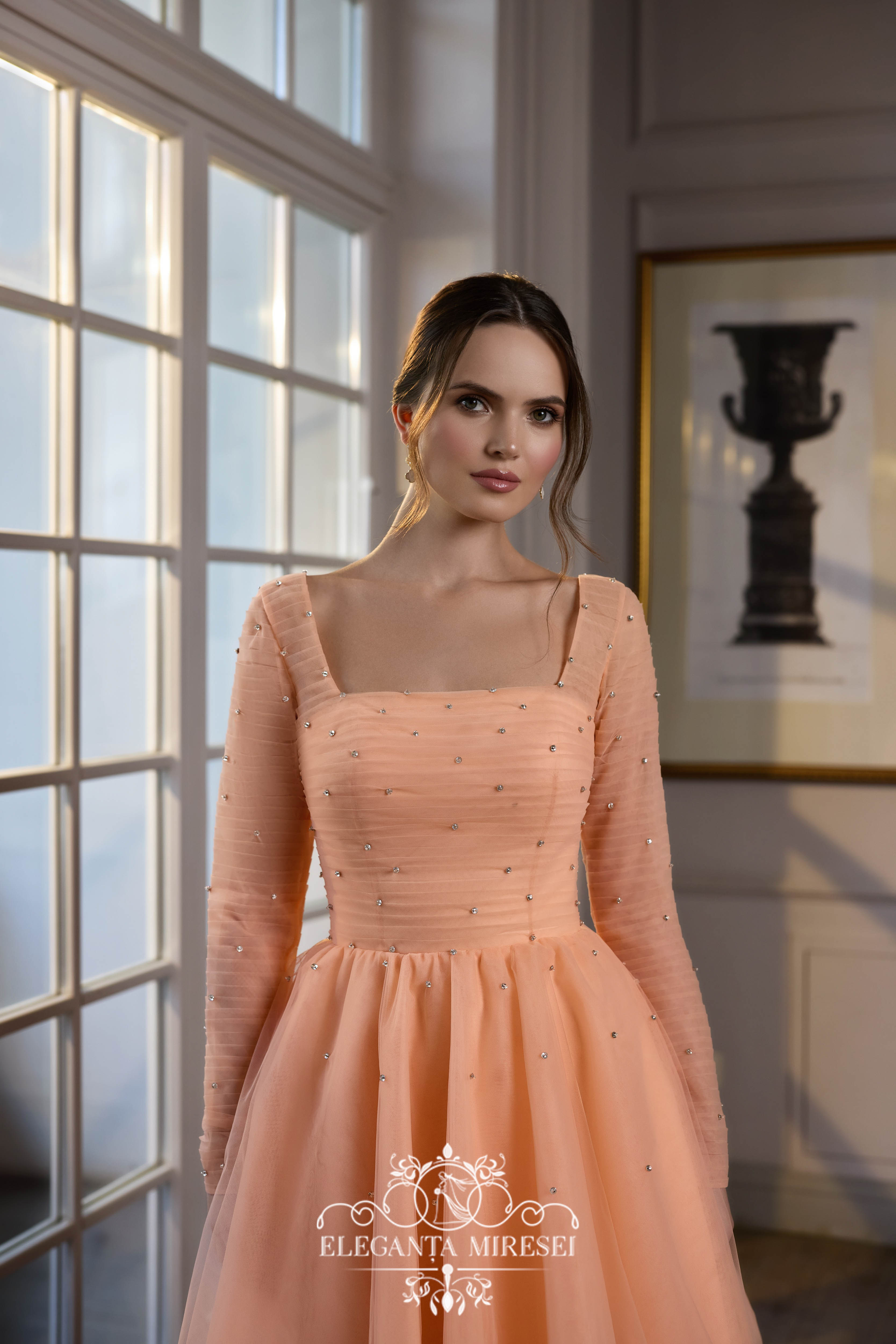 This incredible evening dress impresses with its tenderness and grace. The long sleeves add sophistication to the look, and the fluffy skirt, both long and short, creates a romantic silhouette that emphasizes femininity. The waist-length bodice with a square neckline at the front and back accentuates the neck and décolletage, while the fine drapery adds volume and elegance. Buttoned sleeves complete the look, and a buttoned back with internal lacing ensures a perfect fit and comfort. The model is embroidered with luxurious stones that play in the light, giving the dress a radiant glow. This dress is the perfect choice for special moments when you want to look incredible and feel like the queen of the evening.